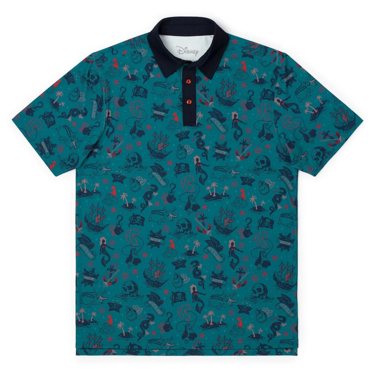The Hook'd All-Day Polo ($70) features Captain Hook, Mr. Smee, and Tick-Tock the Crocodile, in a print of pirate tattoos and other pirate icons.