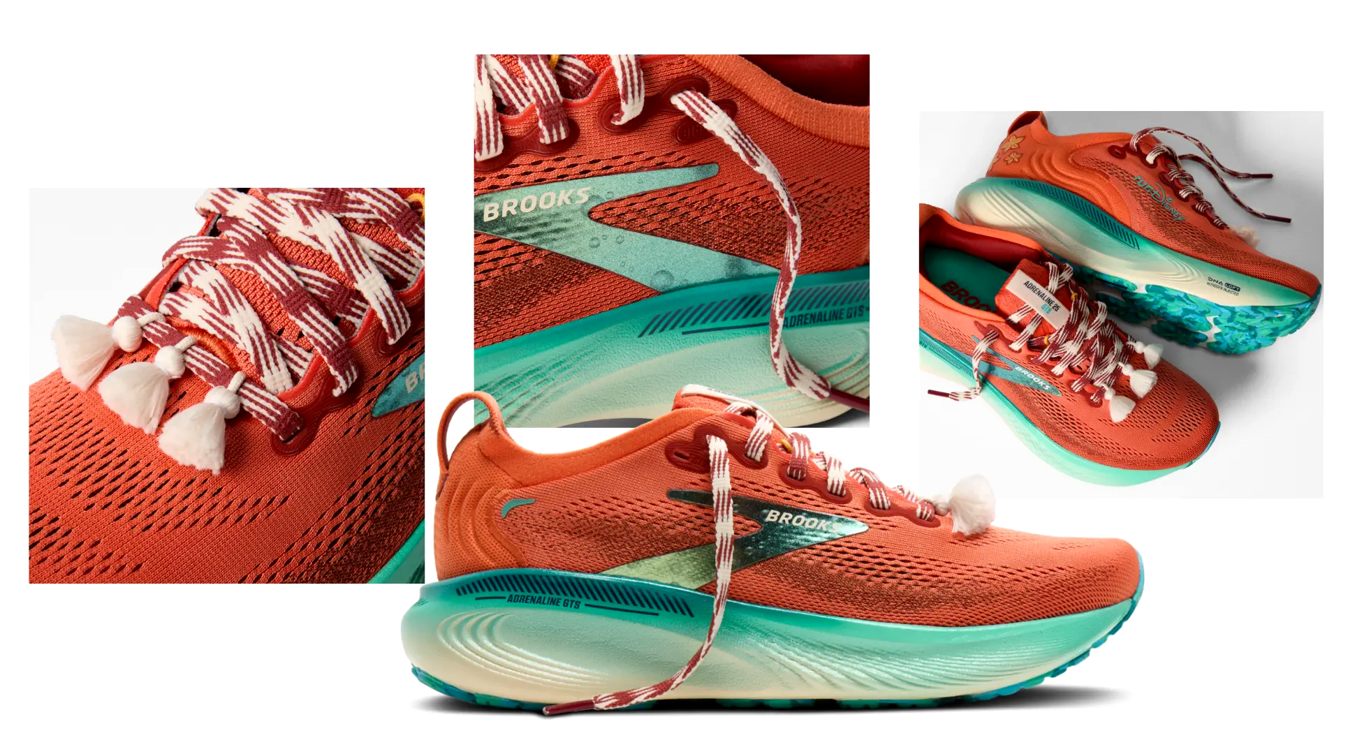 The special-edition Adrenaline GTS 25 features design elements inspired by Moana and ocean themes. The midsole includes an oceanic gradient and a water-inspired graphic along the outsole. The tongue and inner lining feature lace tassel details referencing elements of her dress.