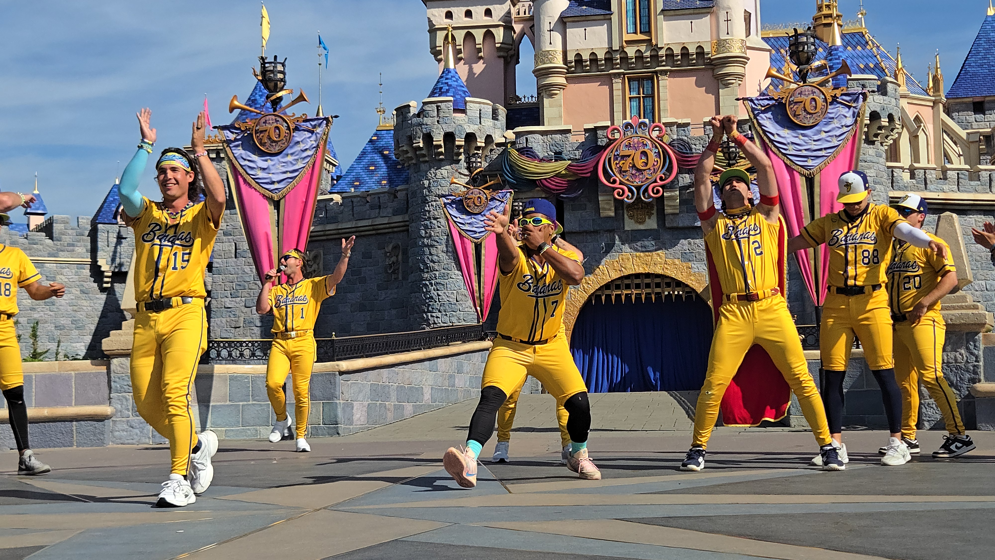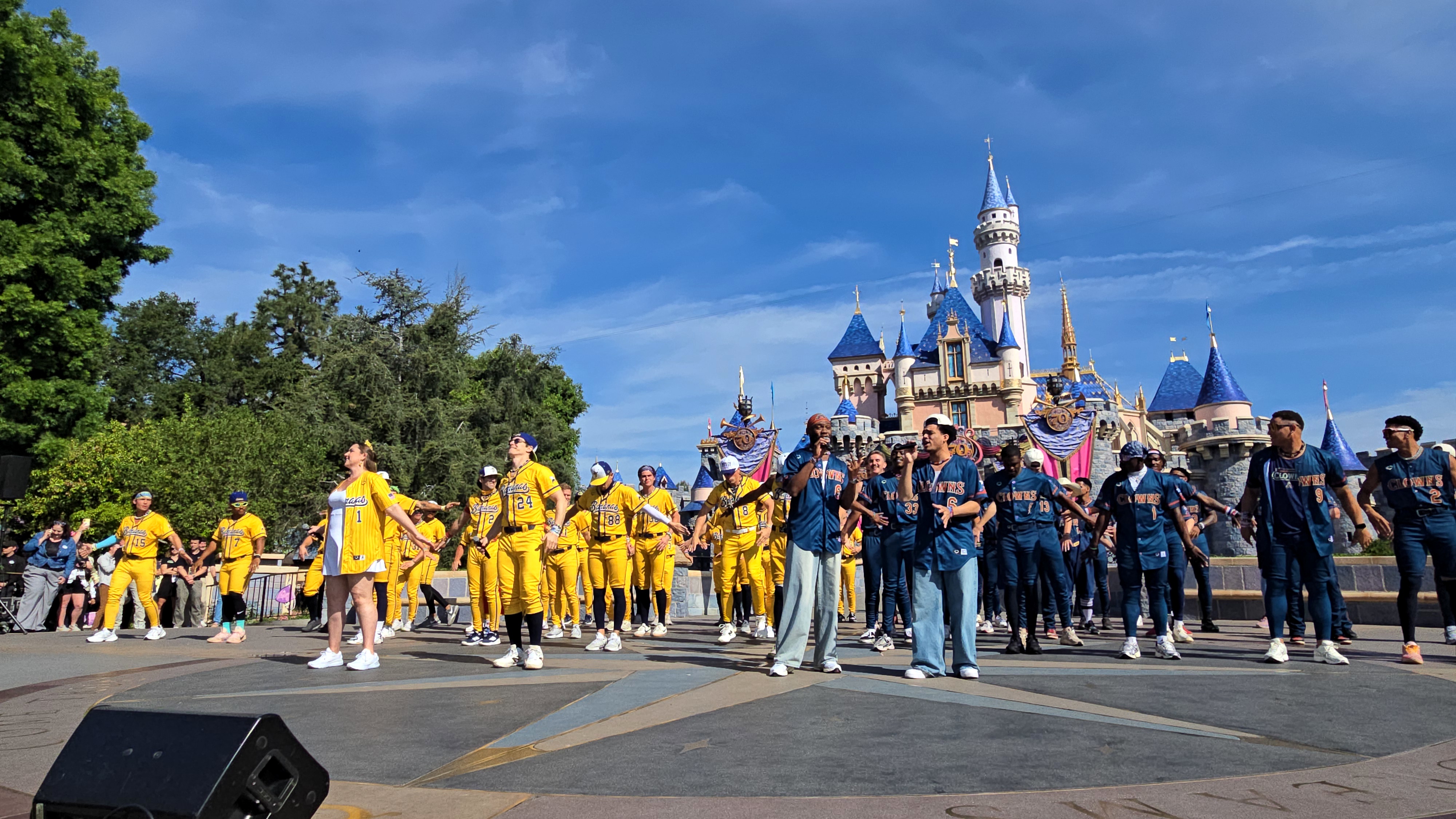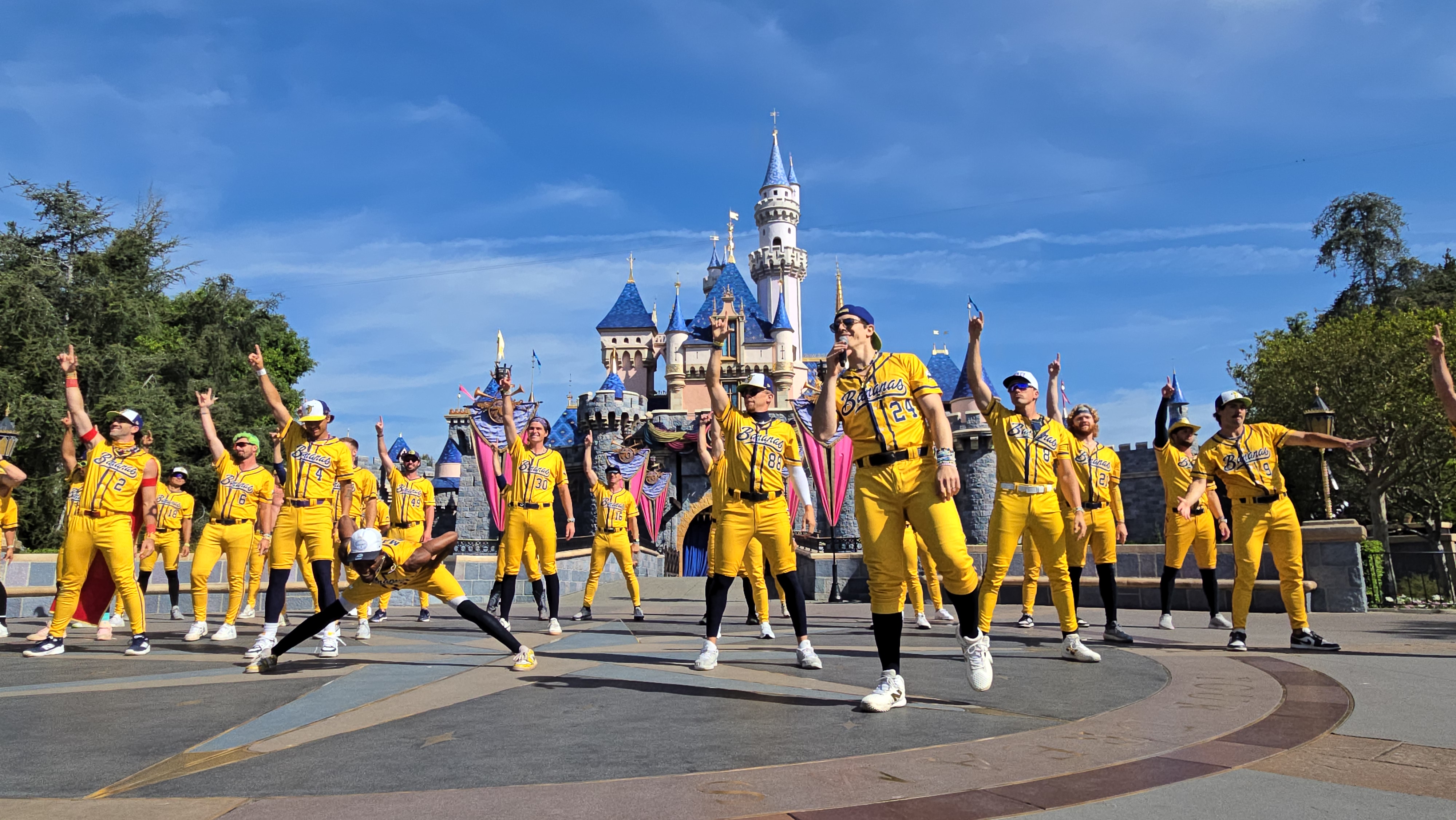 The festivities kicked off with the Savannah Bananas’ signature "Hey Baby" performance in front of Sleeping Beauty Castle. The moment also featured a few words from Jesse Cole, the creator of Banana Ball, who showed up in his trademark yellow suit alongside Mickey and friends.