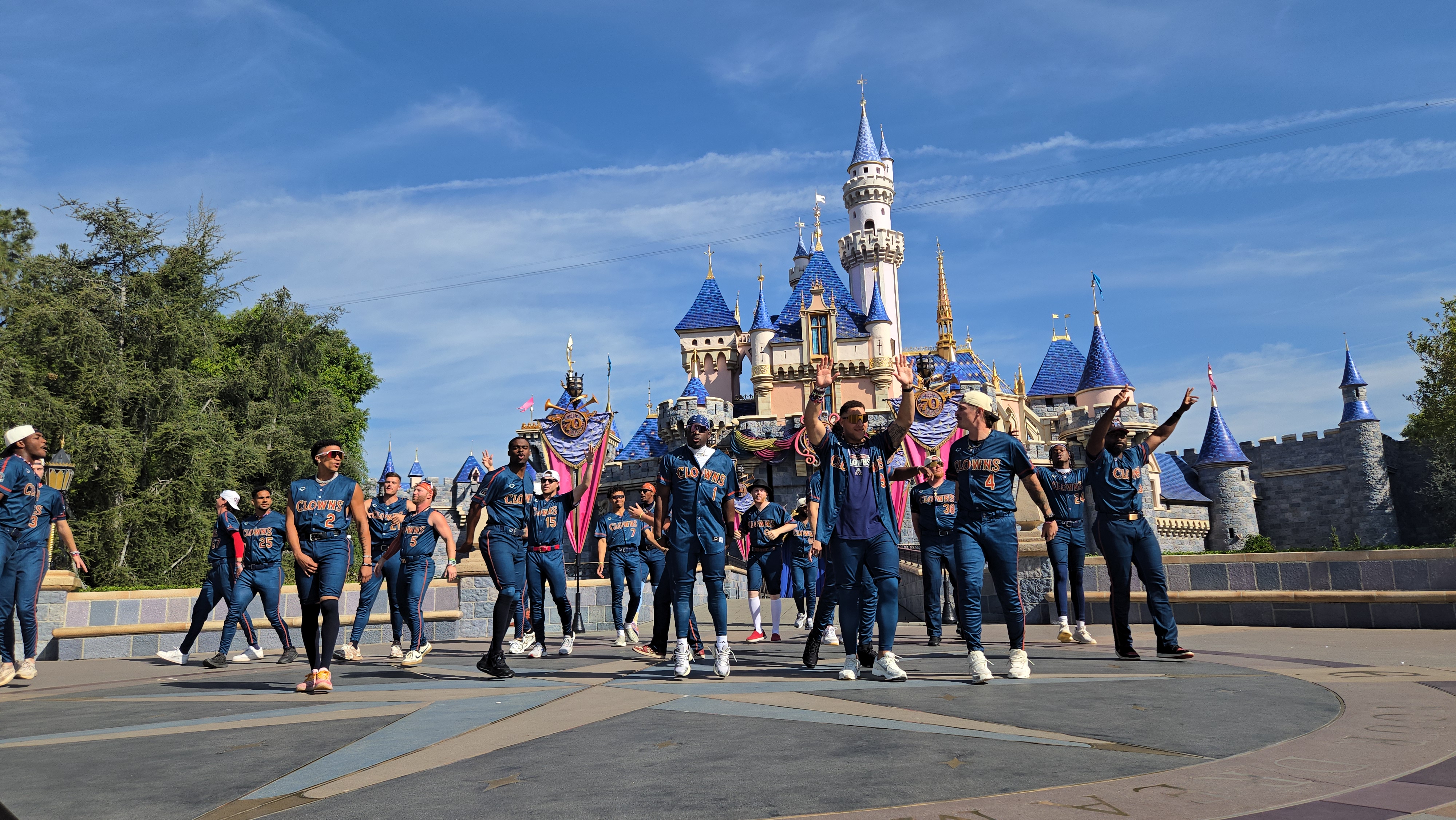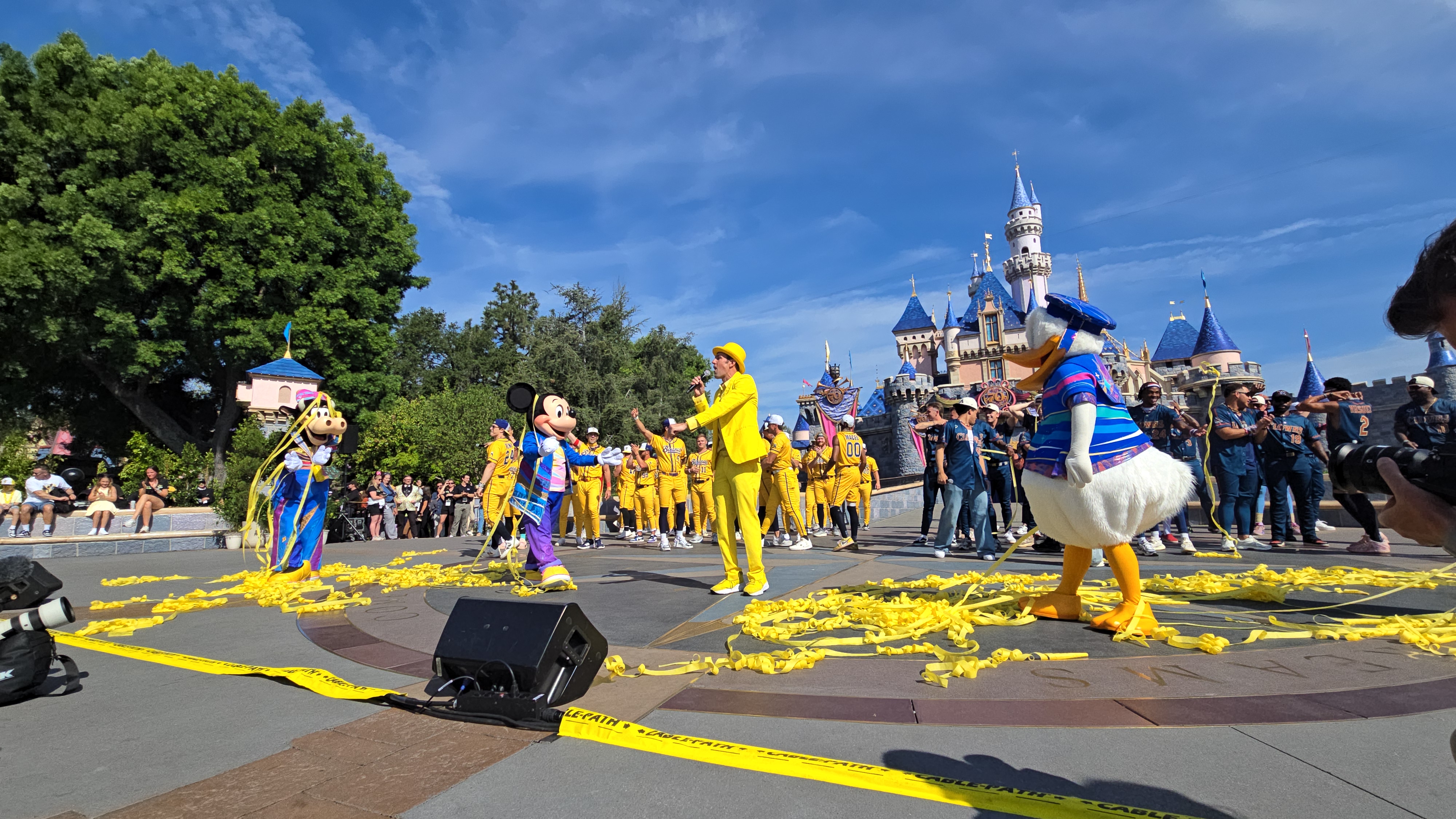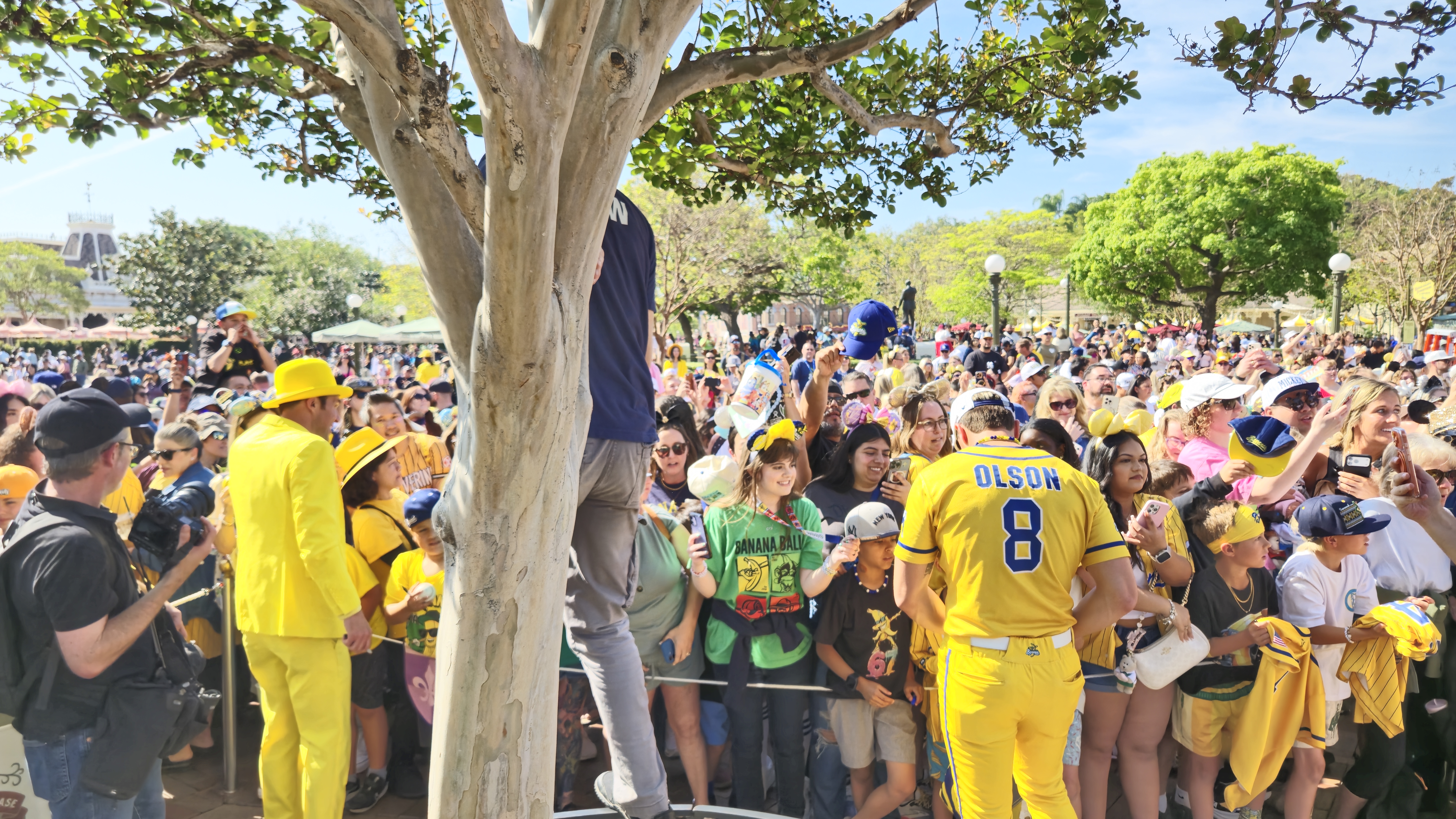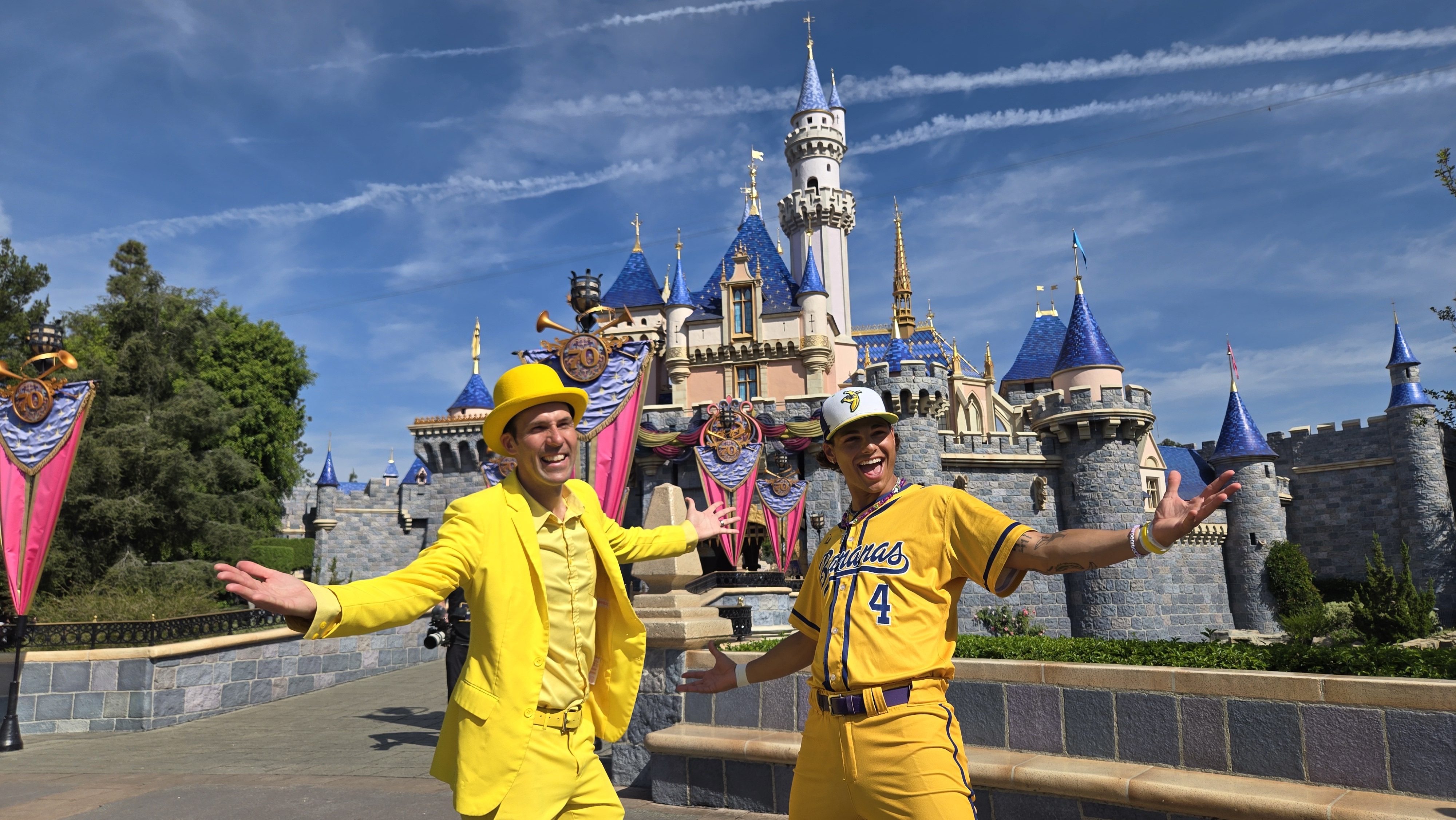 The festivities kicked off with the Savannah Bananas’ signature "Hey Baby" performance in front of Sleeping Beauty Castle. The moment also featured a few words from Jesse Cole, the creator of Banana Ball, who showed up in his trademark yellow suit alongside Mickey and friends.
