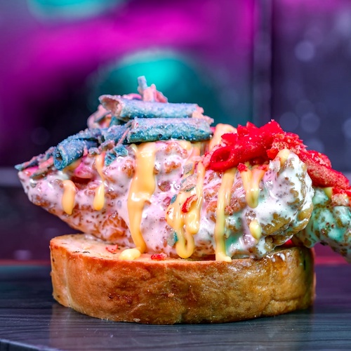 - Loaded Tatooine Toast at Stage Door Café: Texas-style garlic toast topped with buffalo ranch chicken tenders and cheese sauce garnished with spicy blue and red rolled tortilla chips (New)