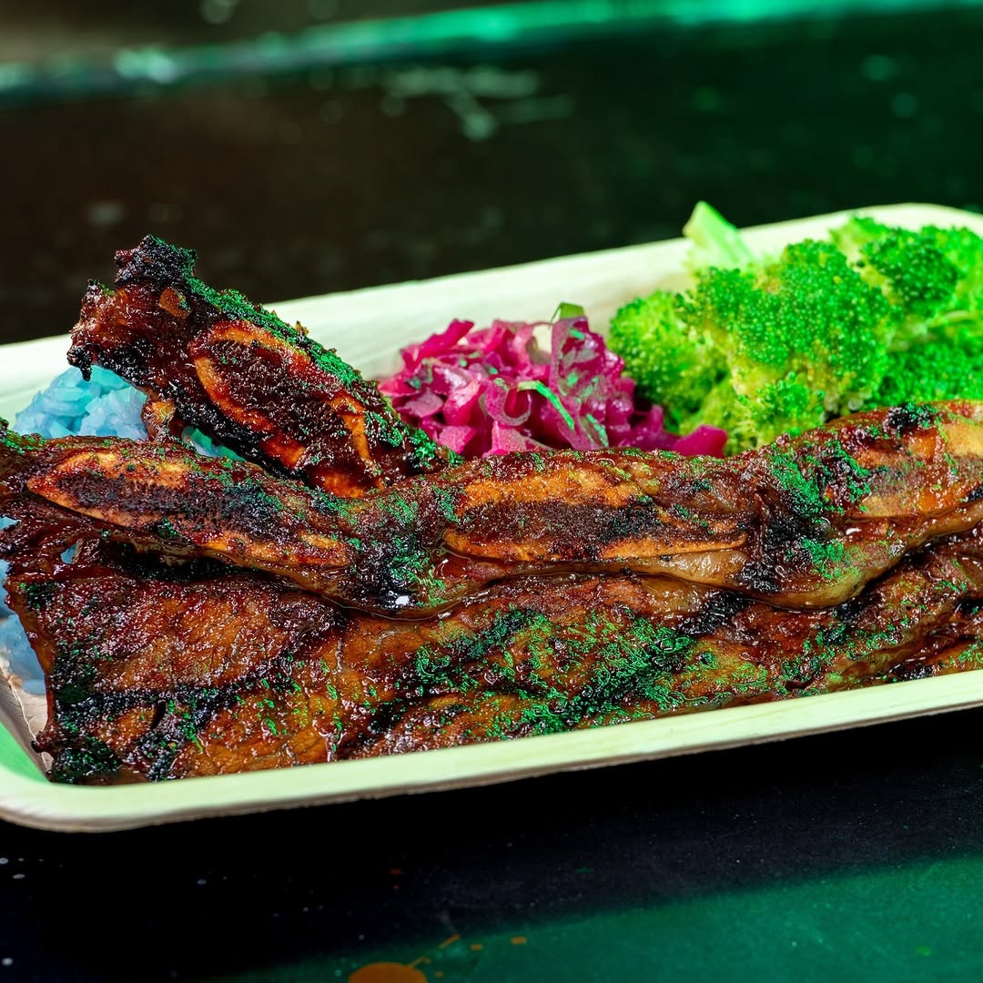 - Honey-Chipotle-glazed Kalbi Ribs at Bengal Barbecue: Steamed broccoli, purple cabbage, and blue rice (New)