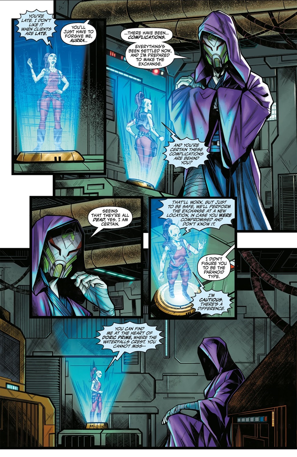 Hyperspace Stories - The Bad Batch: Ghost Agents #1 begins with a hologram call between bounty hunter Aurra Sing and her mysterious hooded client, who informs her about the complications they faced across the two previous issues. Sing chastises this mystery person and then sets up a new meeting place, but little do they both know that Hunter has stowed away aboard this ship and is listening in on the conversation. He reports back to the other members of Clone Force 99, and they decide to rendezvous at the planet Doric Prime, the planet where the exchange is set to take place.