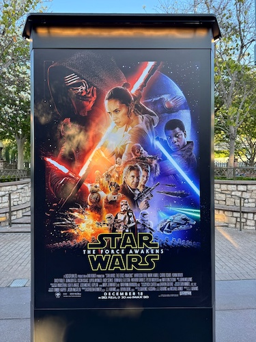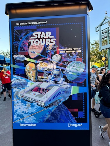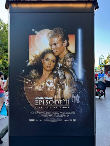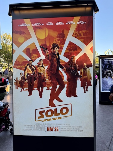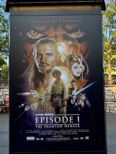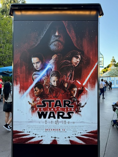 Stepping back out into Disneyland towards the Fantasyland Theatre, the “it’s a small world" mall has been decorated in Star Wars posters, reminding fans that no matter where you are in the park tonight, the force will always be with you. Posters of all the mainline movies are represented in the display, as well as spinoff films like Solo and Rogue One. For Disney Parks fans, you’ll even find the original Star Tours poster.