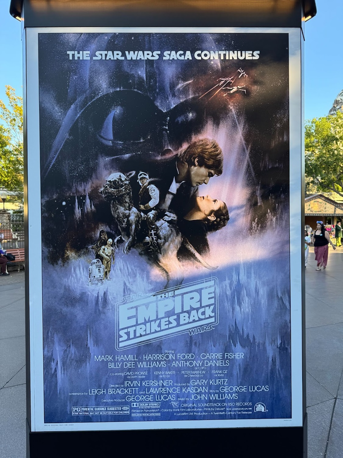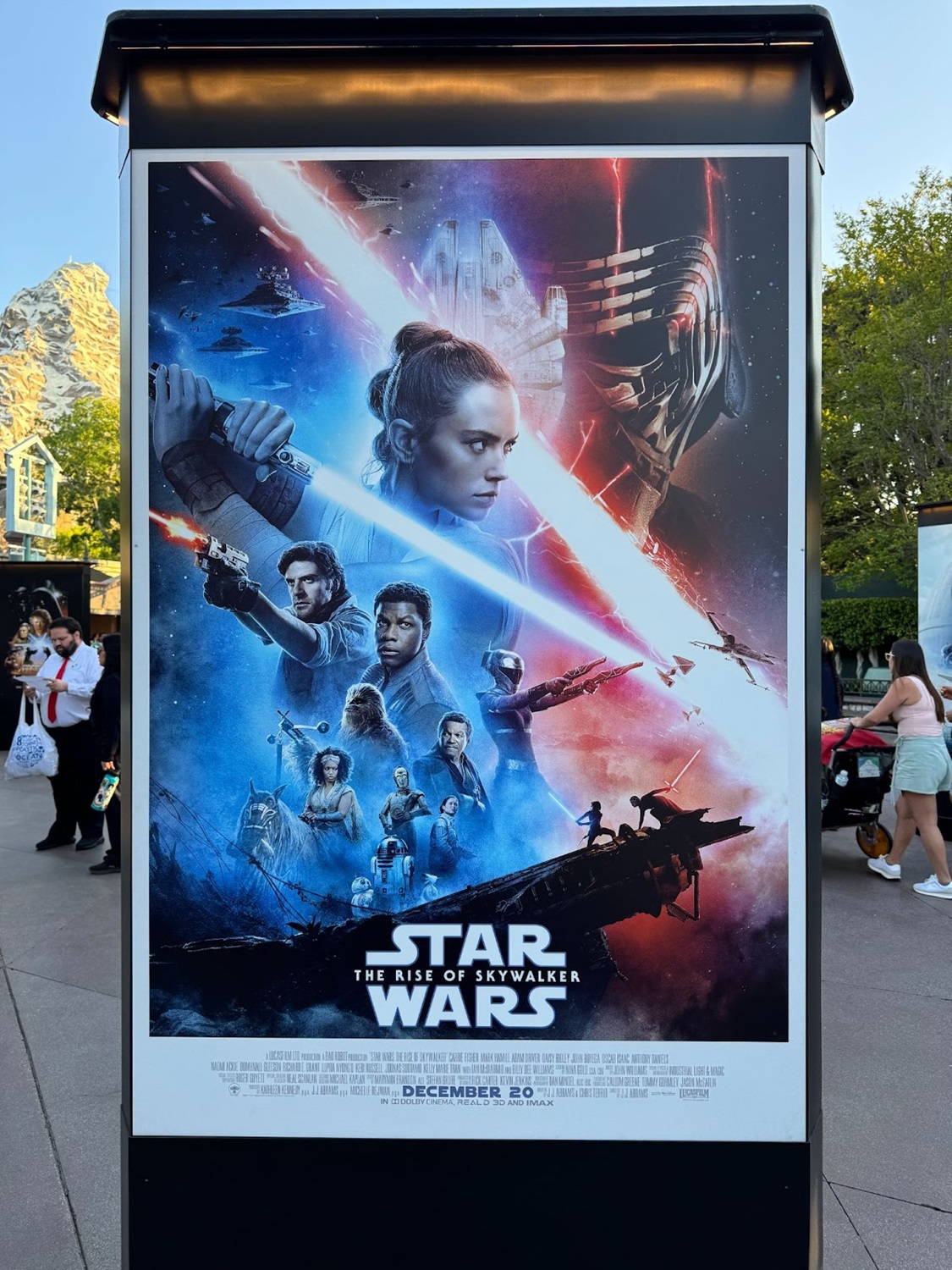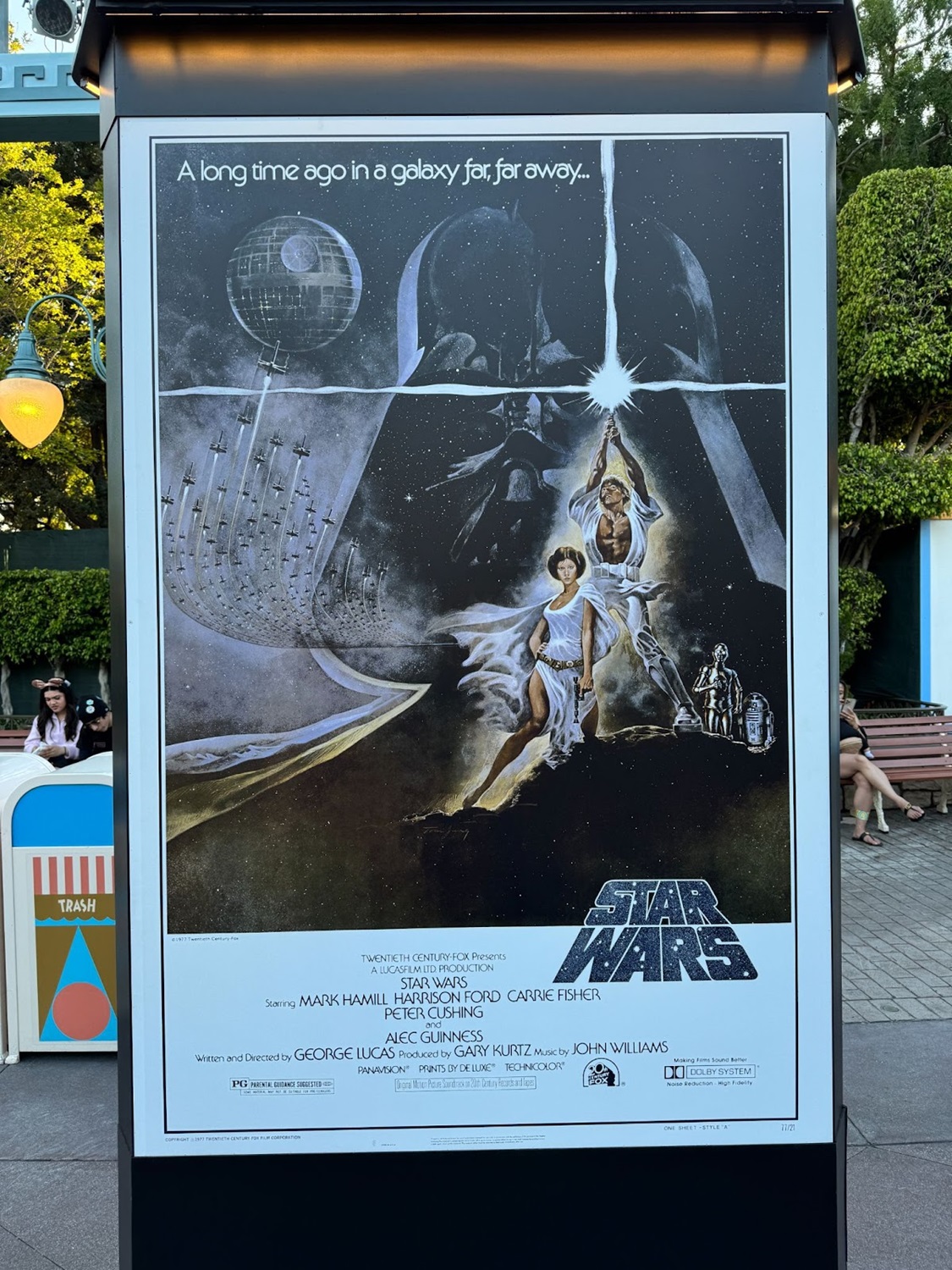 Stepping back out into Disneyland towards the Fantasyland Theatre, the “it’s a small world" mall has been decorated in Star Wars posters, reminding fans that no matter where you are in the park tonight, the force will always be with you. Posters of all the mainline movies are represented in the display, as well as spinoff films like Solo and Rogue One. For Disney Parks fans, you’ll even find the original Star Tours poster.