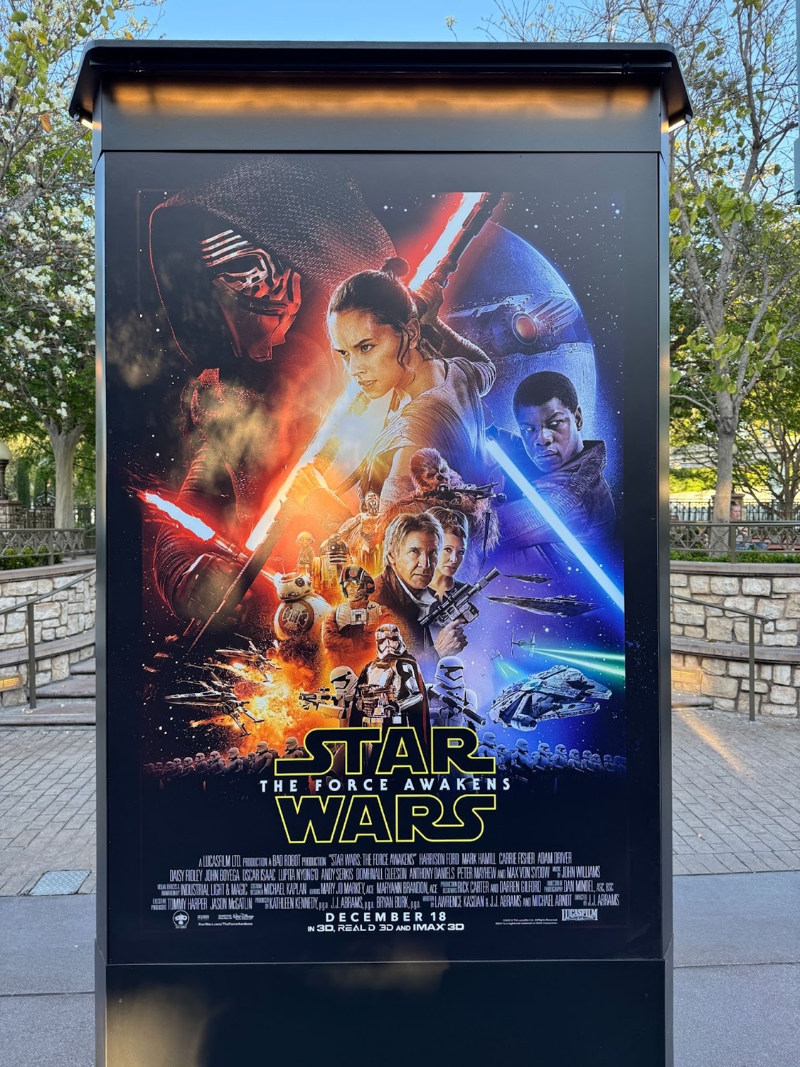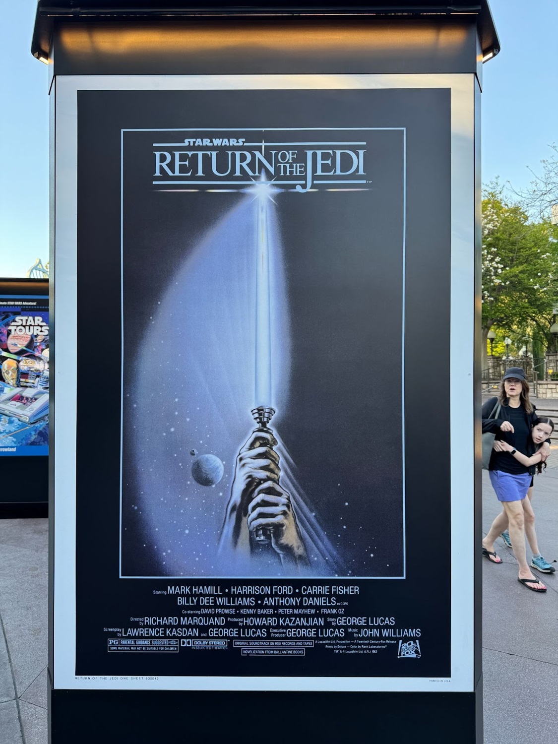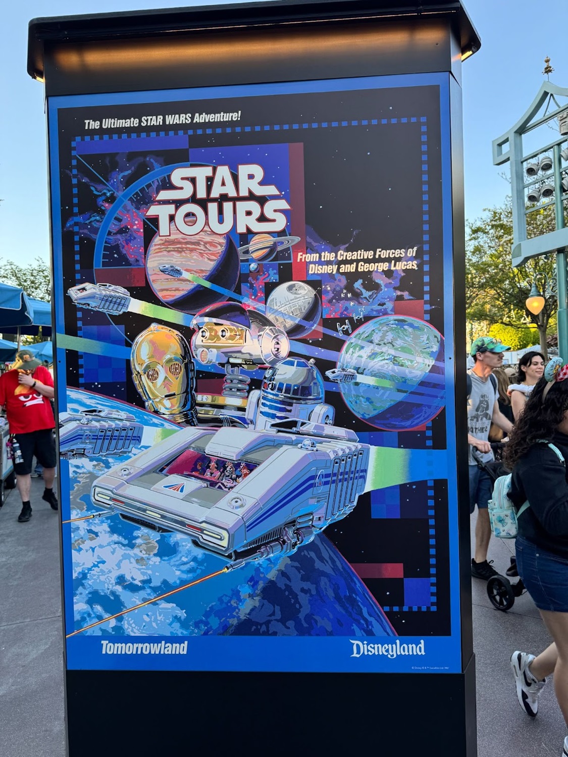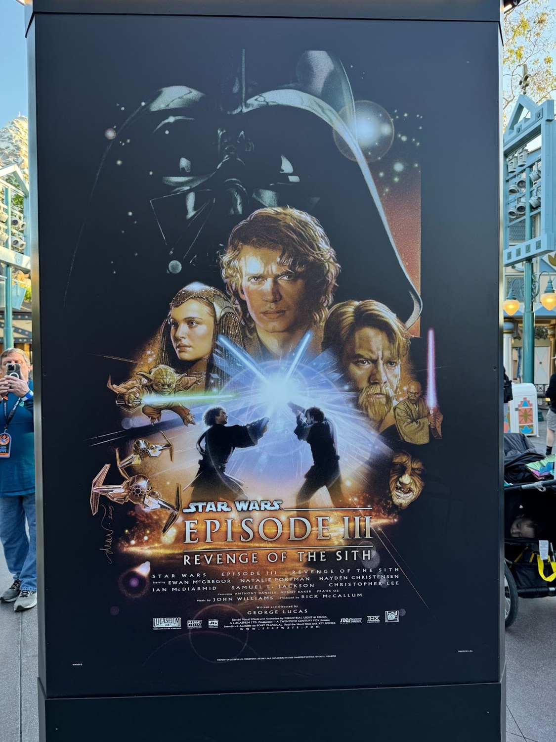 Stepping back out into Disneyland towards the Fantasyland Theatre, the “it’s a small world" mall has been decorated in Star Wars posters, reminding fans that no matter where you are in the park tonight, the force will always be with you. Posters of all the mainline movies are represented in the display, as well as spinoff films like Solo and Rogue One. For Disney Parks fans, you’ll even find the original Star Tours poster.