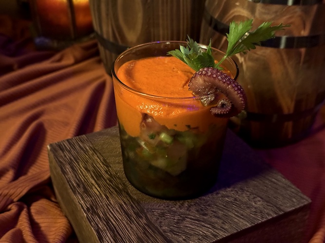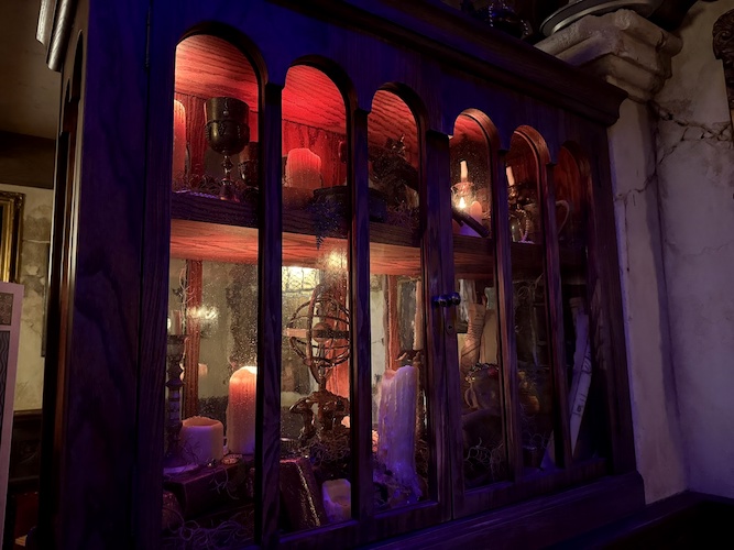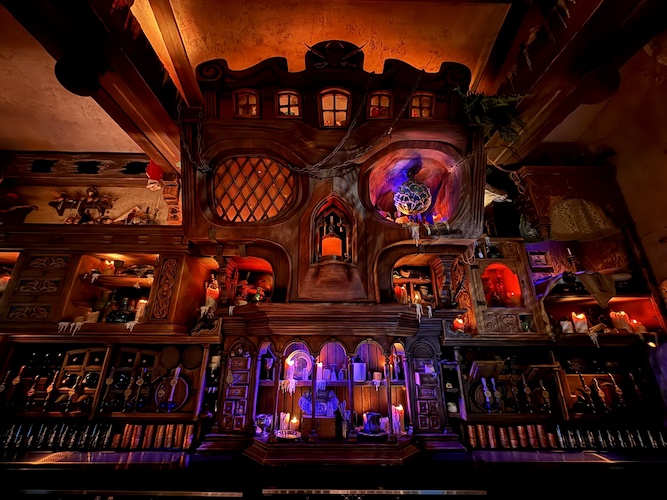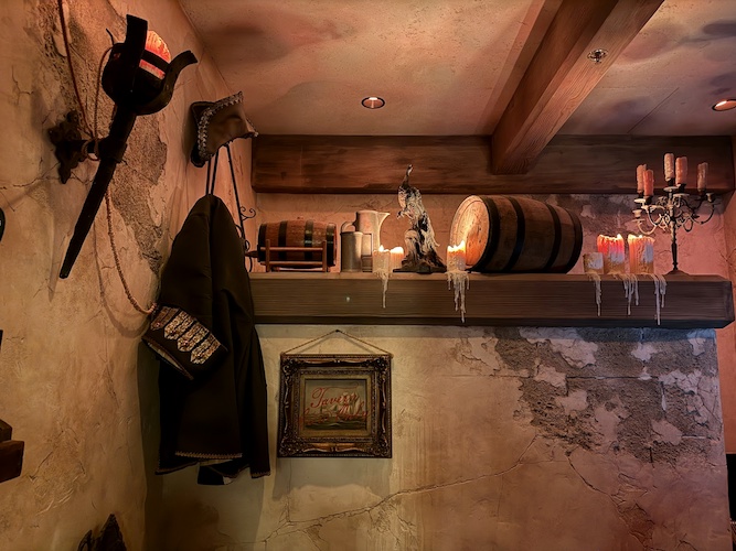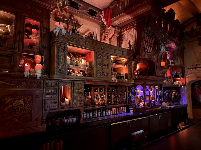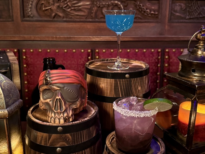 Perhaps the most exciting element of all in this new lounge is Rummy the Parrot, an animatronic parrot inspired by the old Barker Bird at the entrance to the attraction. Rummy welcomes patrons and keeps an eye on the crew, quick with a story, joke, or song as he wobbles out from his main roost in the hollow of the skull’s eye.