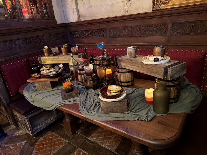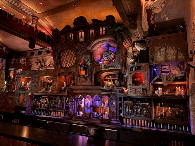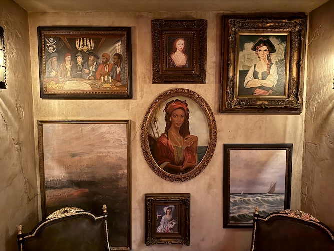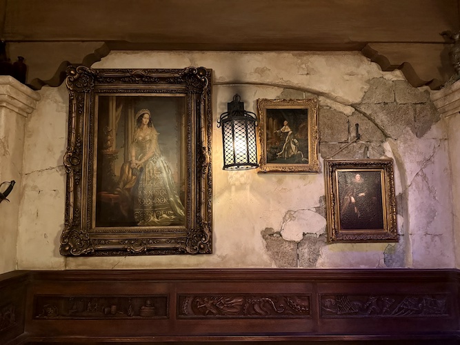 A portrait gallery includes Captain Merry, the founder of The Beak and Barrel, as well as the Enchantress who gifted the establishment with the Enchanted Rum Bottle in the center of the skull bar – ensuring that the bar will never go dry.