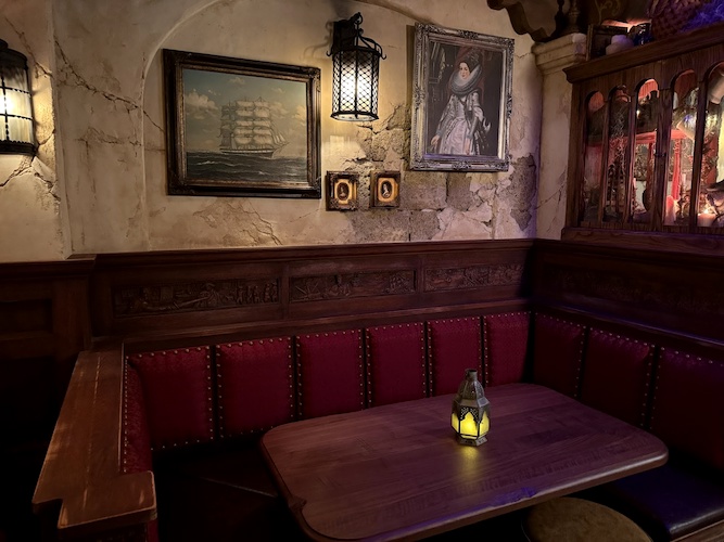 Along the wall, find four grand booths with intricately carved wooden panels. Each booth tells stories of the exploits of notorious pirates, whose legends still echo across the seas.