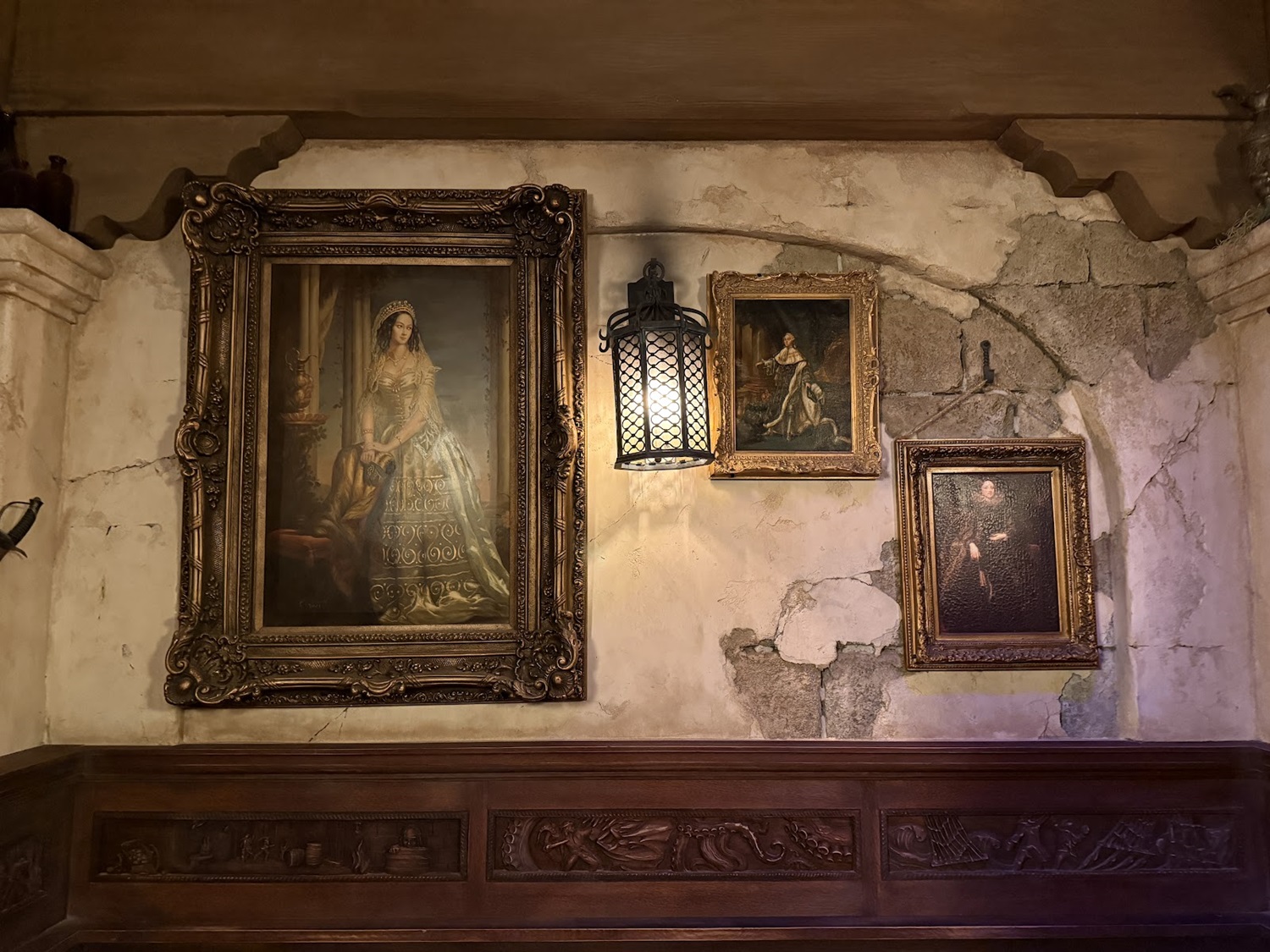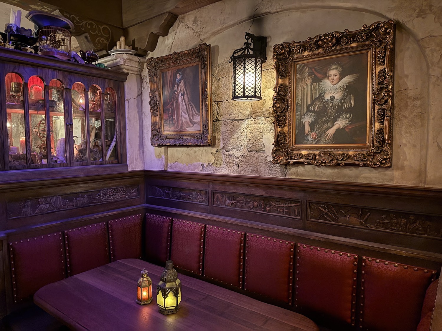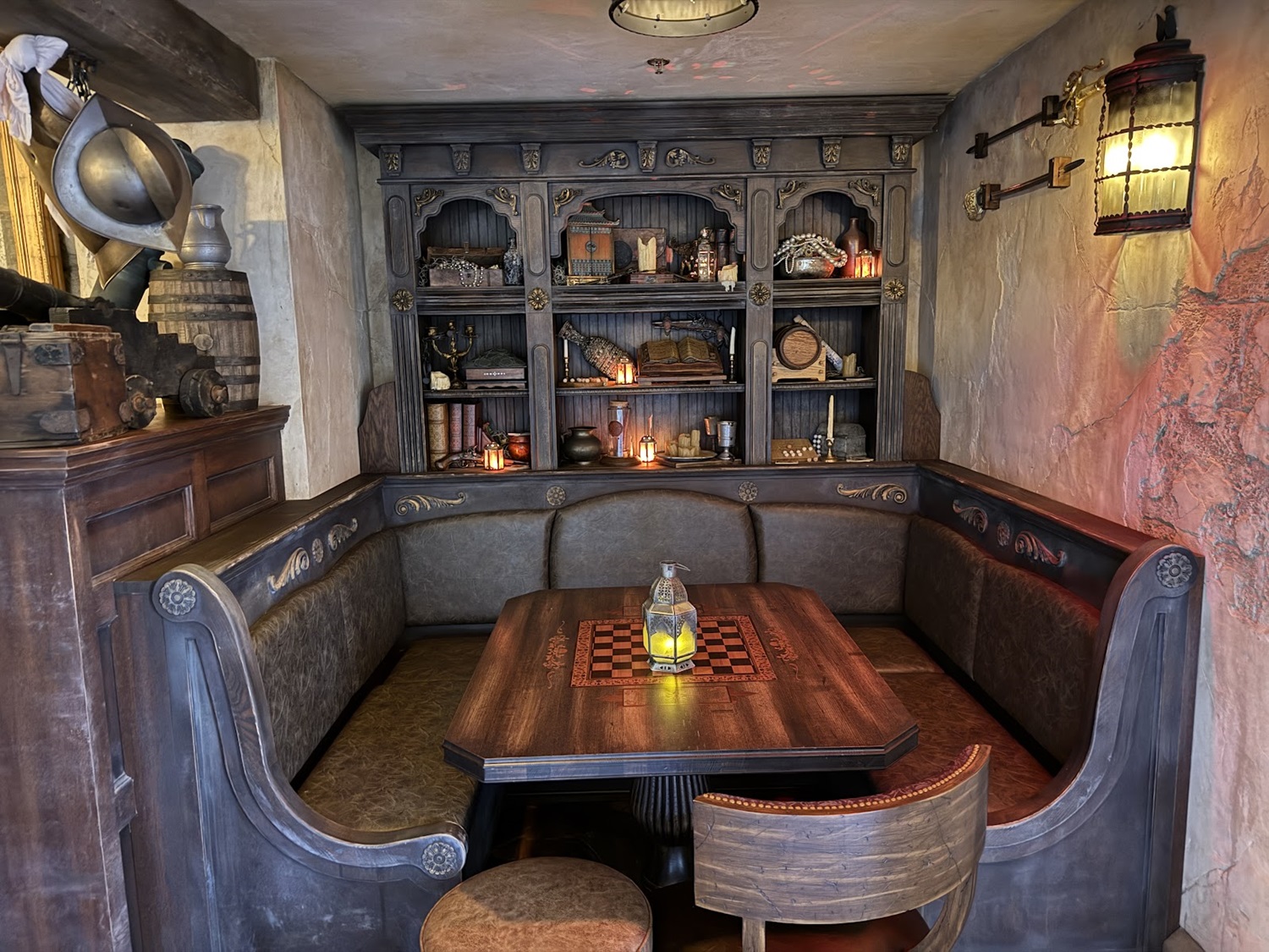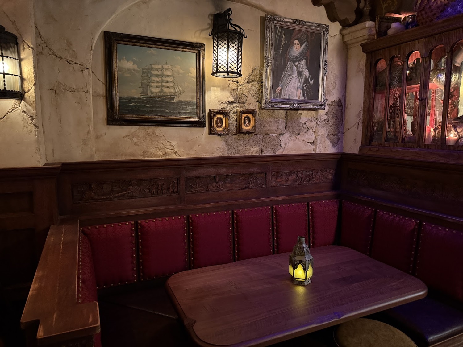 Along the wall, find four grand booths with intricately carved wooden panels. Each booth tells stories of the exploits of notorious pirates, whose legends still echo across the seas.