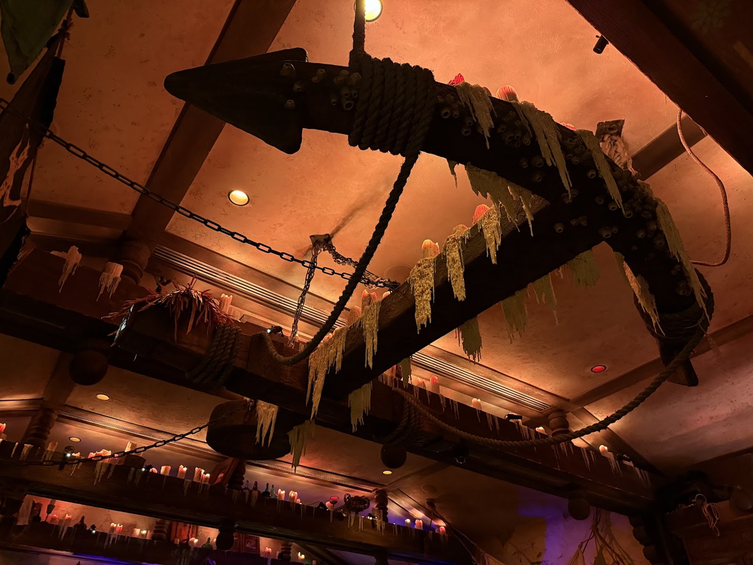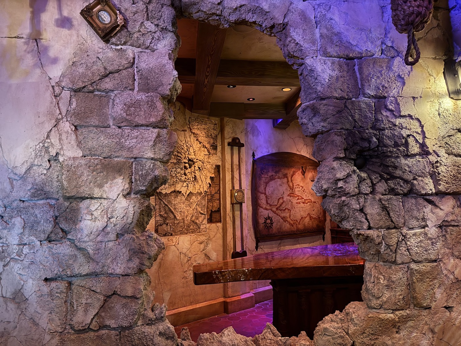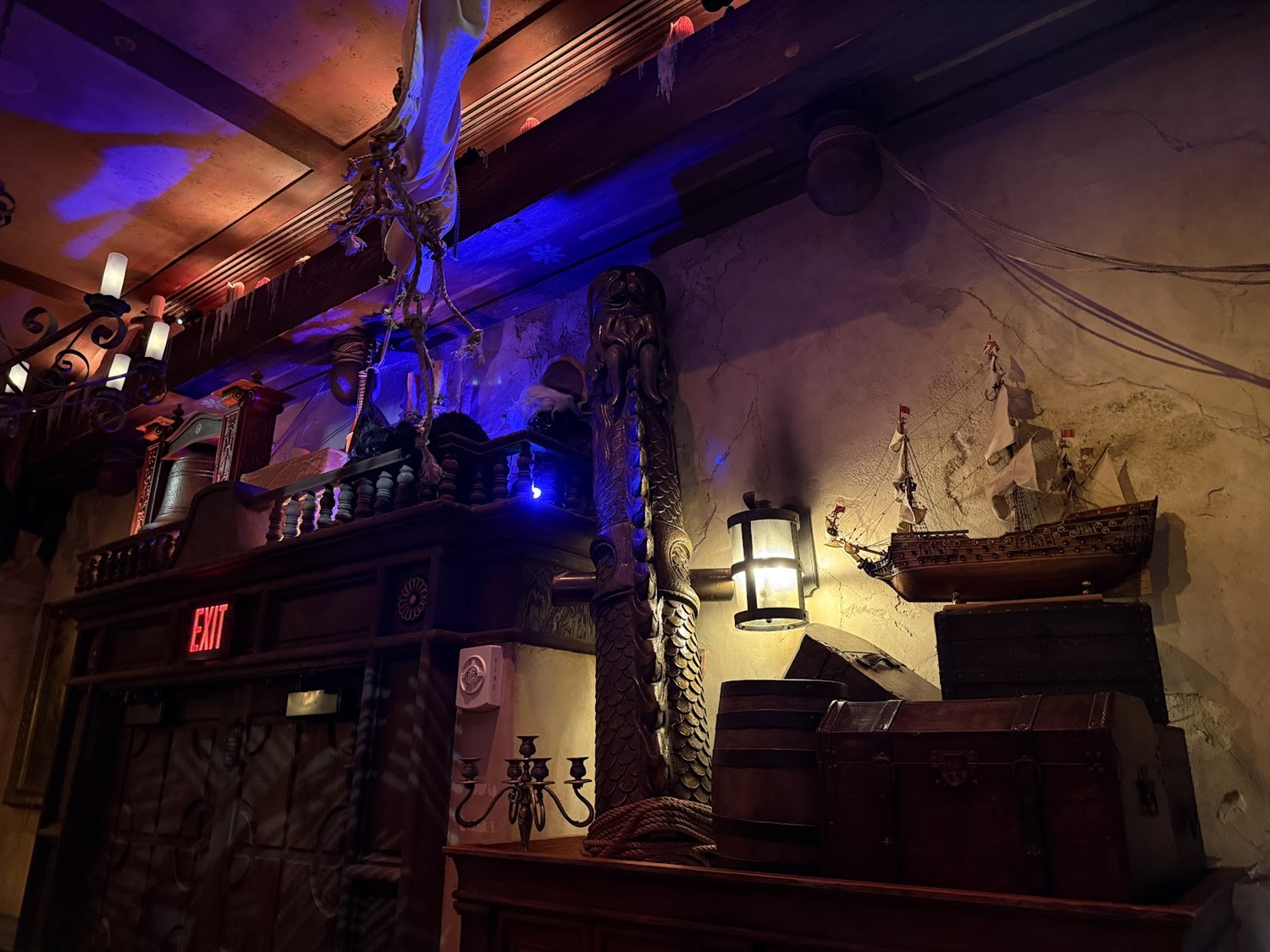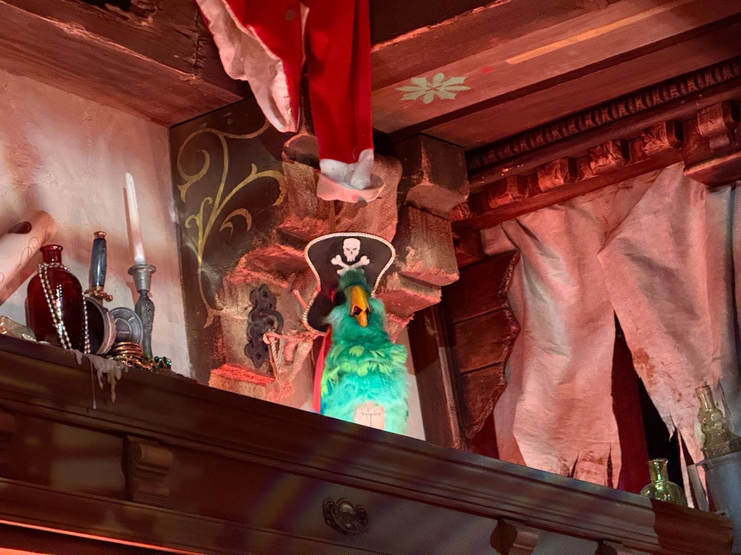 Fans of the attraction will love to see this sleeping pirate with a dangling foot hanging out above the map room, referencing the hairy-legged pirate in the attraction.