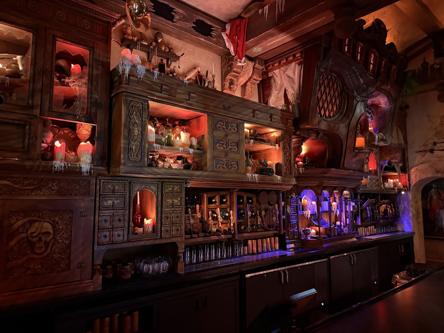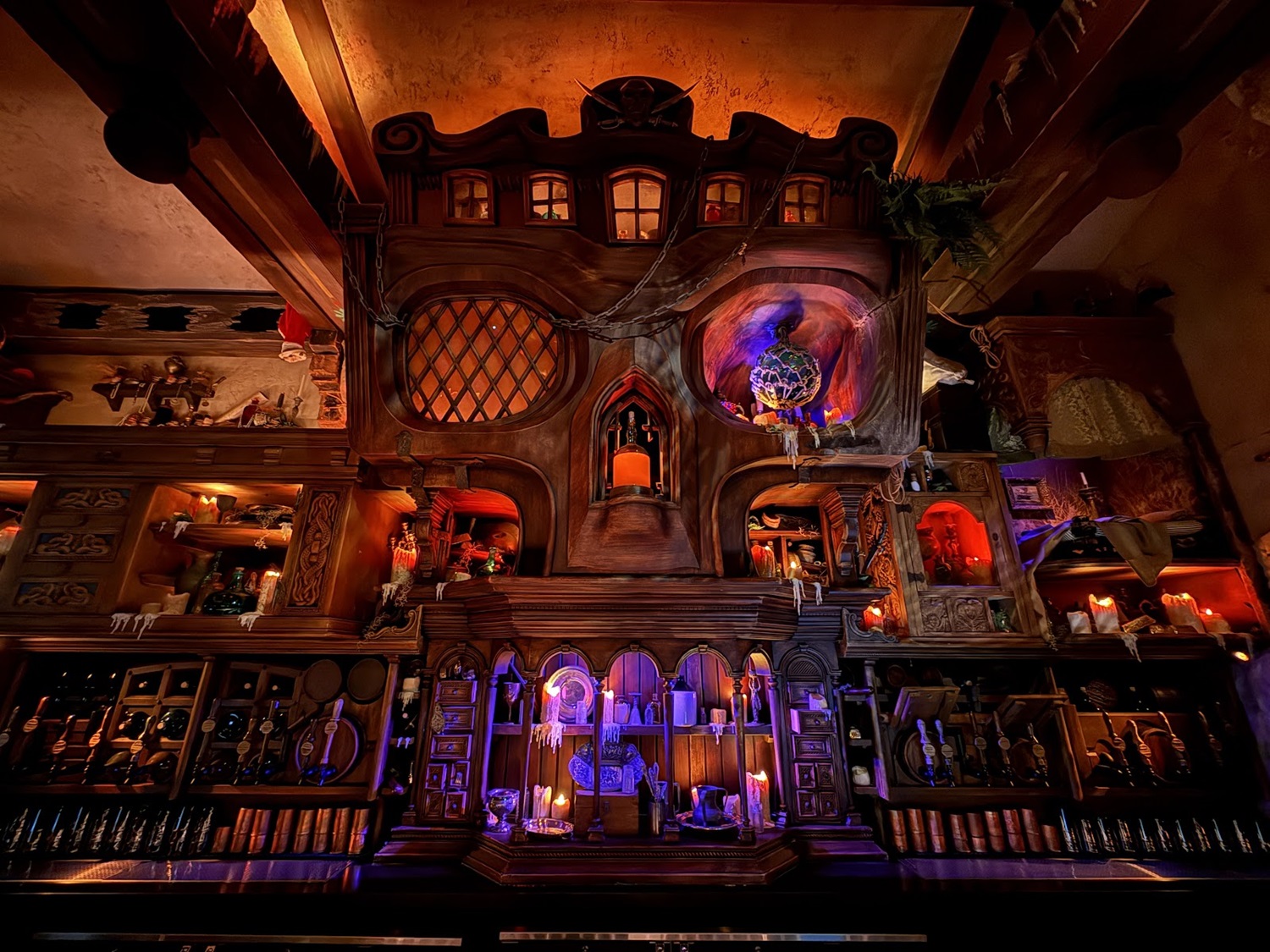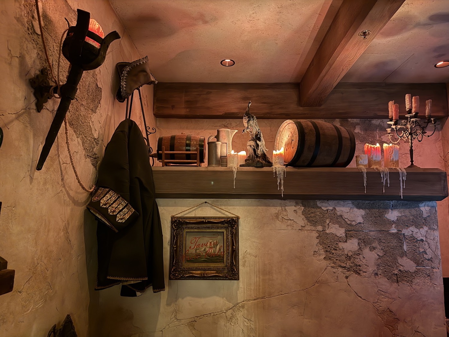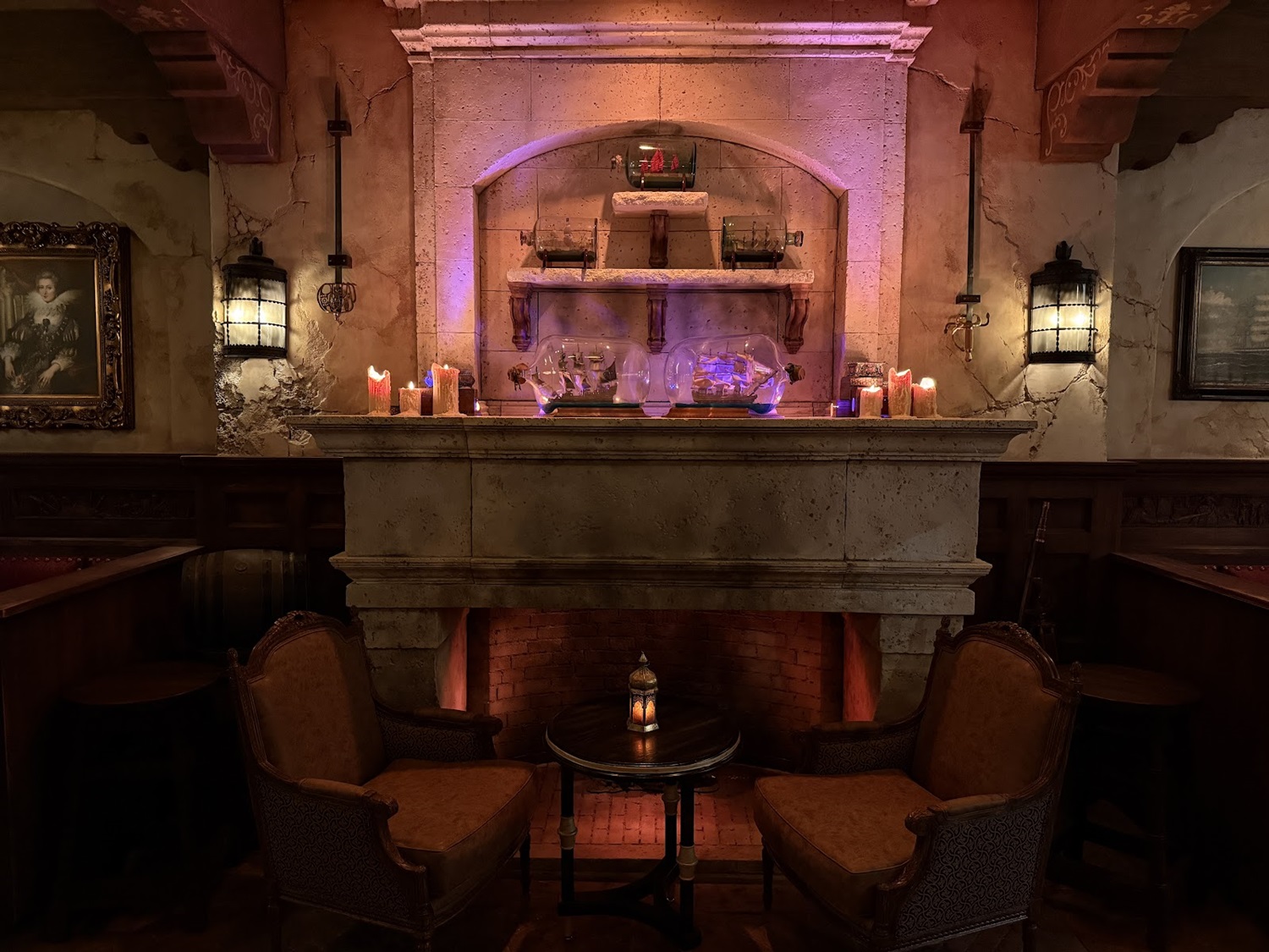 A portrait gallery includes Captain Merry, the founder of The Beak and Barrel, as well as the Enchantress who gifted the establishment with the Enchanted Rum Bottle in the center of the skull bar – ensuring that the bar will never go dry.