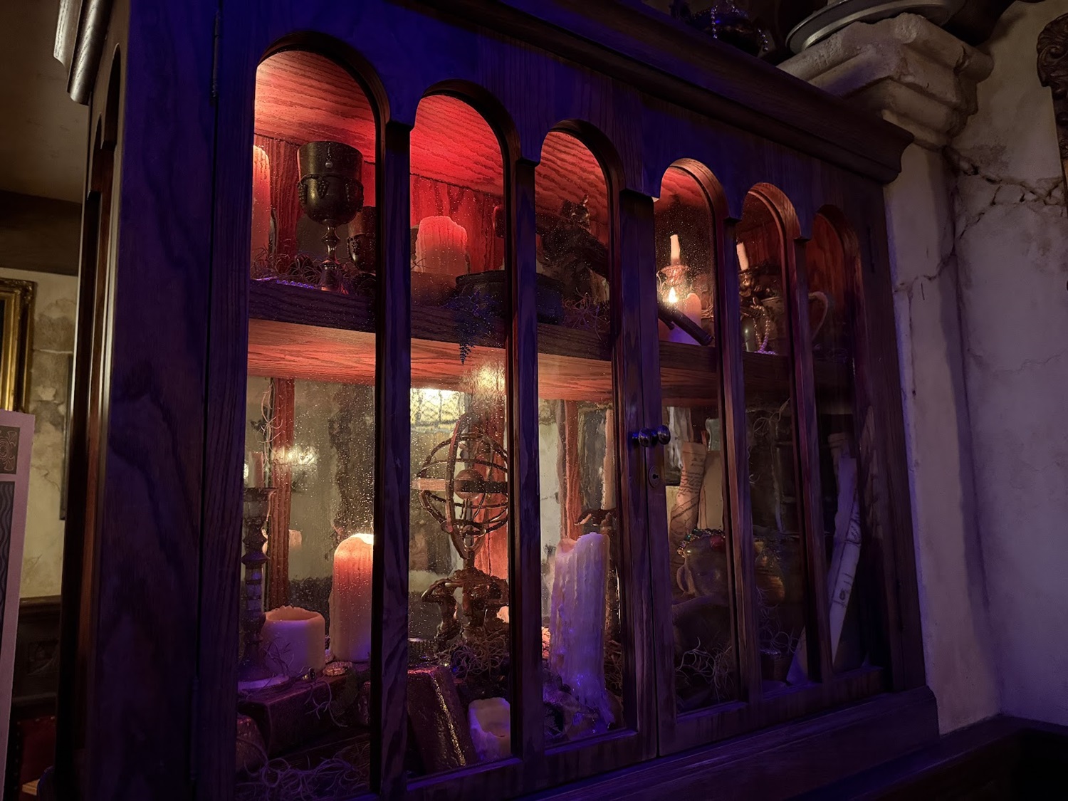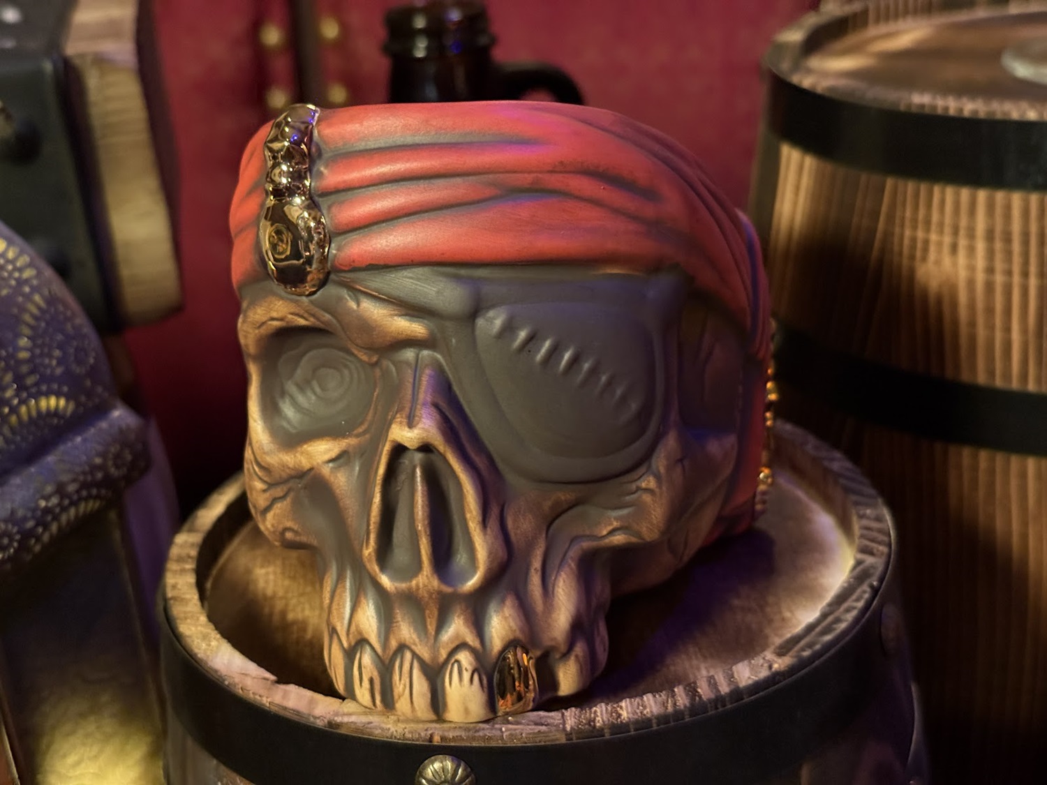 Perhaps the most exciting element of all in this new lounge is Rummy the Parrot, an animatronic parrot inspired by the old Barker Bird at the entrance to the attraction. Rummy welcomes patrons and keeps an eye on the crew, quick with a story, joke, or song as he wobbles out from his main roost in the hollow of the skull’s eye.