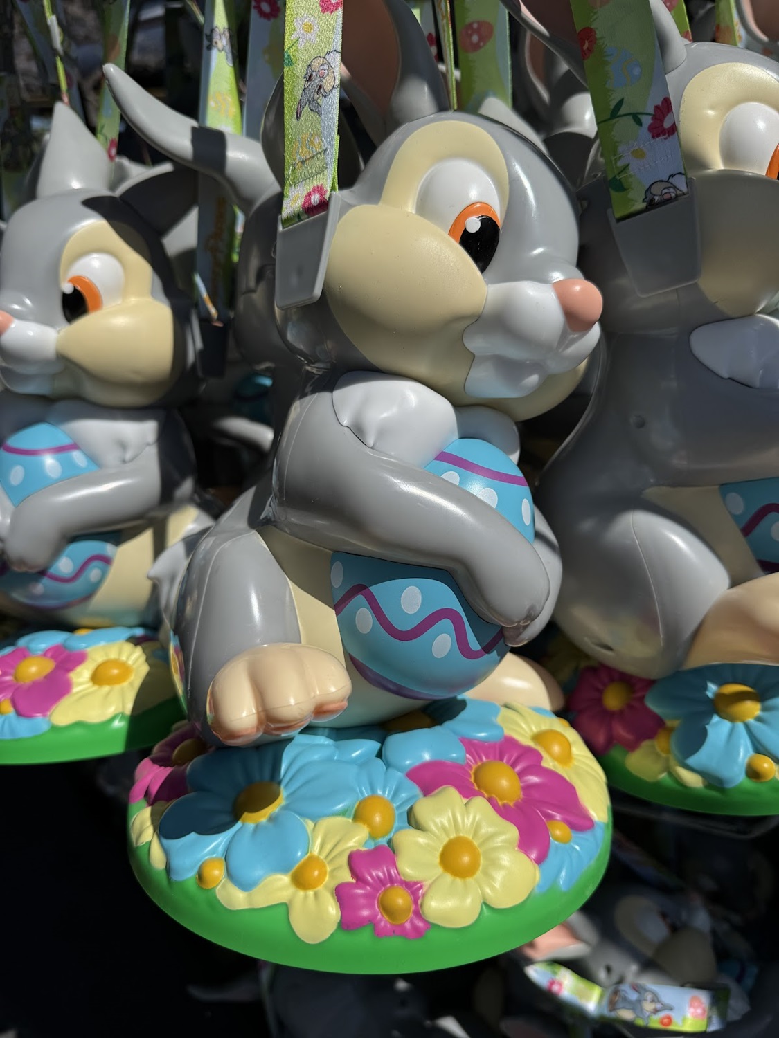 - Beautifully sculpted, the bucket features Bambi’s pal sitting atop a bed of flowers, holding an Easter egg in his paws.