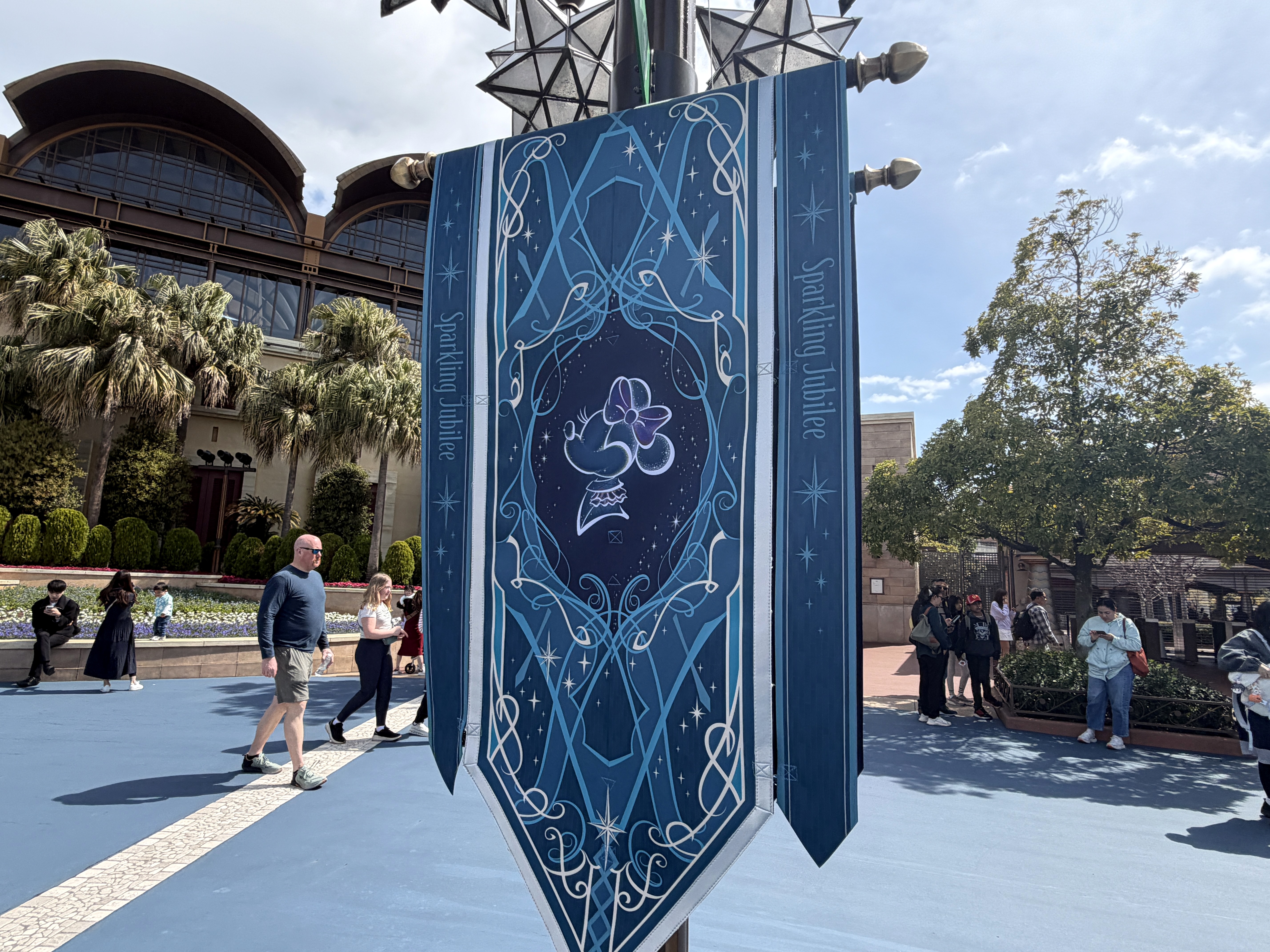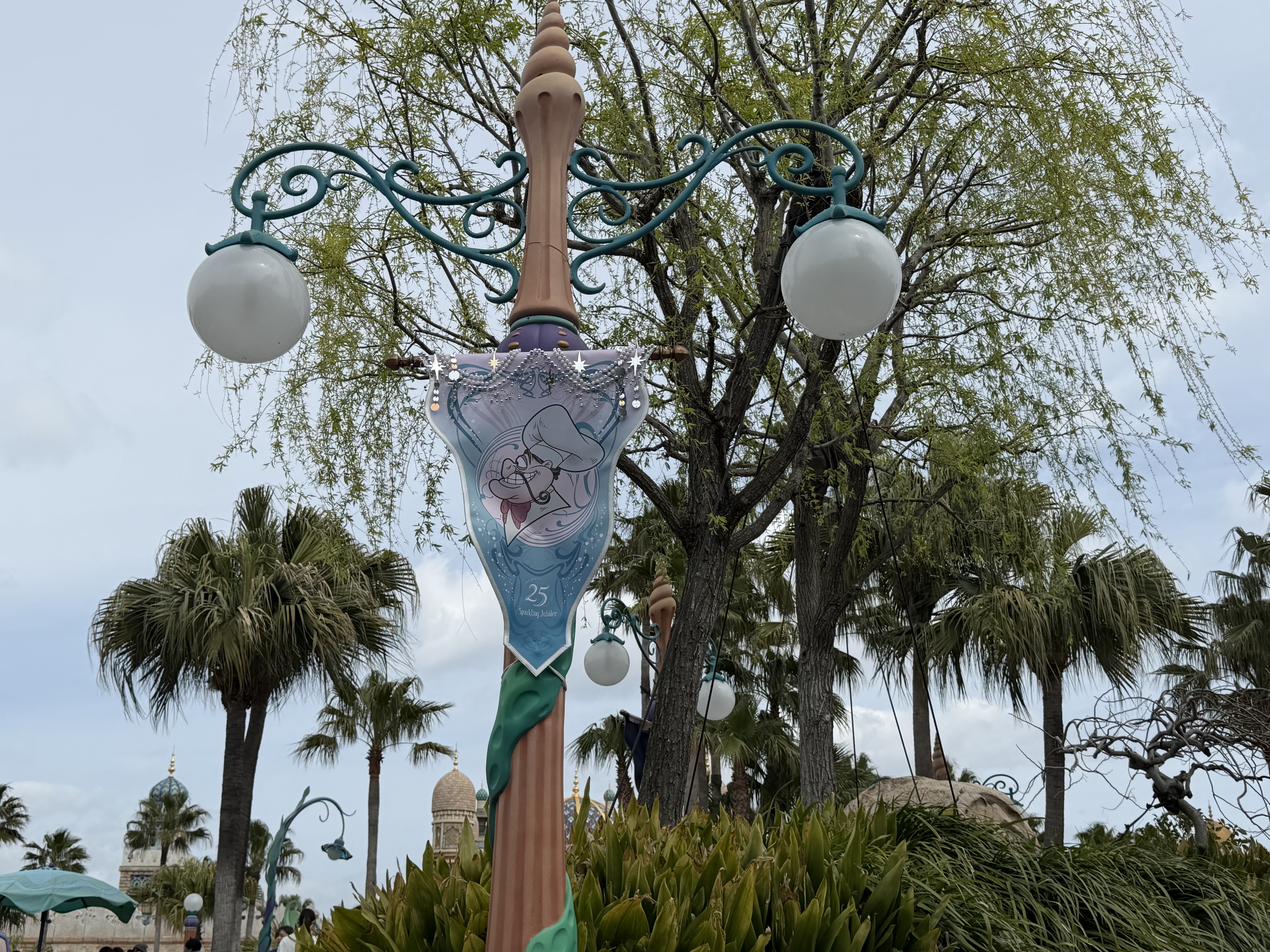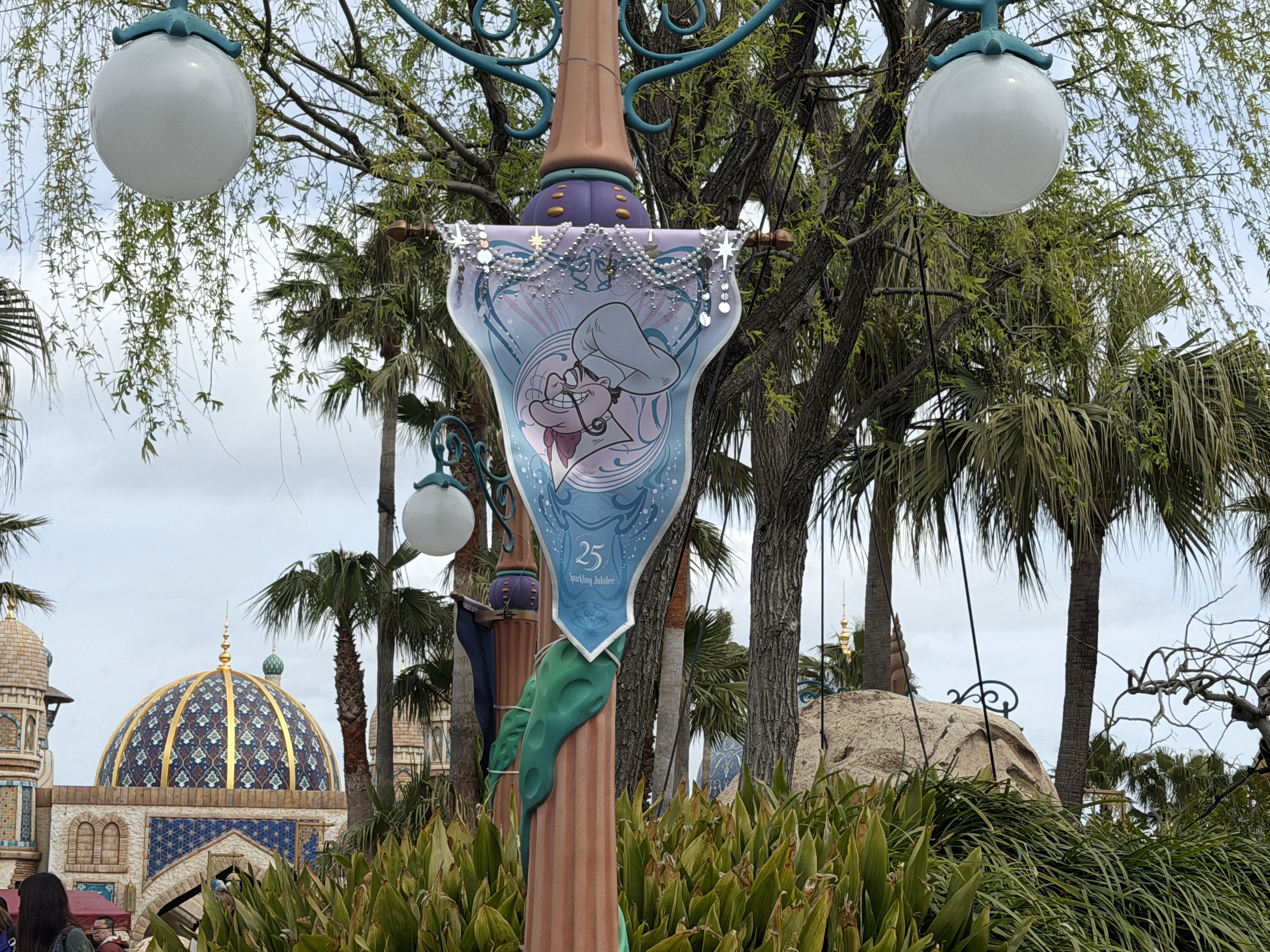 As part of the fun of the 25th anniversary celebration at Tokyo DisneySea - Sparkling Jubilee - the whole park features special decorations to mark the anniversary milestone. It all starts at the park entrance, where the AquaSphere has several embellishments to mark the occasion.
