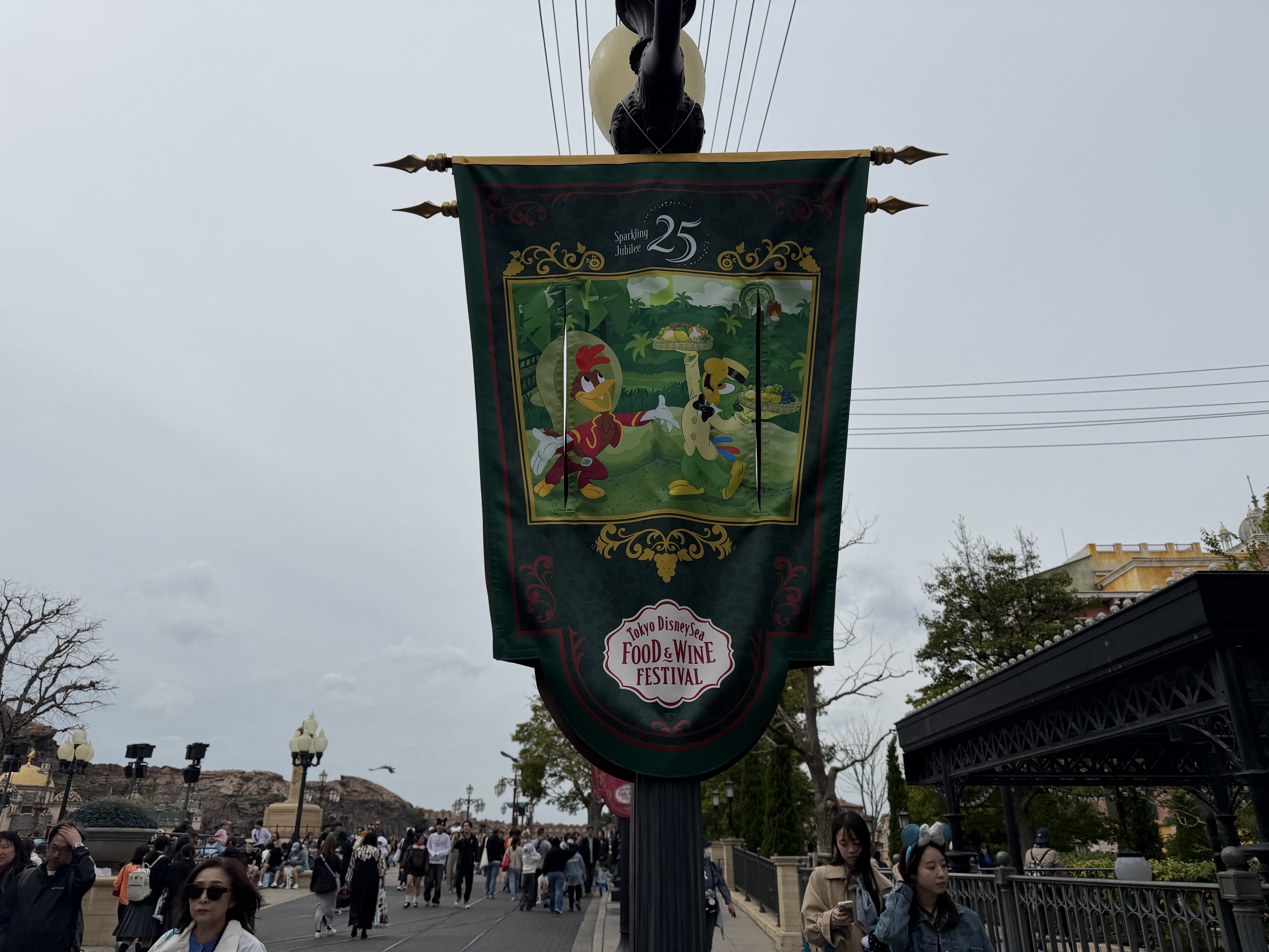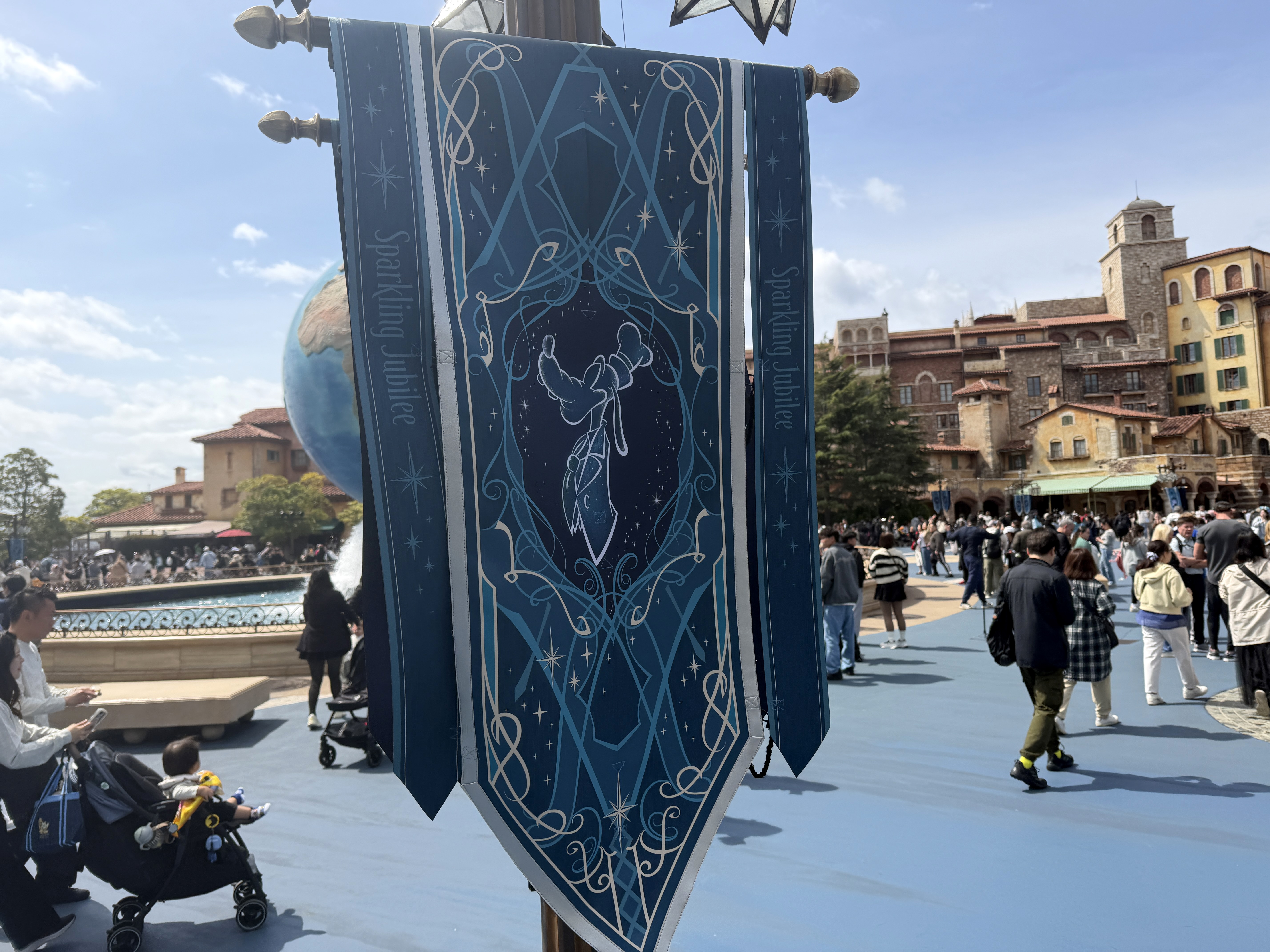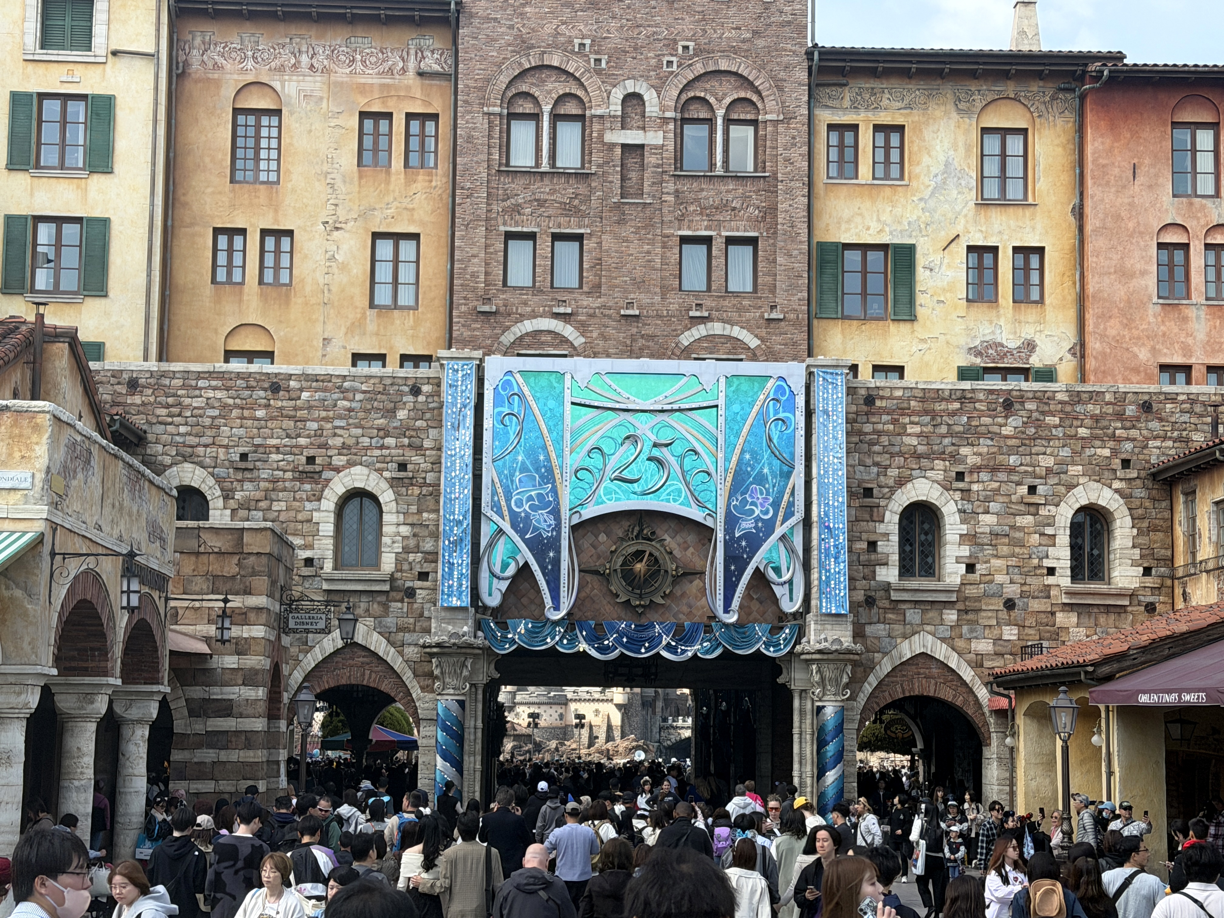 As part of the fun of the 25th anniversary celebration at Tokyo DisneySea - Sparkling Jubilee - the whole park features special decorations to mark the anniversary milestone. It all starts at the park entrance, where the AquaSphere has several embellishments to mark the occasion.