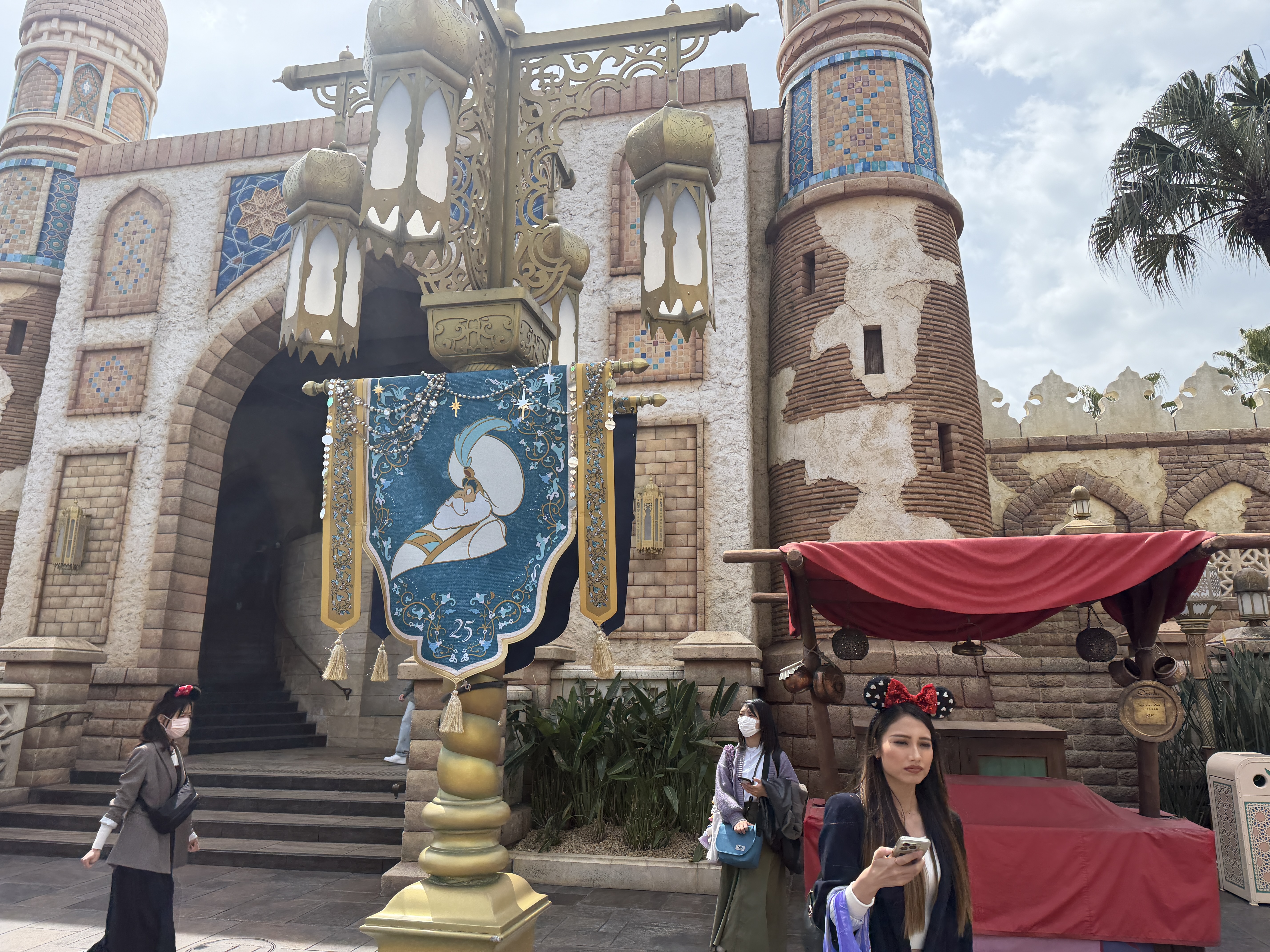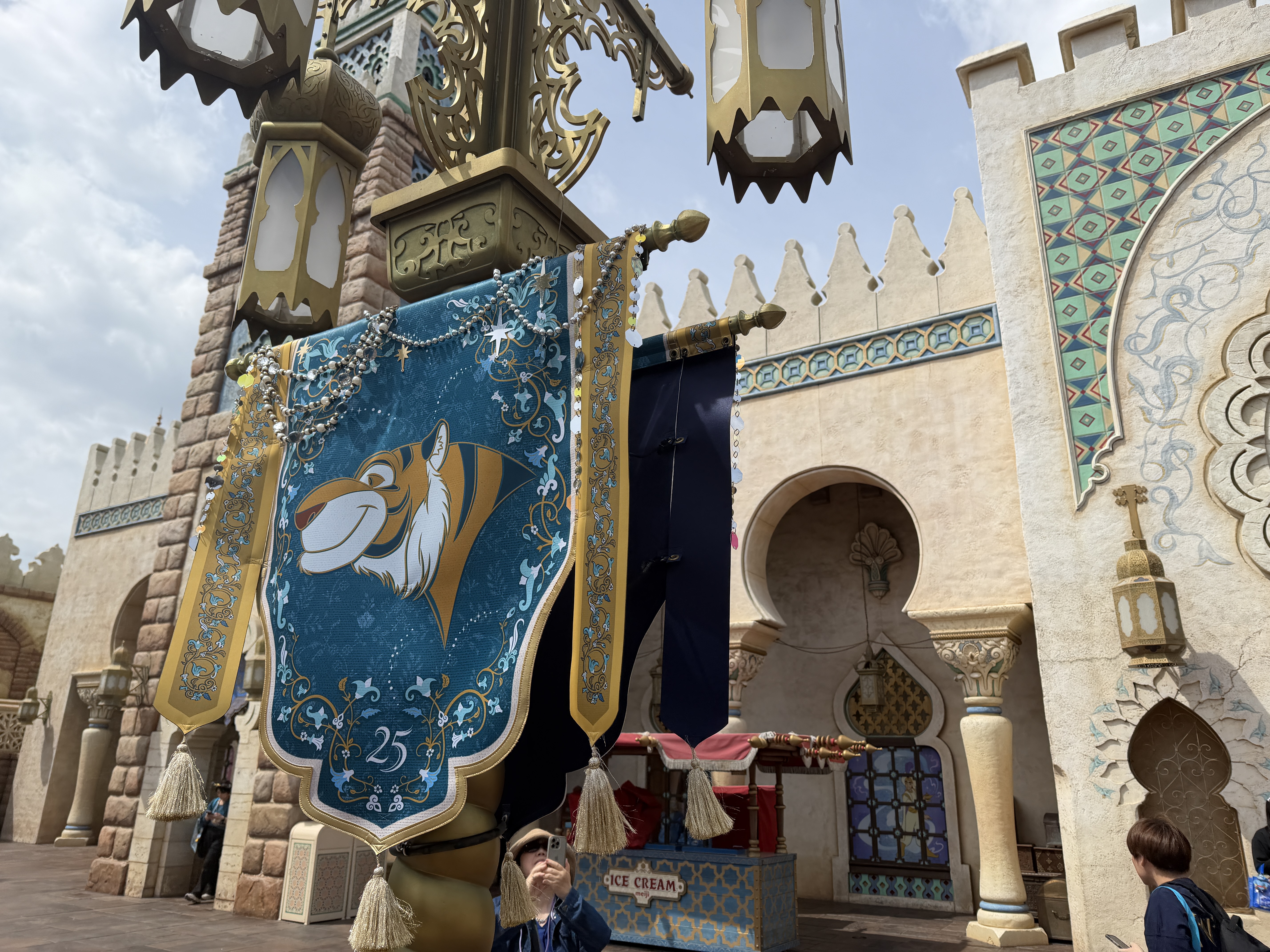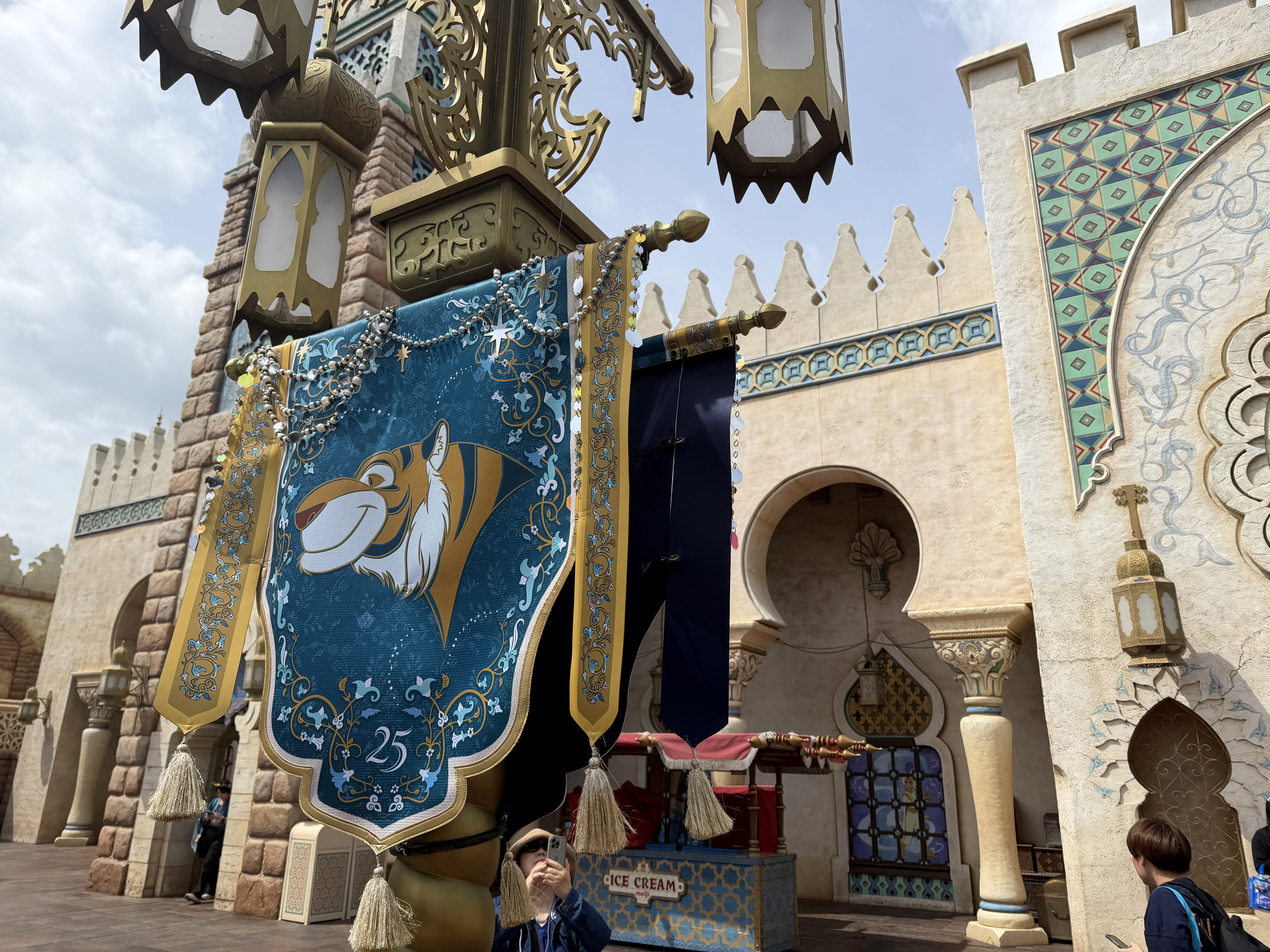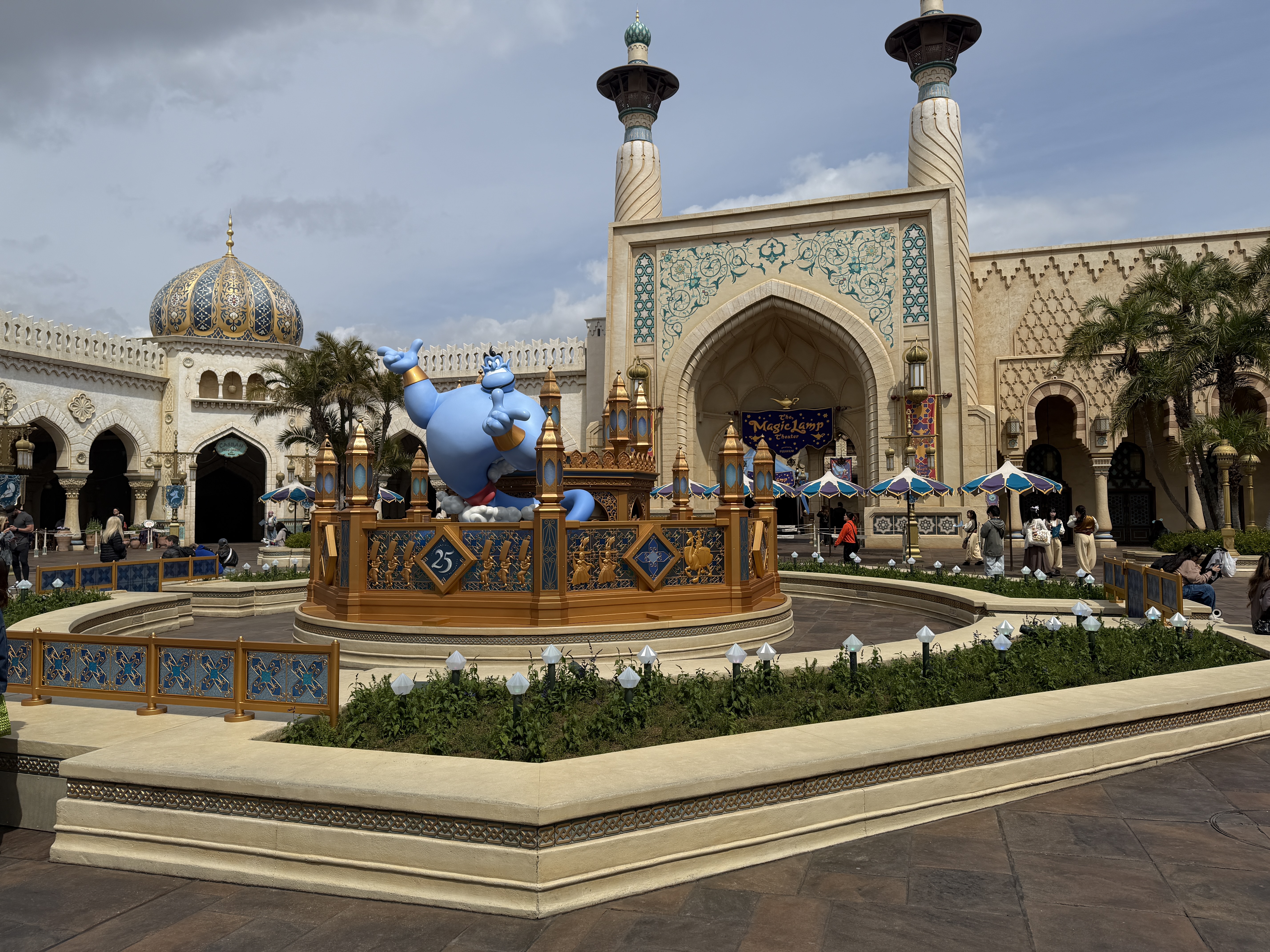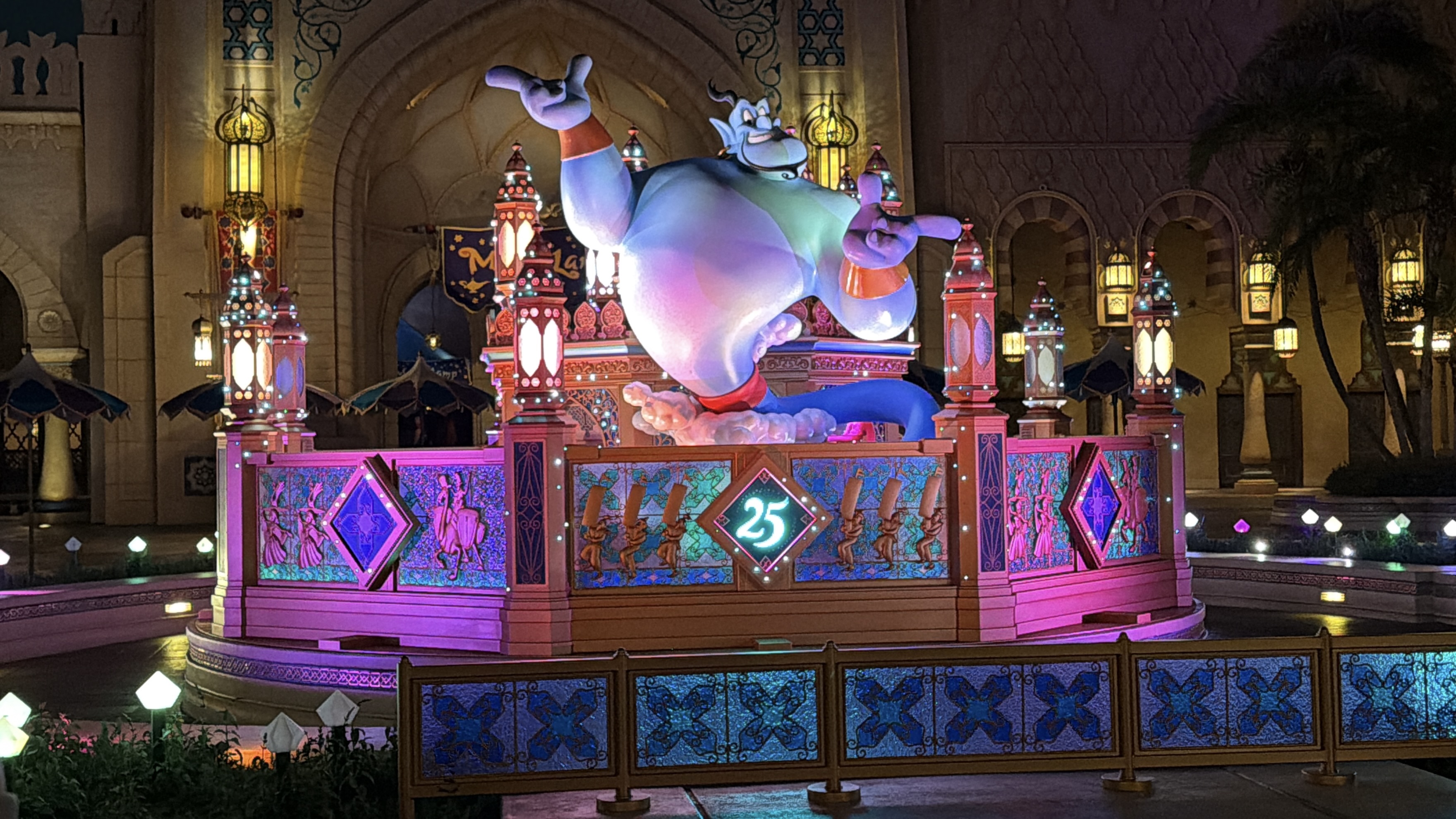 While the park's Arabian Coast isn't solely based on the film, Aladdin, Genie takes center stage on a special feature, surrounded banners featuring characters from the classic Walt Disney Animation Studios film.