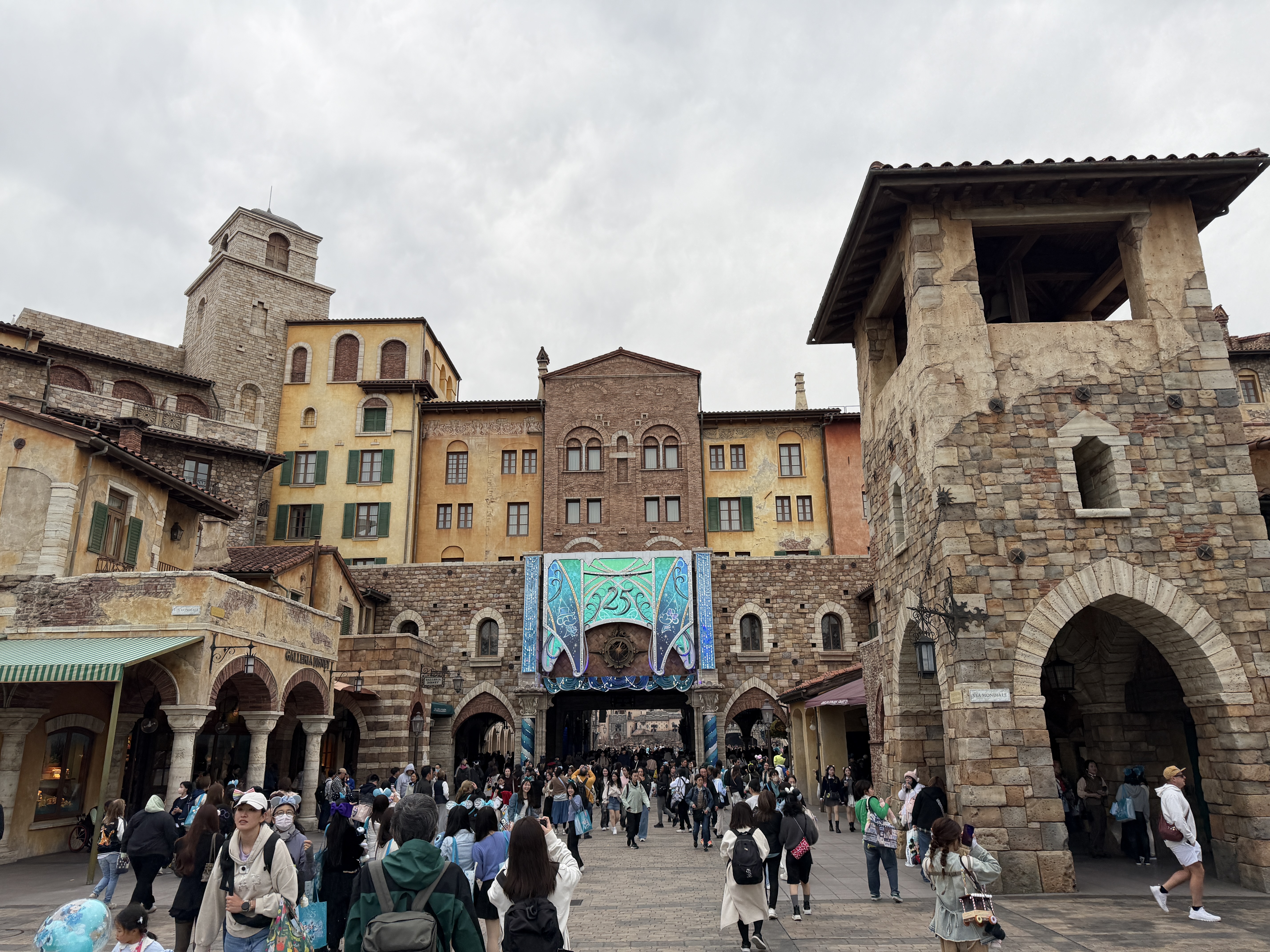 The Mediterranean Harbor not only serves as the entrance of the park, but also home to a lot of the decor - welcoming those to the park to celebrate the milestone. The archways of the Hotel MiraCosta (which has decor all their own) are adorned with features, and banners permeate the plazas.