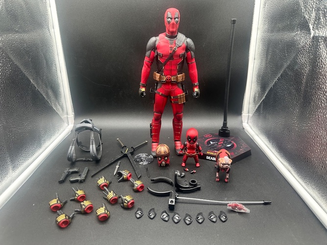 But wait, there’s more! Because there’s also a figurine – do you use that term for a character who’s just a floating head? - of Headpool, complete with a movable jaw and two styles of interchangeable fan (both still and in motion). And last but certainly not least, the one and only Dogpool, sporting his goggles and boasting a moveable head and articulated front legs. While it would have been nice if Dogpool’s back legs were articulated too, the fact that all three of these extra characters have any articulation at all is appreciated, given in the past inclusions like this, such as the Spider-Ham that came with the Hot Toys Into the Spider-Verse Gwen figure, had no articulation at all.