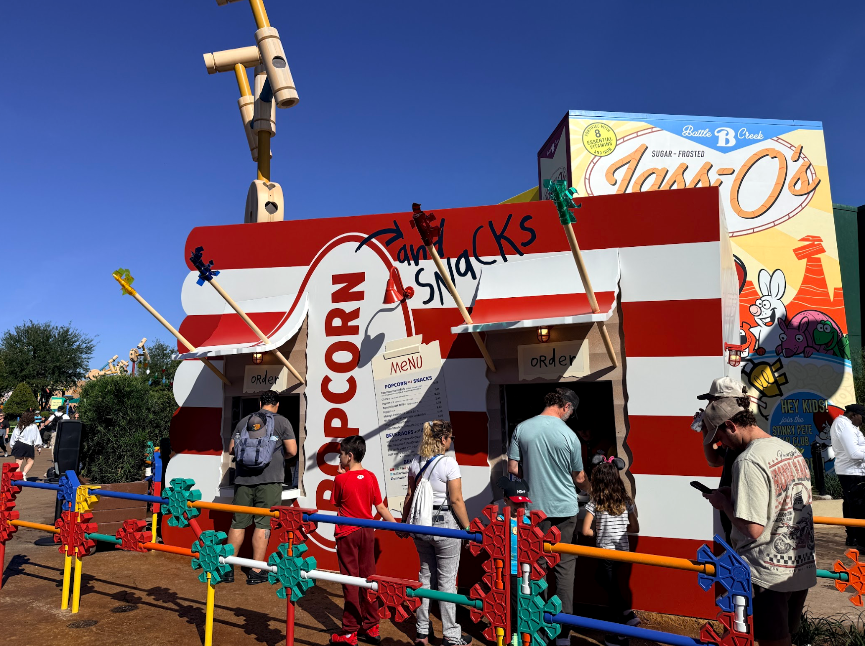 - From the stand, you can see the large Lass-Os “cereal box” hiding the Toy Story Mania building.