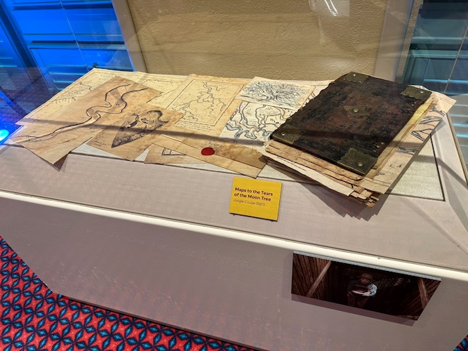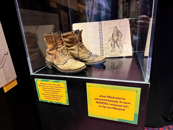 Boots worn by Imagineer Joe Rohde during various research trips and his sketchbook from a 2005 trip to Nepal are prominently on display.