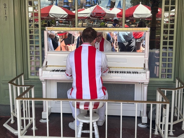 Outside of Casey’s on Main Street, a talented piano player plays an assortment of Disney musical medleys. He may have his back to the guests, but he has mirrors at the front of his piano, that he looks up into and nods to acknowledge the people who stand in awe of his talent.