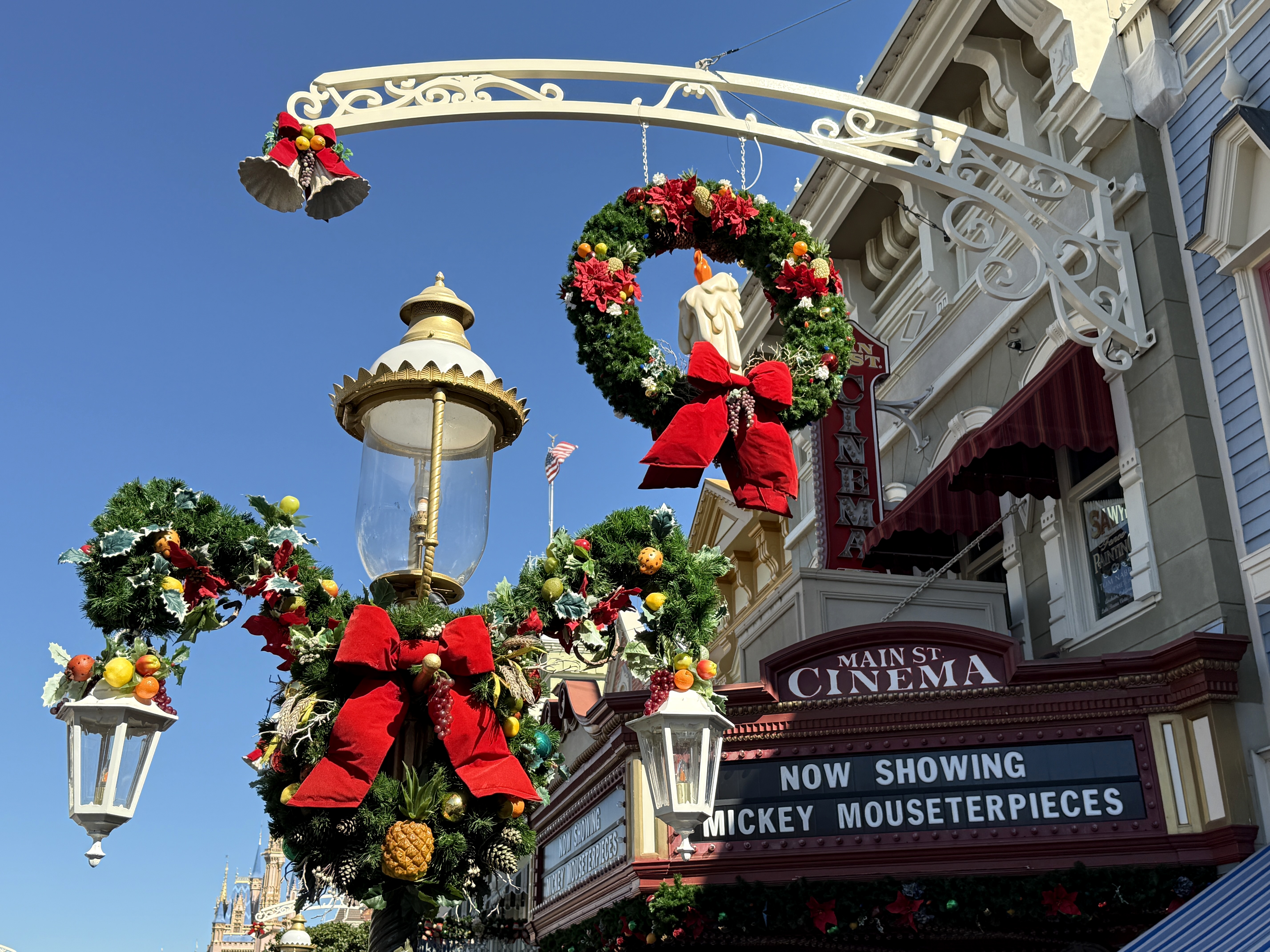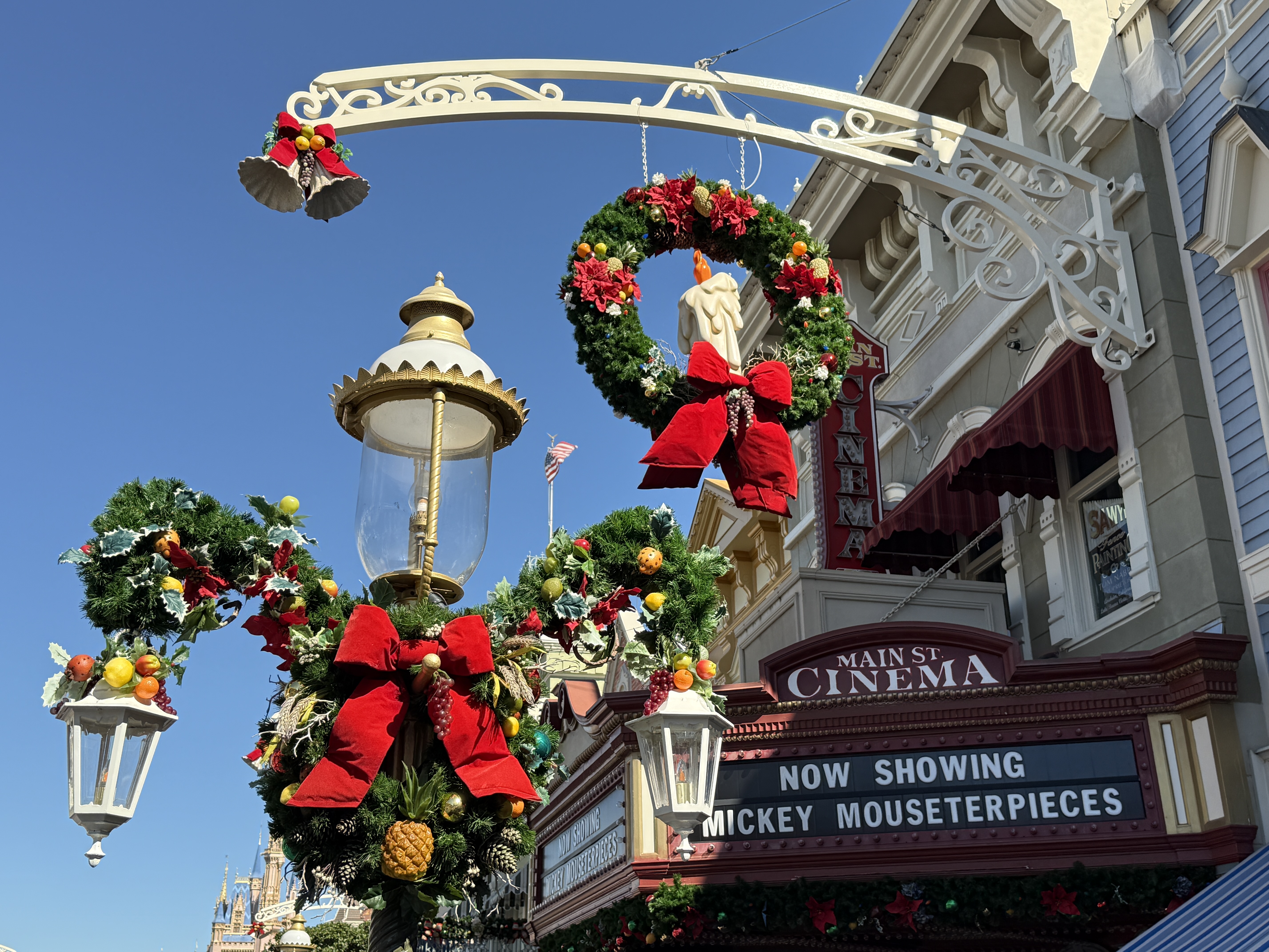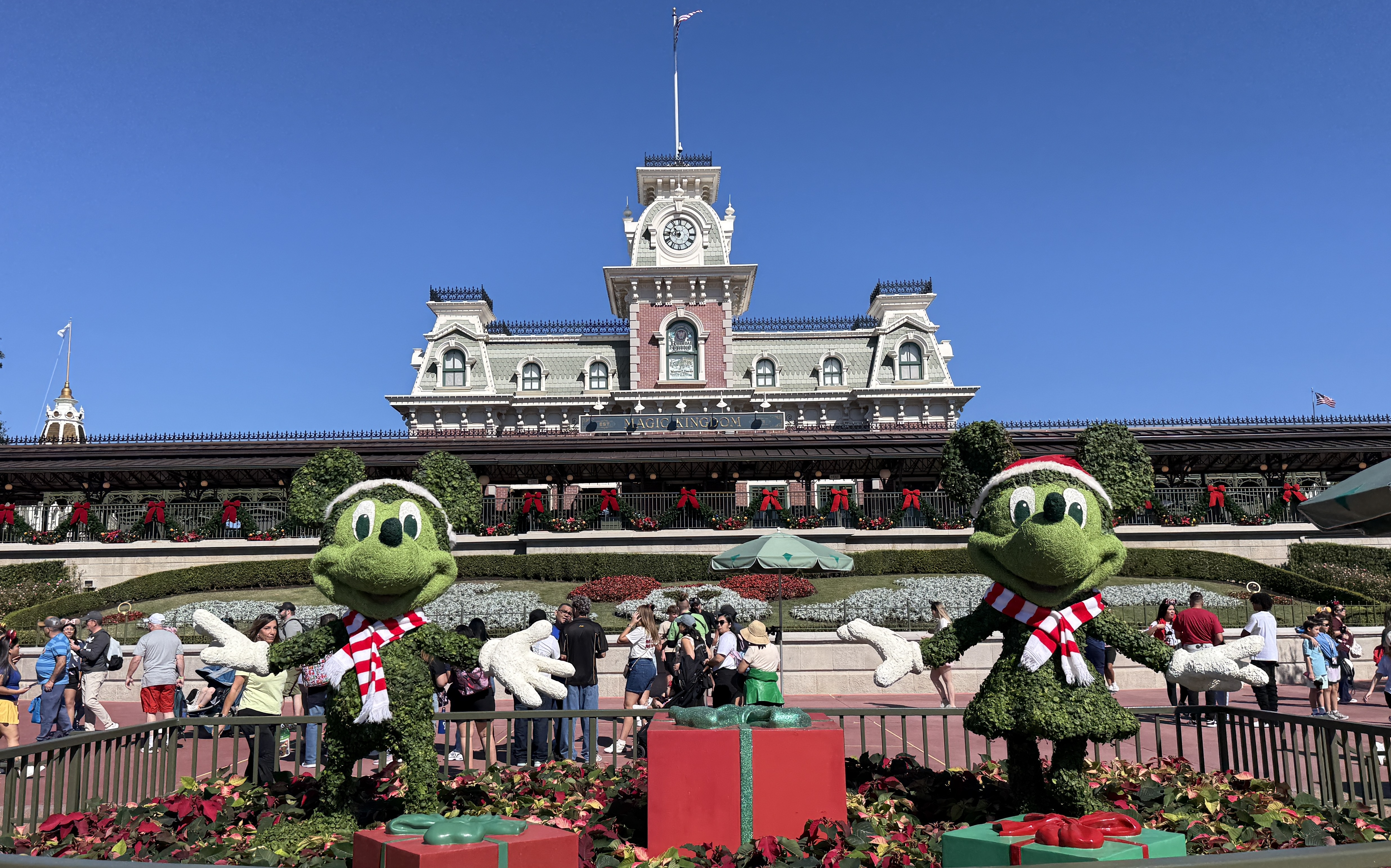 The in-process holiday makeover is clear once you enter Magic Kingdom, where a couple of winter-ready Mickey and Minnie topiaries greet you by the train station, while the station itself now boasts some decoration.
