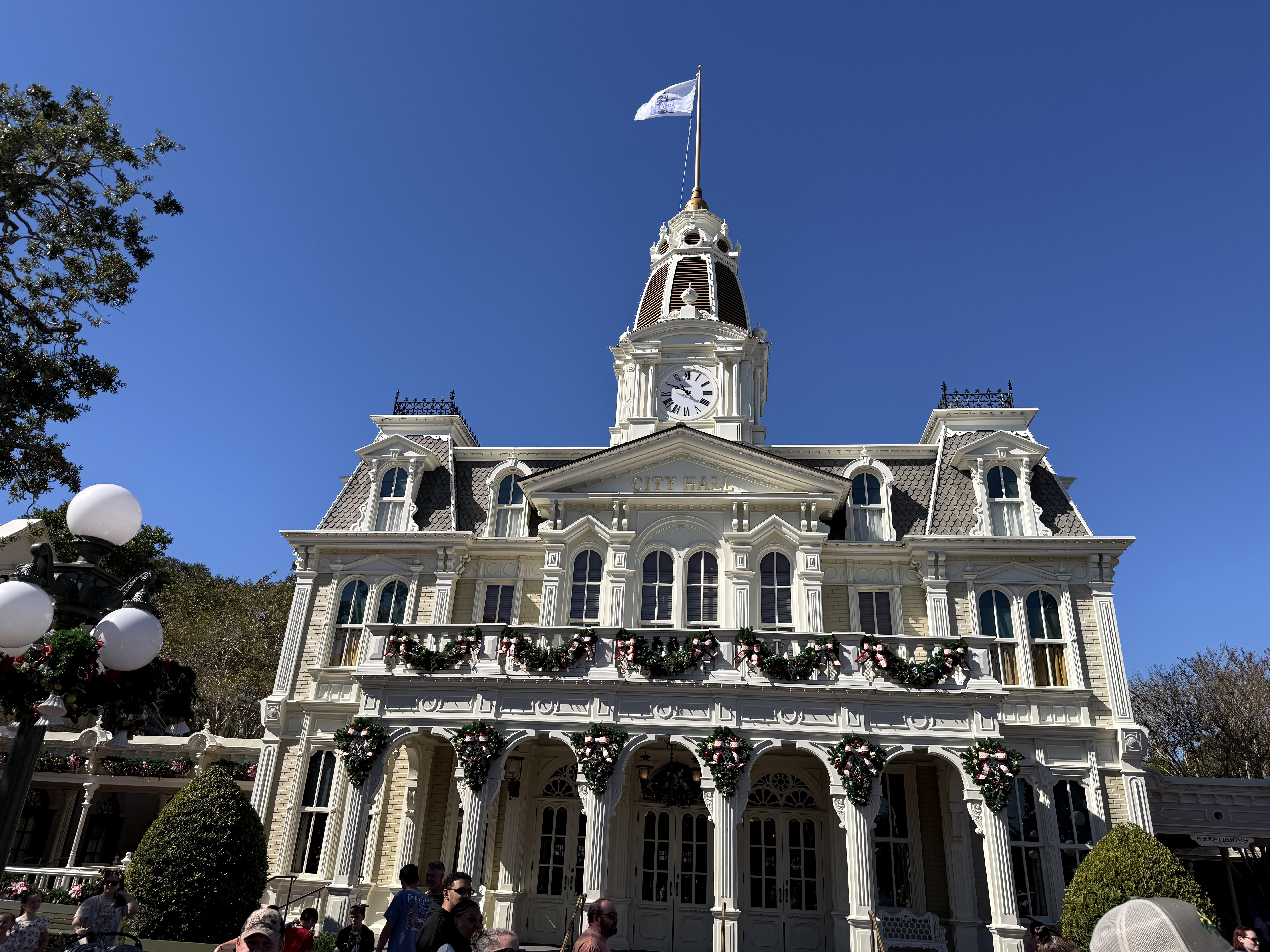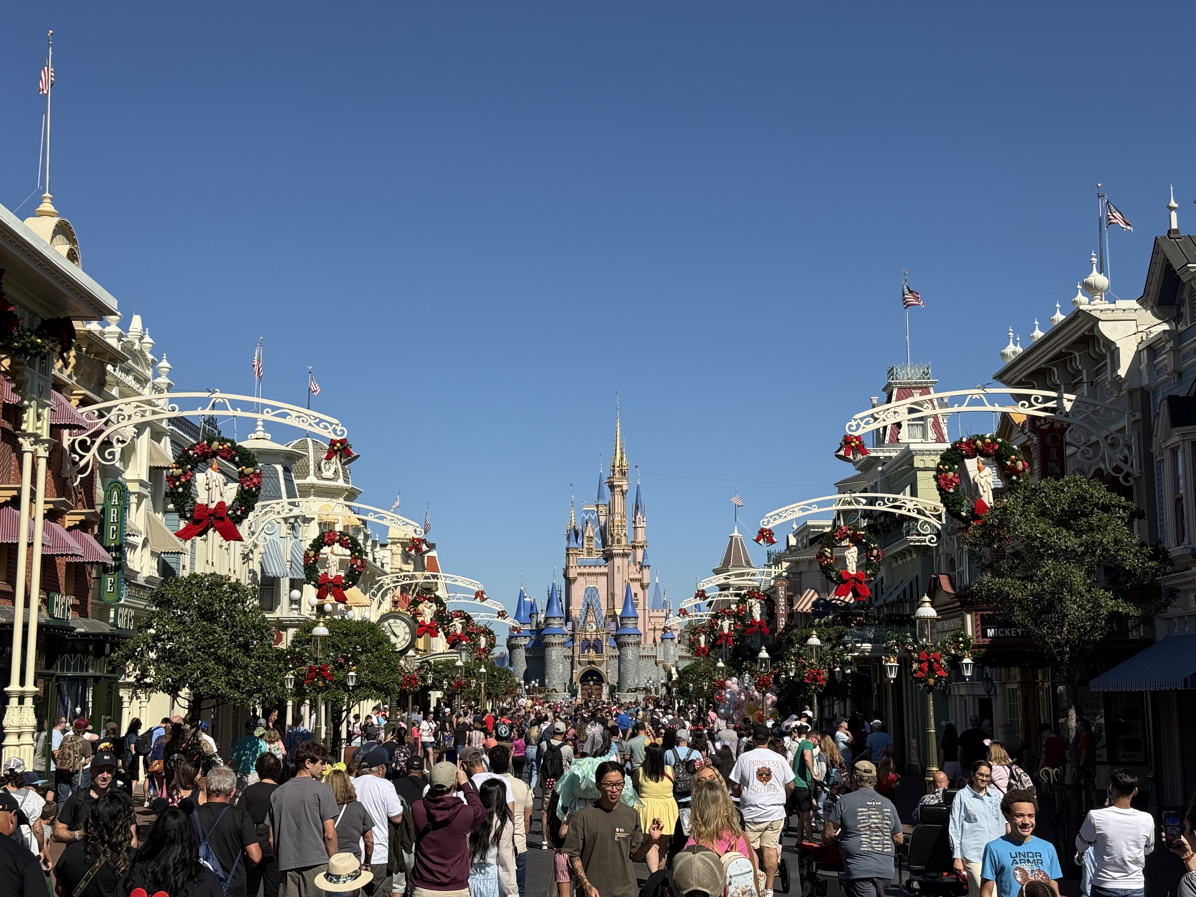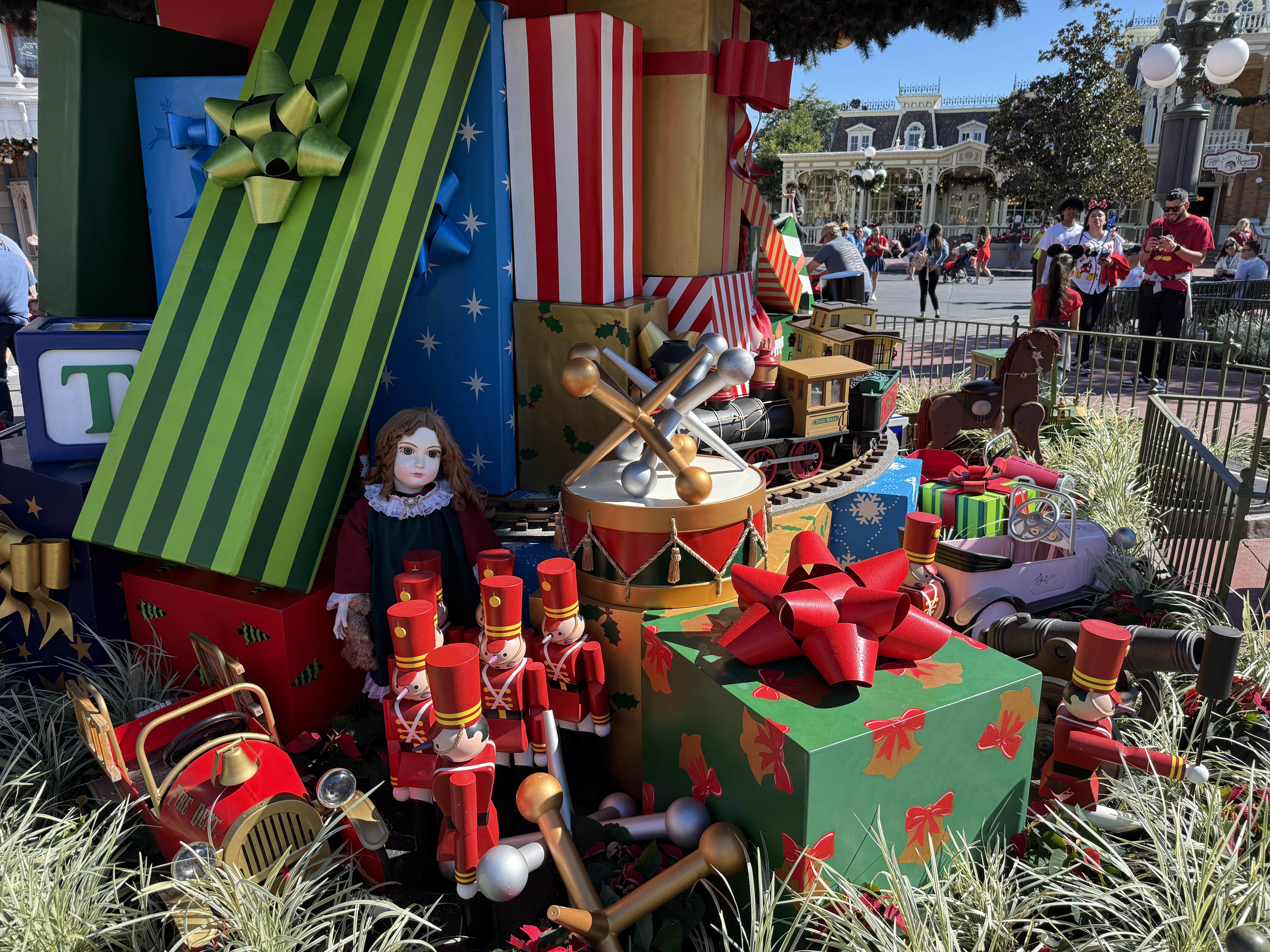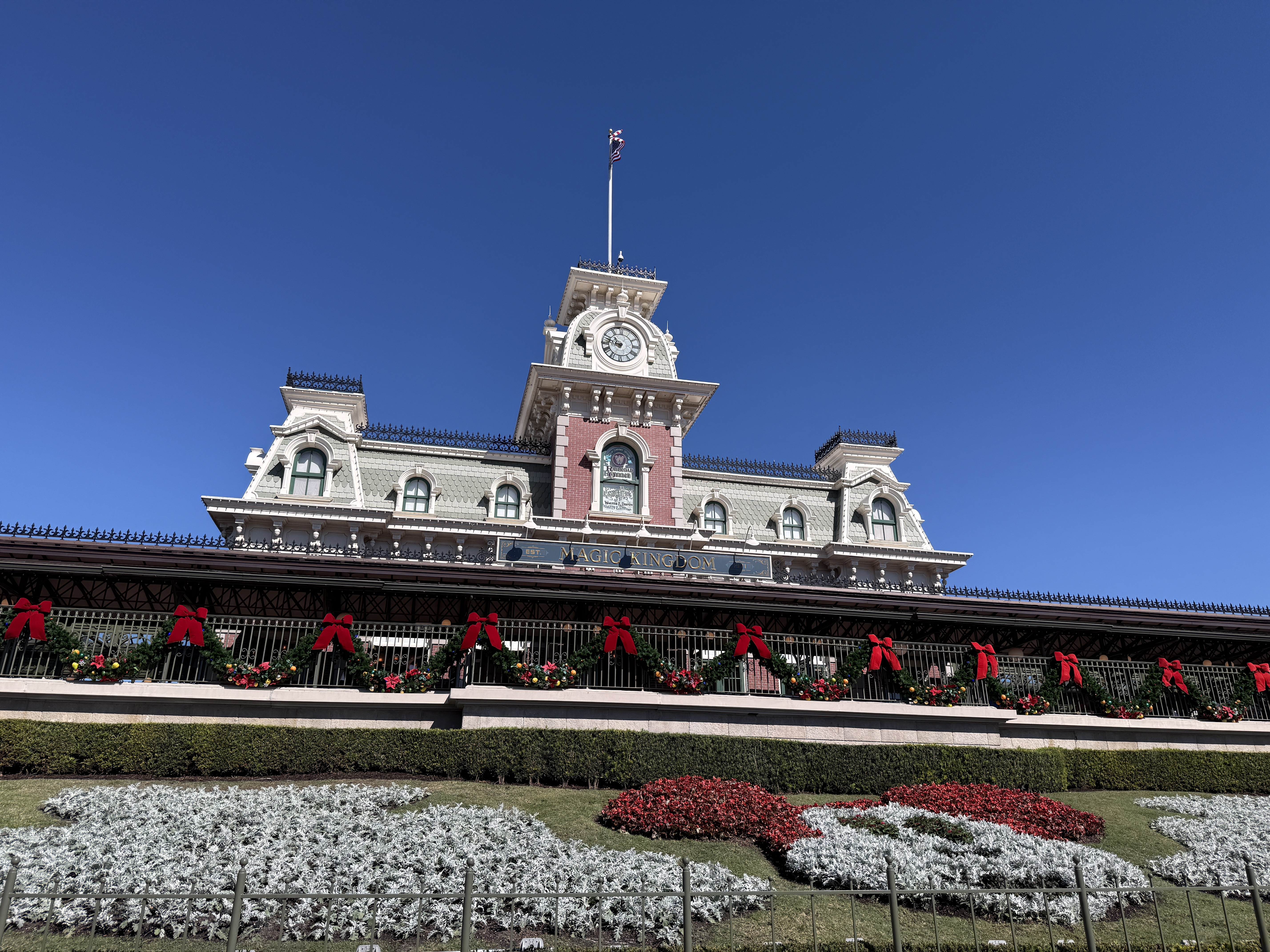 The in-process holiday makeover is clear once you enter Magic Kingdom, where a couple of winter-ready Mickey and Minnie topiaries greet you by the train station, while the station itself now boasts some decoration.