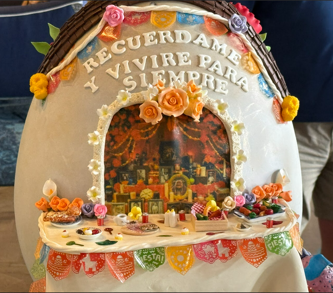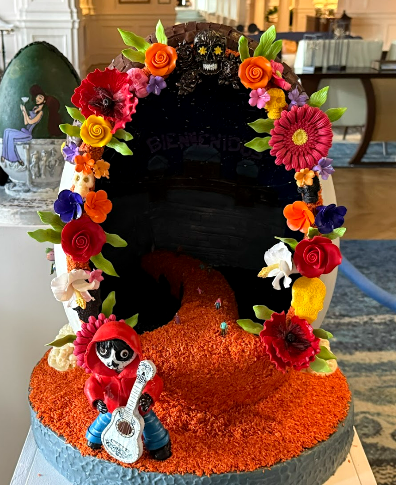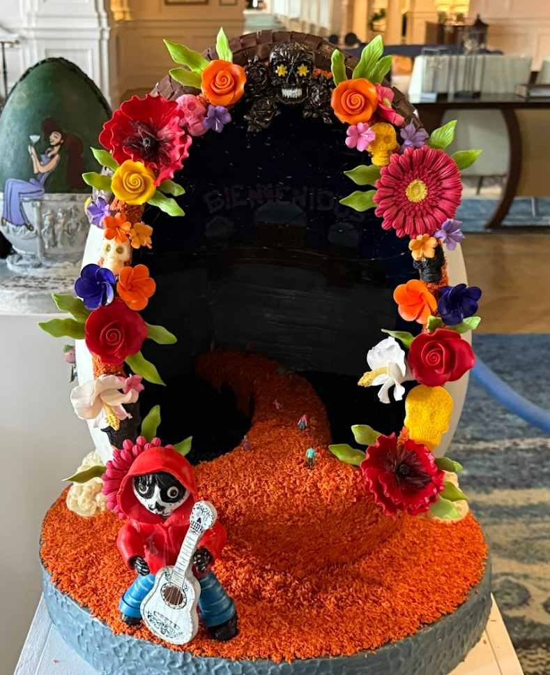 A Coco egg features the Marigold Bridge and the Land of the Dead, with Miguel posed in front.