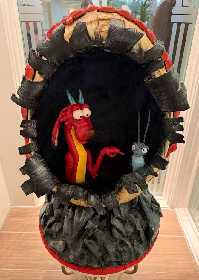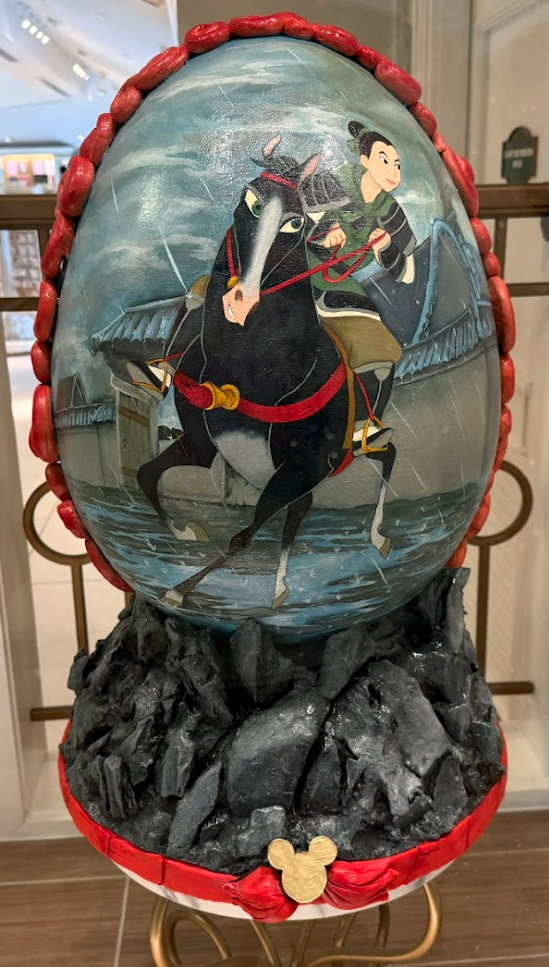 A Mulan egg features the warrior in full armor atop her horse, Khan. The back of the egg appears to have exploded open to reveal Mushu and Cri-kee inside.