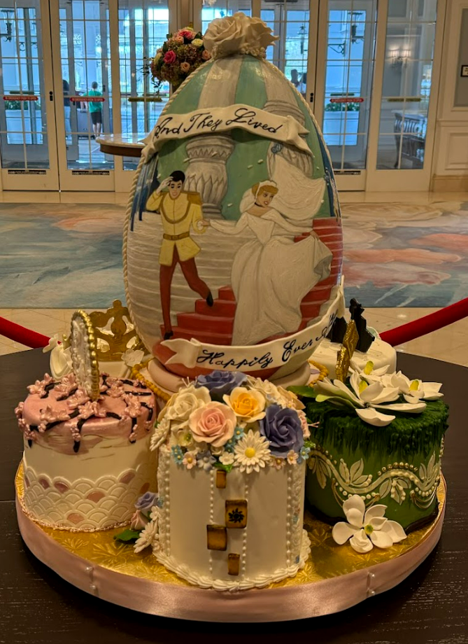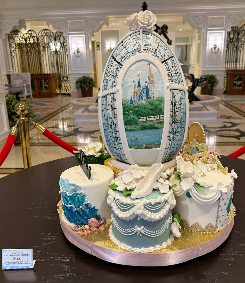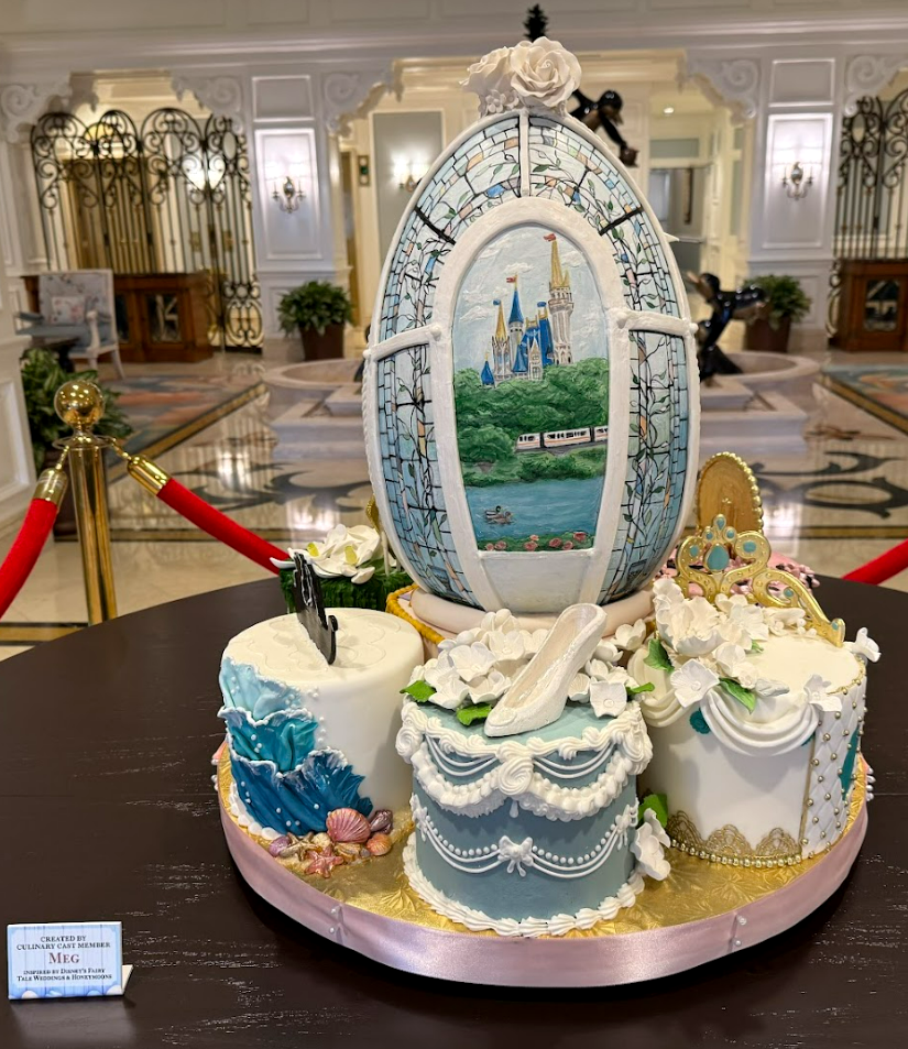 An egg inspired by Disney’s Fairy Tale Weddings & Honeymoons features an image of Cinderella and Prince Charming, surrounded by tiny princess-inspired wedding cakes featuring Rapunzel’s lanterns, Tiana's lilypads, and Cinderella’s glass slipper. The back depicts a stained glass window overlooking Cinderella Castle and a passing Monorail.