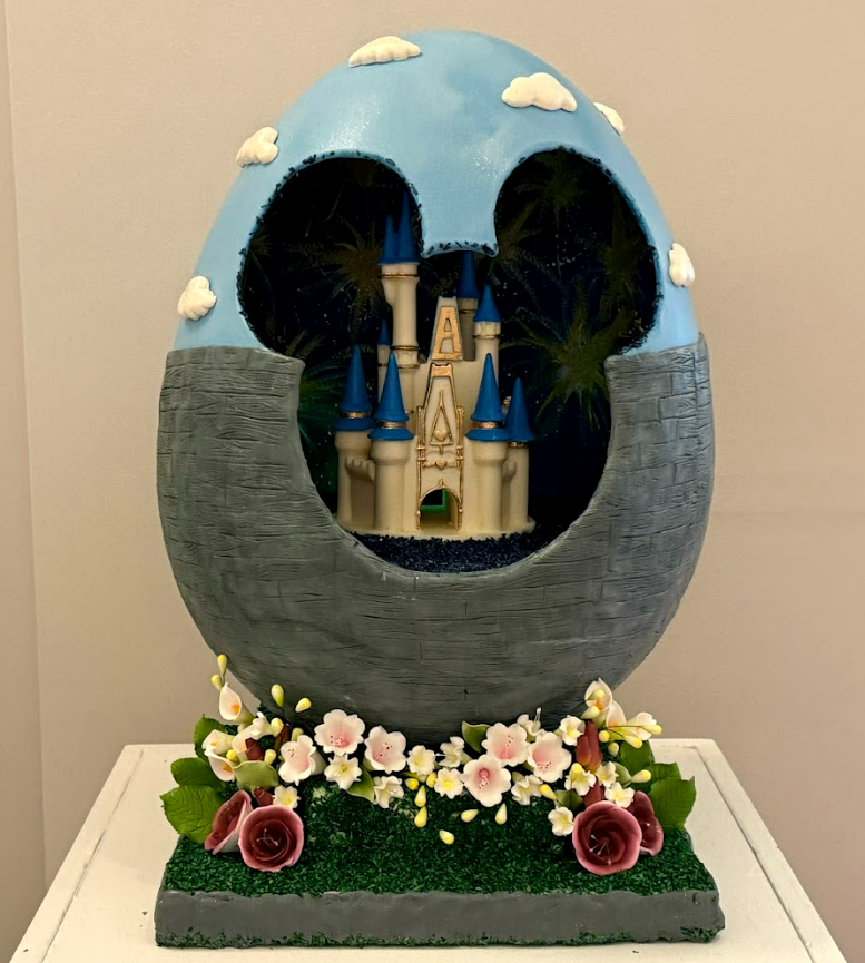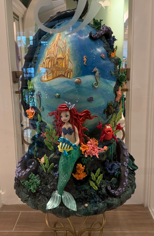 The Little Mermaid egg features a 3D sculpted fondant Ariel sitting on rocks with Flounder and Sebastian. The egg showcases King Triton’s palace on the front and Ursula’s face on the back,