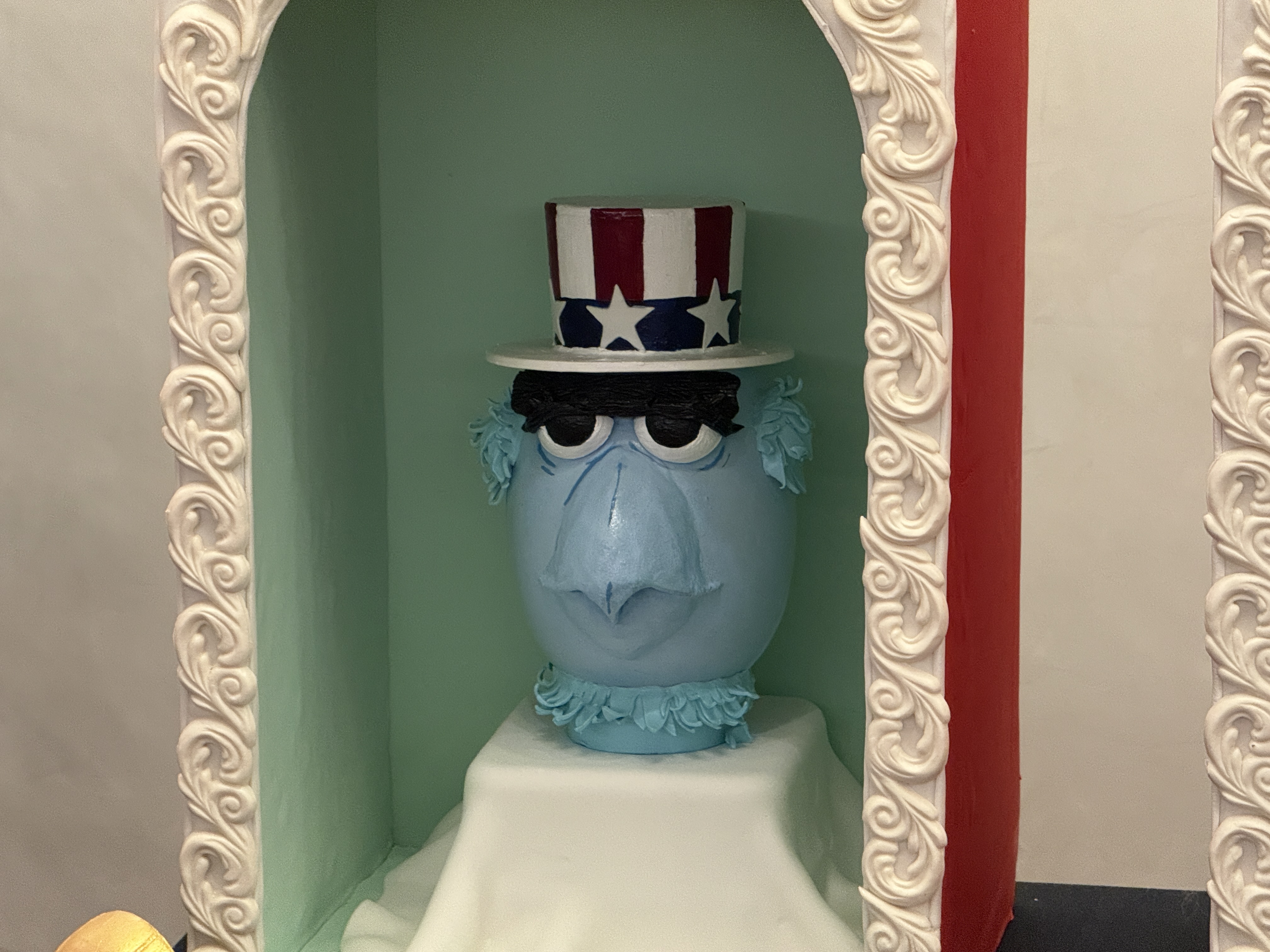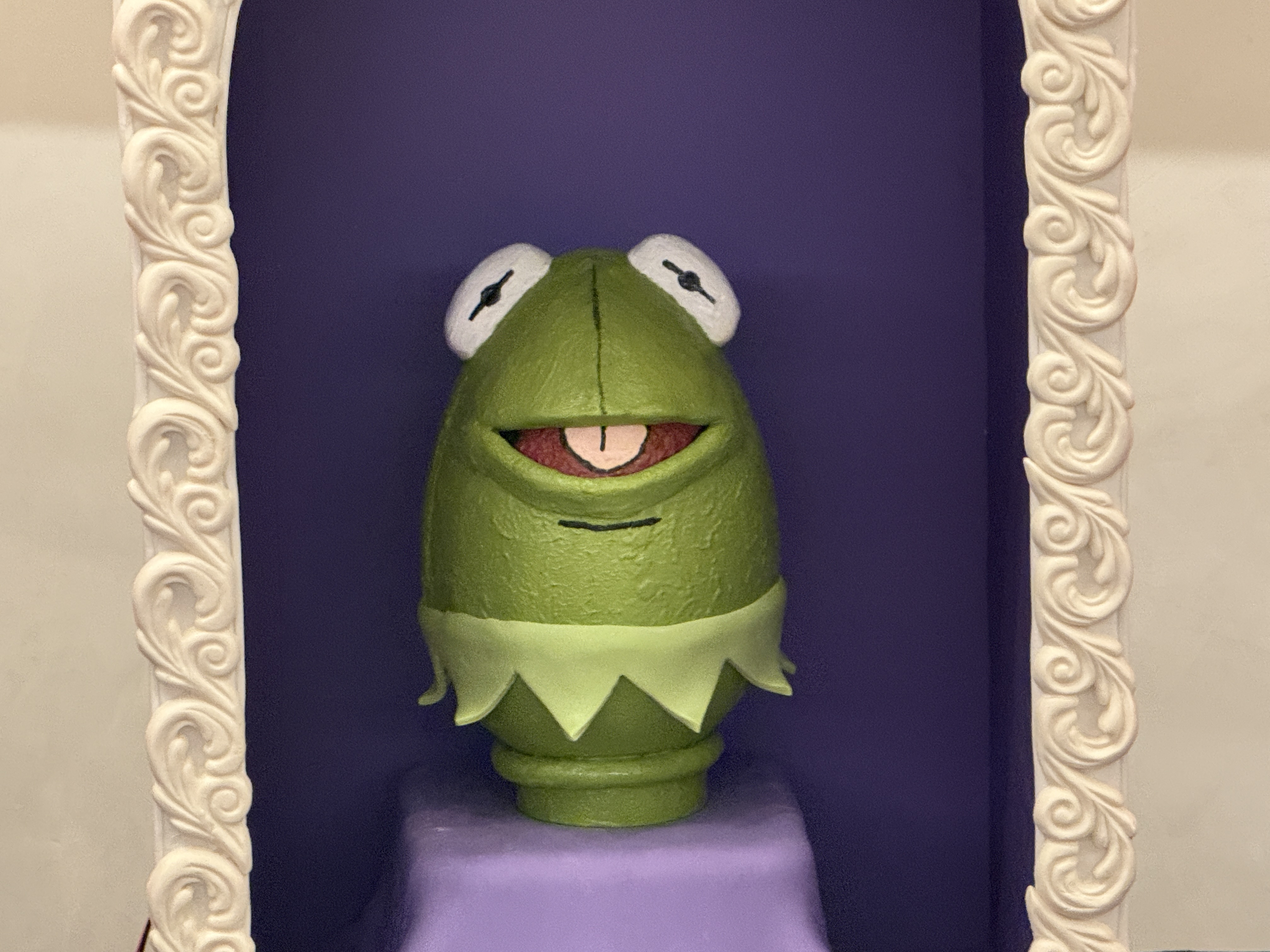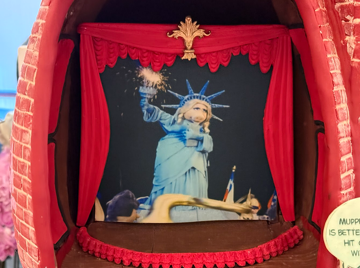 This egg is shaped like the MuppetVision 3-D building complete with the original clock tower balloon, 3-D glasses, and Statler and Waldorf's cut-out. The inside shows Miss Piggy as Lady Liberty.