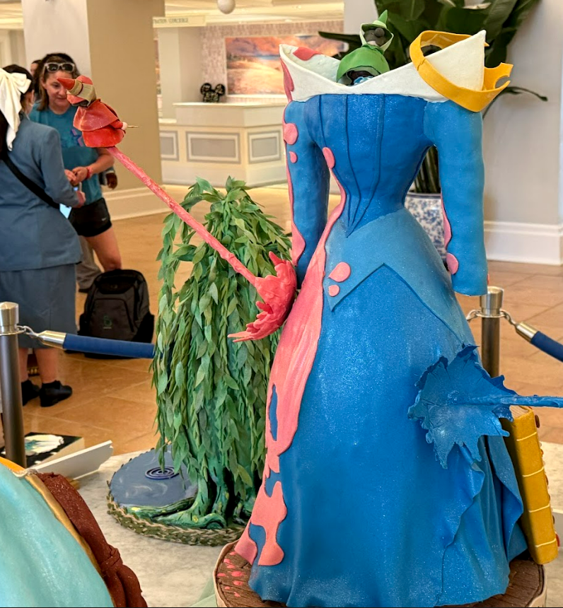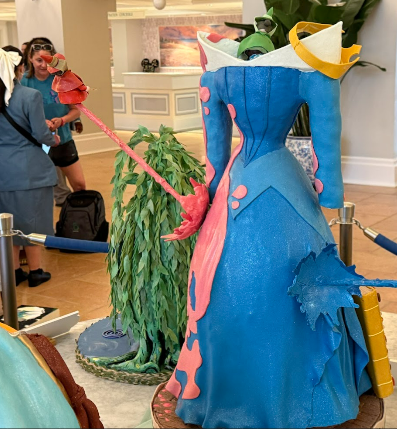 This display was inspired by Aurora’s dress from Walt Disney's Sleeping Beauty and is surrounded by Flora, Fauna, and Merriweather.
