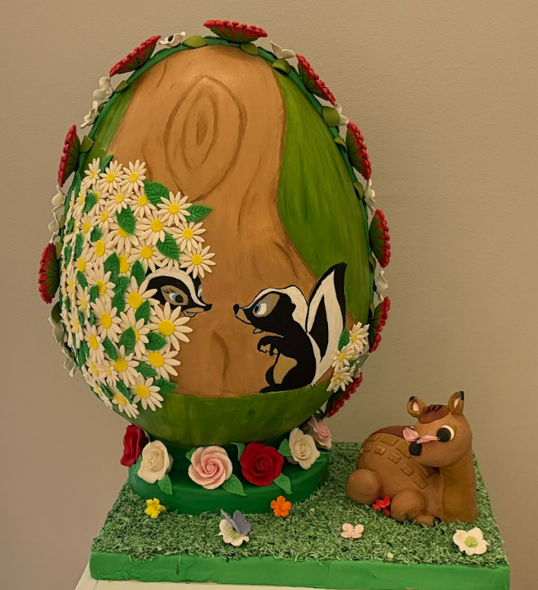 Bambi rests at the base of this egg, with a painted display of Flower meeting Petunia.