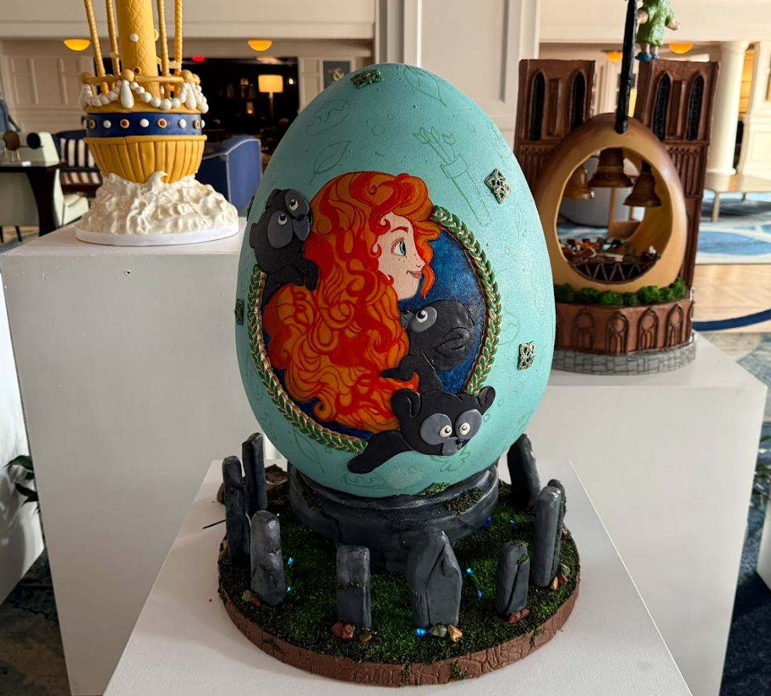 A Brave egg features Merida and her three bear-cub brothers surrounded by standing stones, with the family tapestry on the back.