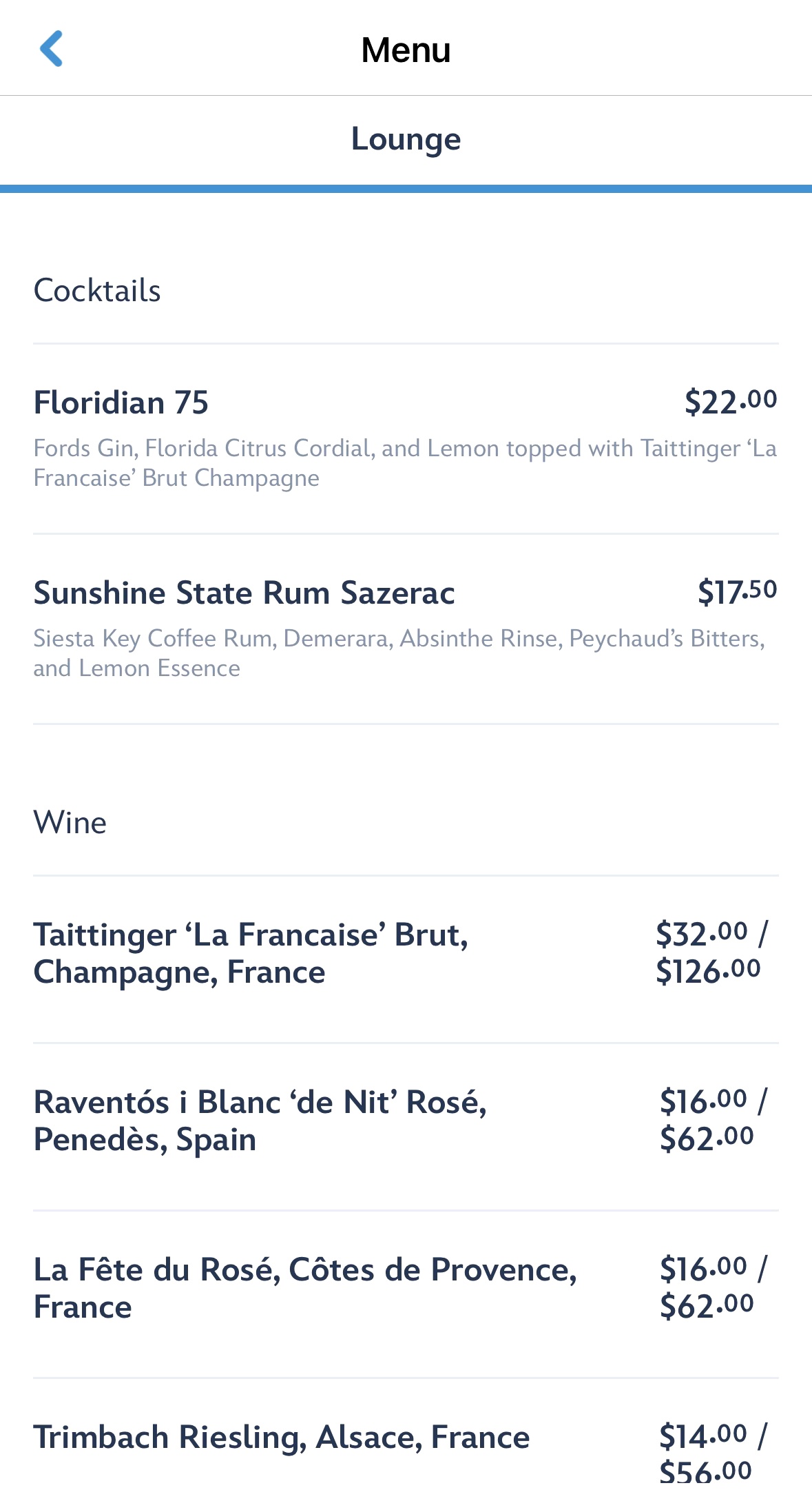- The location will feature a light menu featuring champagne, wine, beer, and two signature cocktails: the Sunshine State Rum Sazerac and the Floridian 75. For a refreshing non-alcoholic option, the Blueberry and Basil Iced Tea is a blend of lemon, blueberry, and basil tea.