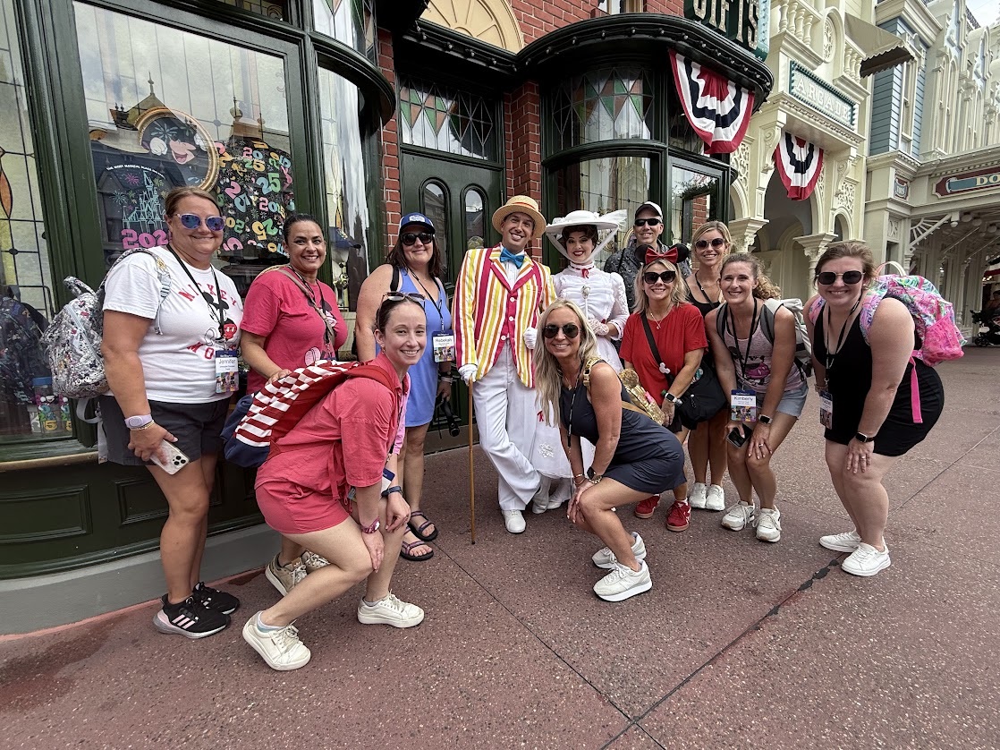 After riding Seven Dwarfs Mine Train, our VIP time was coming to a close. Jessica walked us through the hub in front of Cinderella Caste and took some photos of us (and with us). Following our photo moments, Jessica took us down Main Street to visit the VIP Tour merchandise counter - an opportunity that is only available to folks who take a VIP tour. But more on that in a minute, because we experienced one last piece of Disney magic while walking down Main Street. To our surprise and delight, we were met by Mary Poppins and Bert the chimney sweep, who were completely content to take some “cheeky" photos with our group. Being a huge fan of Mary Poppins, this filled my Disney cup to overflowing! This character greeting isn’t guaranteed, but many times the VIP guides have ways of making magical moments like this happen.