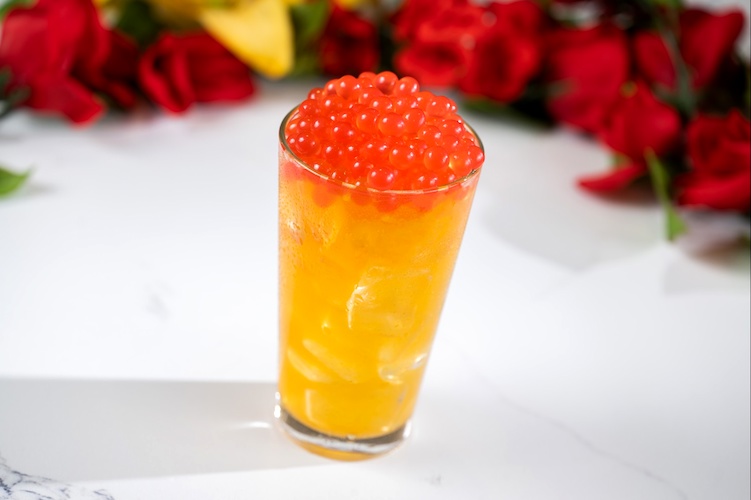 Cranberry and Minute Maid Passion Fruit Orange Guava Juice topped with yellow shimmer and strawberry boba pearls.