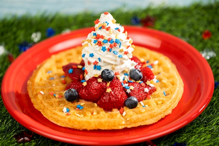 - Red, White and Blue Waffle: Waffle topped with mixed berries, vanilla ice cream, whipped cream, and festive sprinkles. Available at Sleepy Hollow in Magic Kingdom.