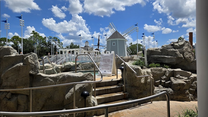 We were able to walk through the area today and take some photos of the newly refreshed area, with guests enjoying the pools and slides of Stormalong Bay once again. Areas of the complex, including the grotto hot tubs, are blocked by A-frames saying that these areas are not available at this time. Other construction work is currently taking place on the Beach Club side of the pool, with construction walls extending beyond the pool area and into the great lawn leading up to the lobby doors. As such, interior corridors that previously allowed access to this area are blocked off and locked as well.