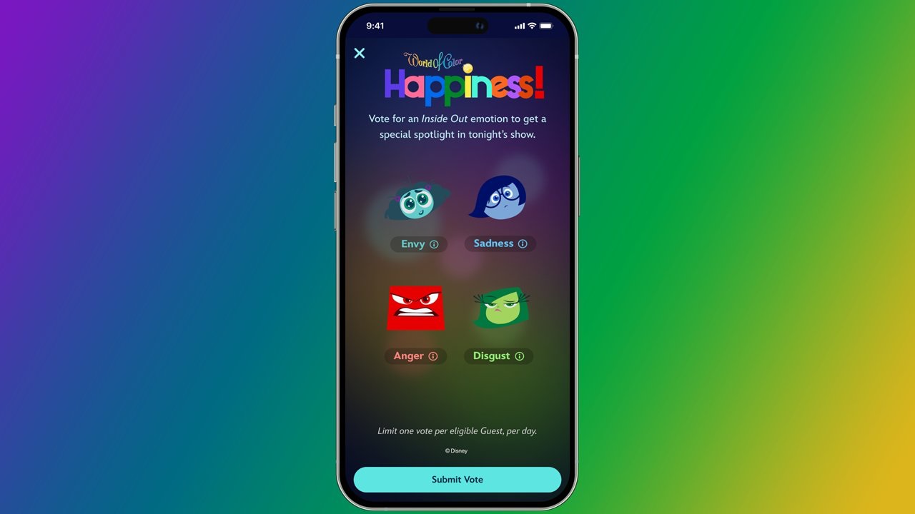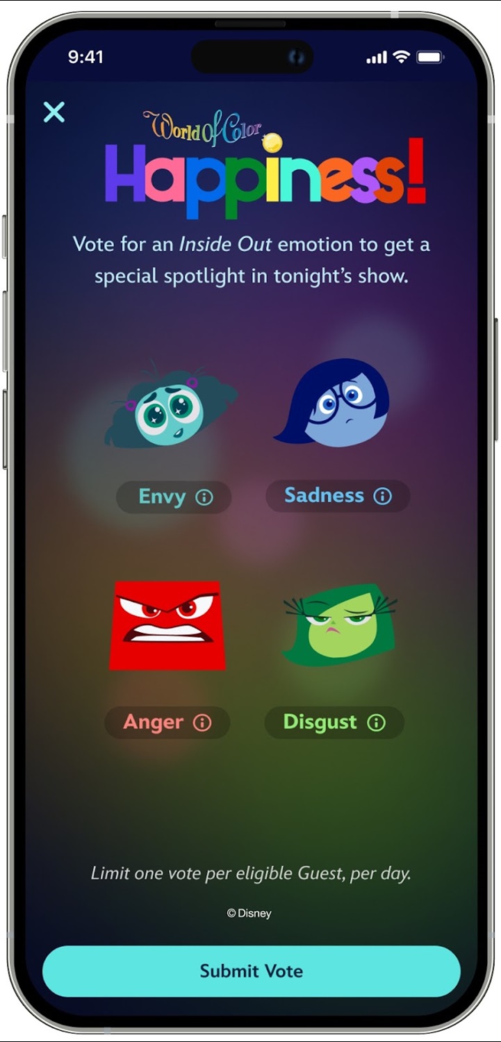 - Prior to the first show each night, Disney California Adventure park guests are invited to vote on the Disneyland app for one of four different Emotions from Inside Out — Sadness, Anger, Disgust or Envy — to see them featured in special scenes throughout both of that day’s shows.