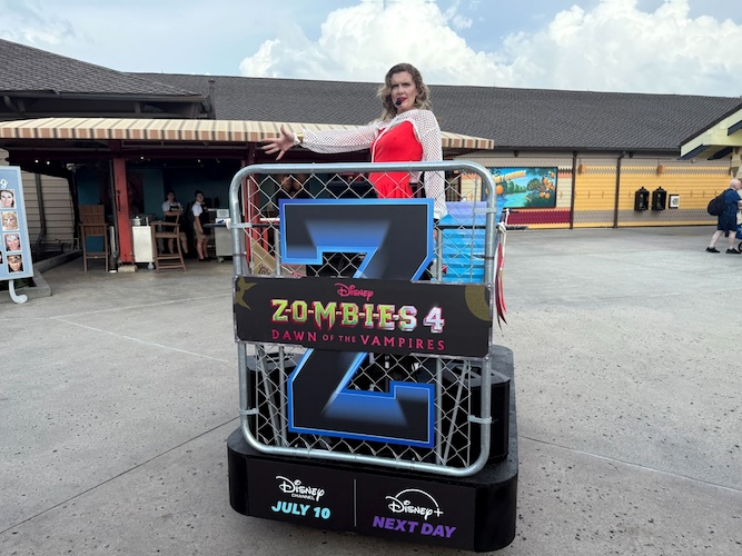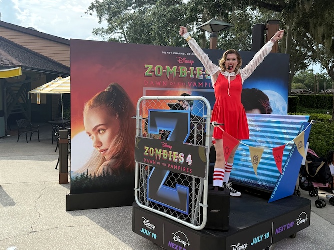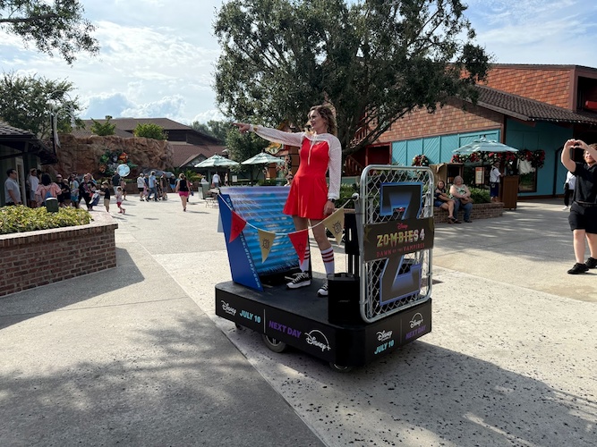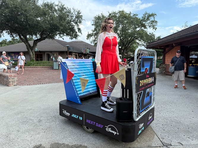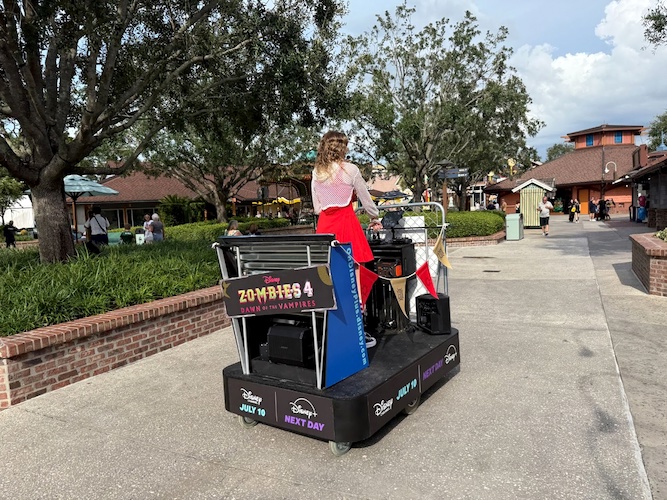 Disney Springs is celebrating as the fourth installment in the ZOMBIES franchise gets ready to make its debut on Disney Channel this Friday, July 11th. Similar to previous promotional experiences, this ZOMBIES activation features a DJ on a moving platform, dressed as a cheerleader and making jokes while traveling through Disney Springs.