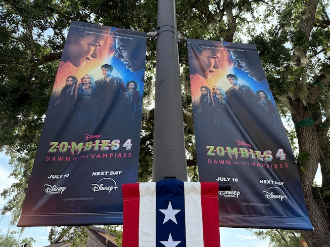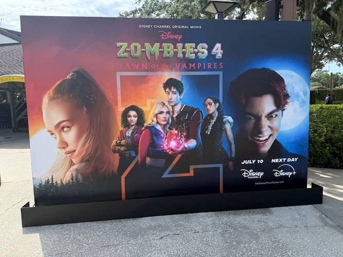 The moving platform advertises ZOMBIES 4: Dawn of the Vampires, which makes its Disney Channel premiere on Friday, and will be streaming on Disney+ the next day.