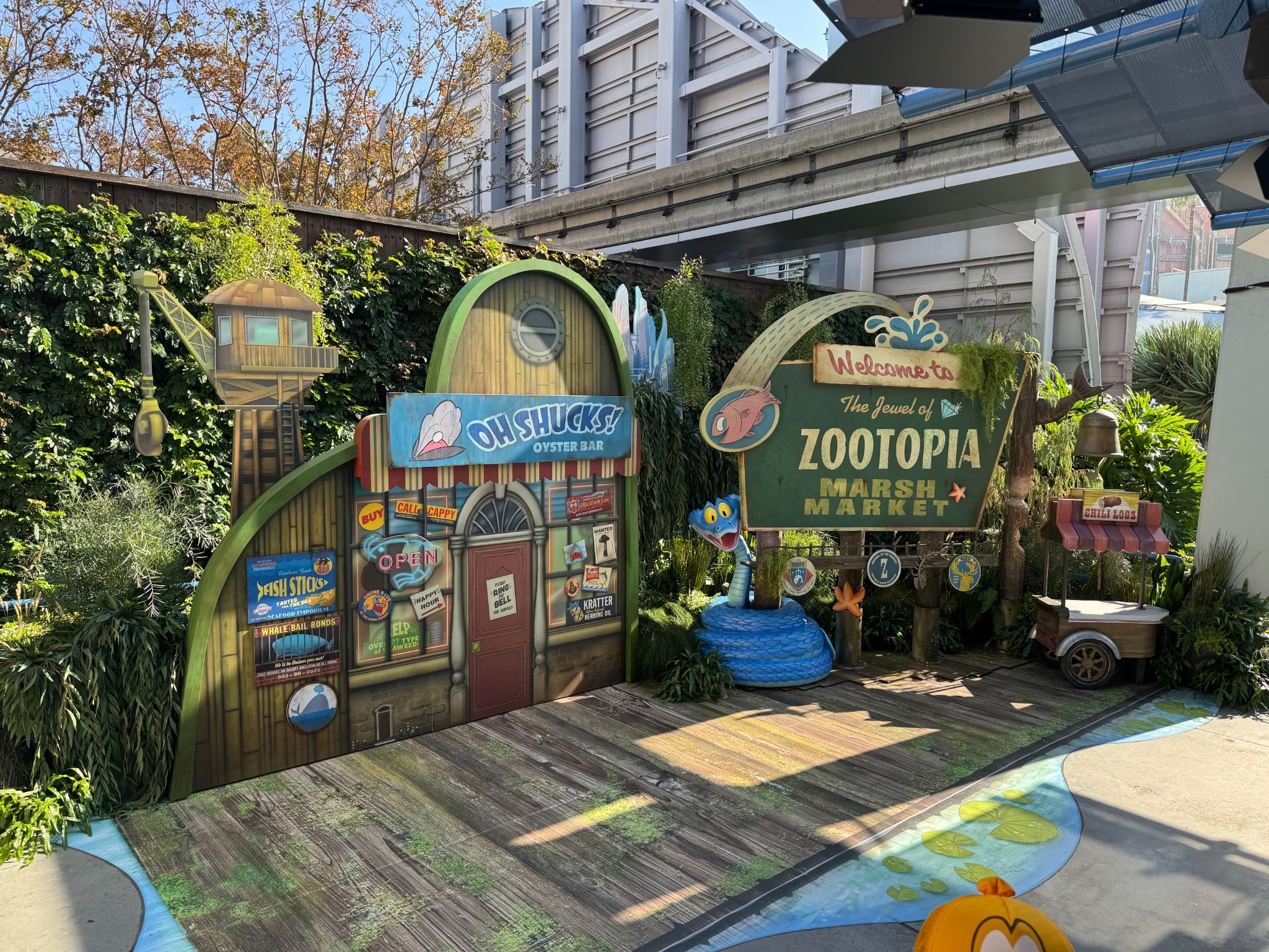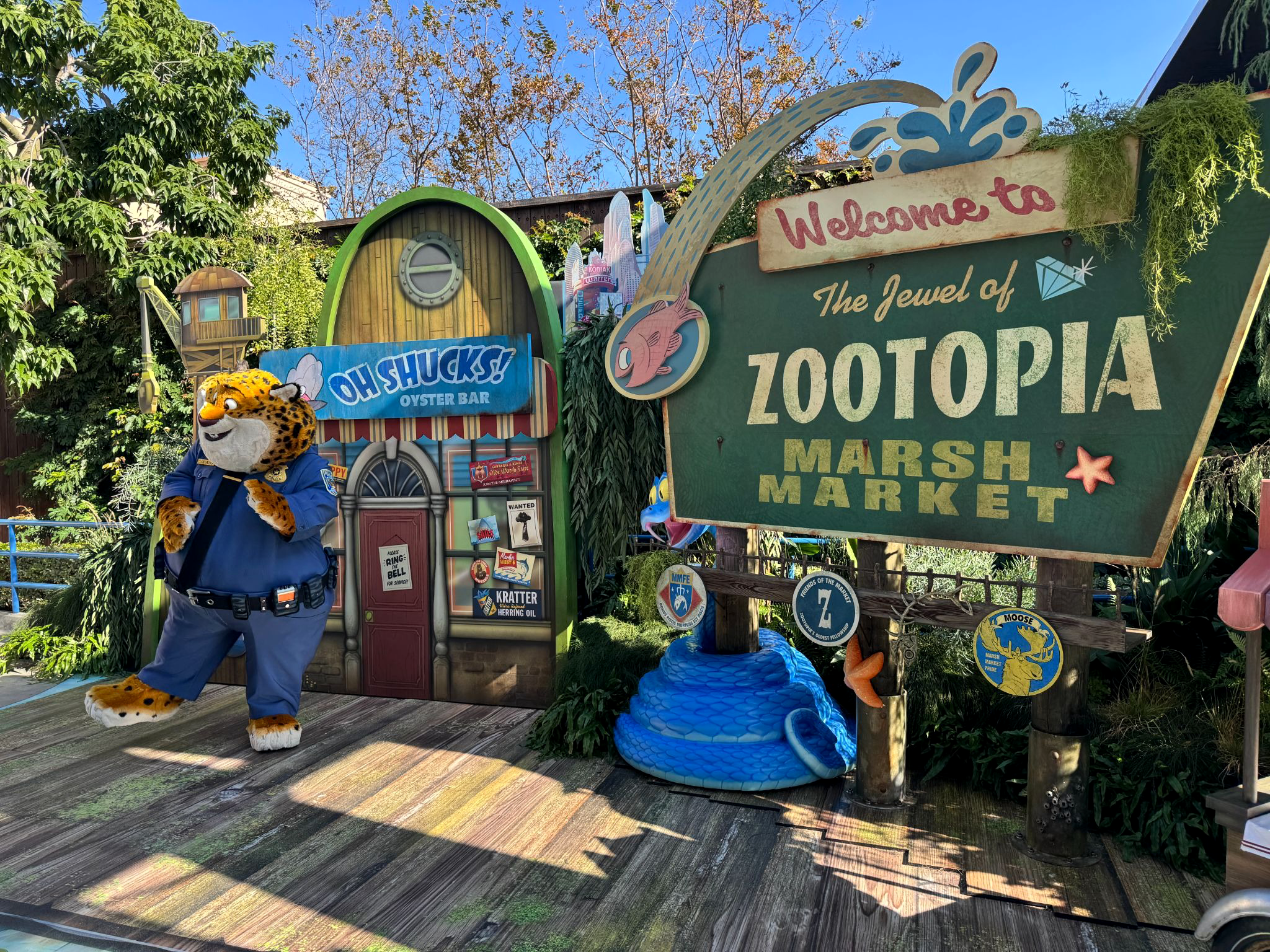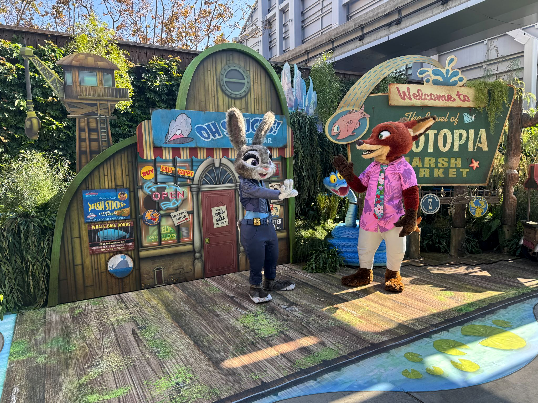 The meet and greet set look slike the facade of the Marsh Market and even features a statue of Gary De’Snake. Formerly, Nick Wilde and Judy Hopps were meeting out on the pathway between Grizzly River Run and Ariel’s Undersea Adventure, so it’s nice to see them meet in their very own themed area.