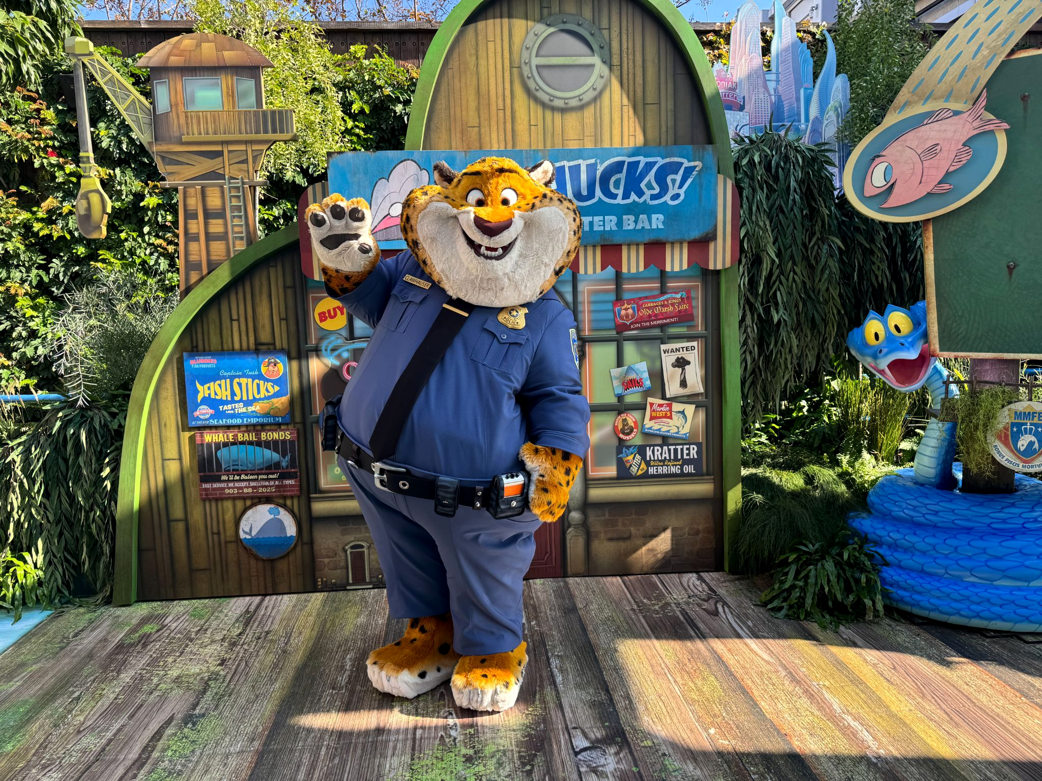 For the first time ever in the parks, Officer Clawhauser is meeting guests in person. Guests can spot him greeting fans with his signature enthusiasm. With his vibrant uniform, bright smile, and love for all things pop culture, he brings the heart (and humor) of the ZPD straight into the park.