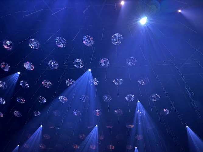 A standout aspect of the production is how the stage visuals blend with the arena itself. The ABBA Arena is designed not just as a venue but as part of the visual storytelling. Elements from the ceiling—including strings of light, rotating mirrors, and precise spotlights—lower or activate in sync with moments on the screen, expanding the perceived space and enhancing depth. These lighting effects often feel like they're emerging from or reacting to what's seen on stage, creating a seamless illusion between the real and the digital.