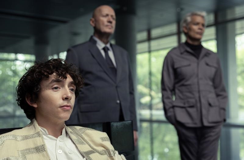 Yutani (Sandra Yi Sencindiver) sits at the end of a long table, accompanied by her right-hand man Tanaka (Byron Bishop) and cyborg Morrow (Babou Ceesay). At the center of the table is a moderator for The Five, Barrister MacAfee (Andre Flynn), and they wait quietly for the remaining party to arrive. The door opens, and a barefoot Boy Kavalier (Samuel Blenkin) finally appears, followed by Atom Eins and Kirsh. Kavalier puts his feet up on the table as the moderator calls for cordiality during this business meeting.
