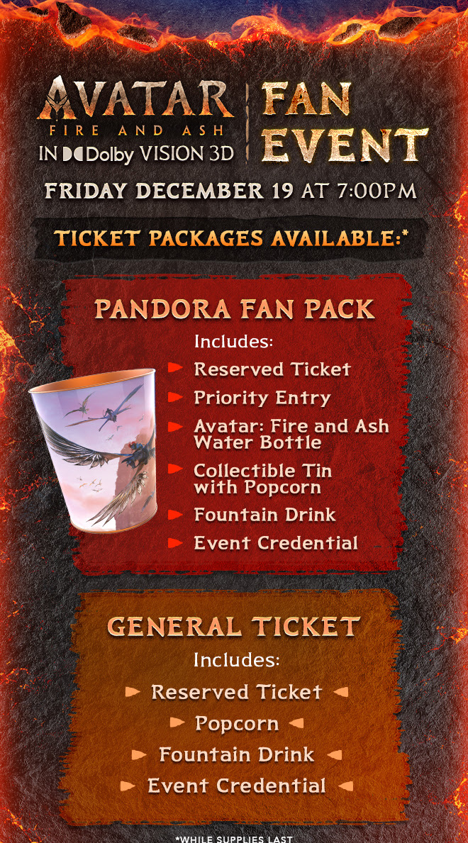 - On Friday, December 19 at 7:00pm, the Avatar: Fire and Ash 3D Fan Event will be held at the El Capitan. There are are two tiers of tickets available.
