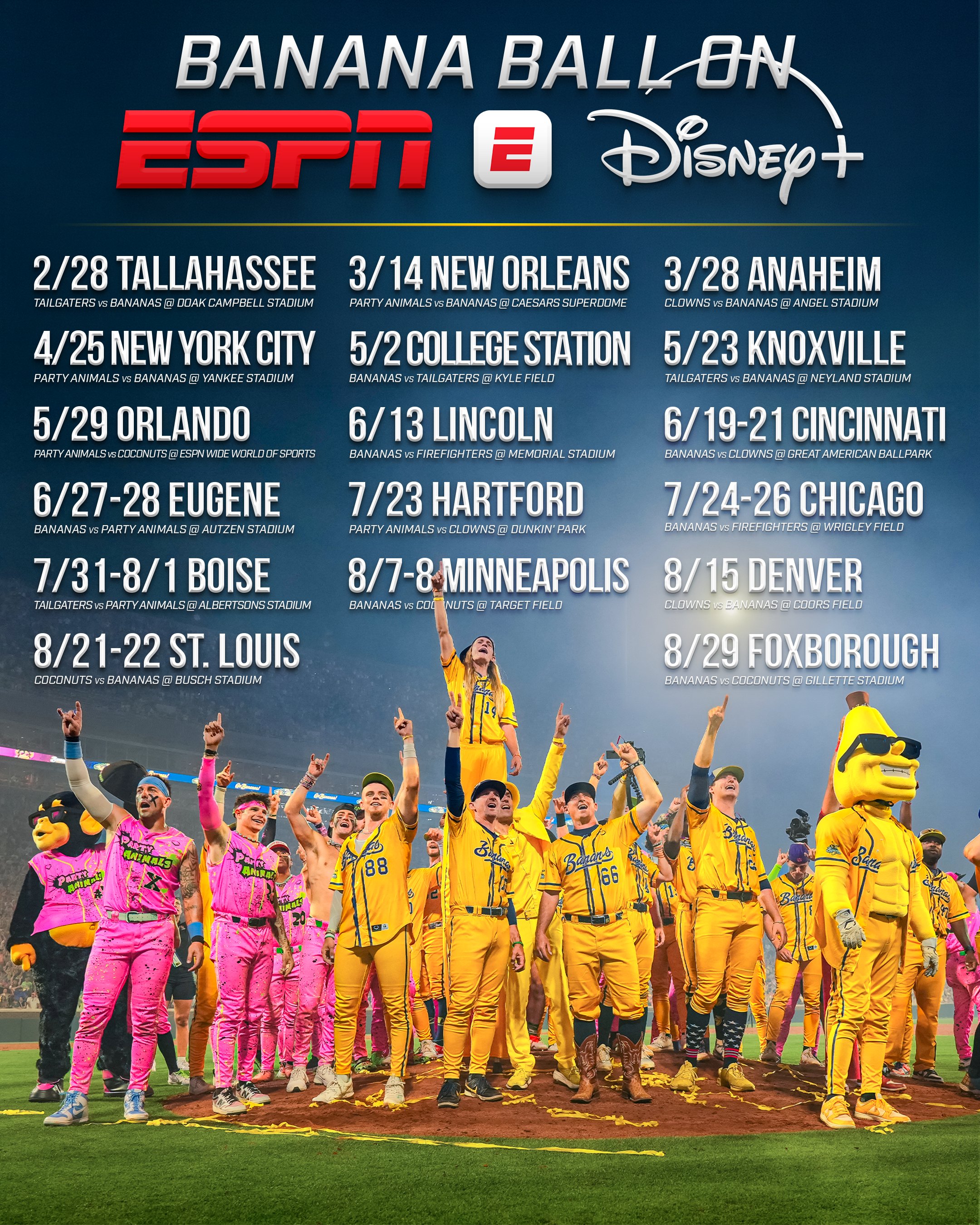 - Brent Colborne, Vice President of ESPN Programming Content & Strategy: “This expanded agreement reflects the incredible growth and fan demand surrounding Banana Ball. From iconic football stadiums to classic ballparks, these events showcase the energy and creativity fans love, delivered with the full reach and flexibility of ESPN, Disney+, and ABC.”
